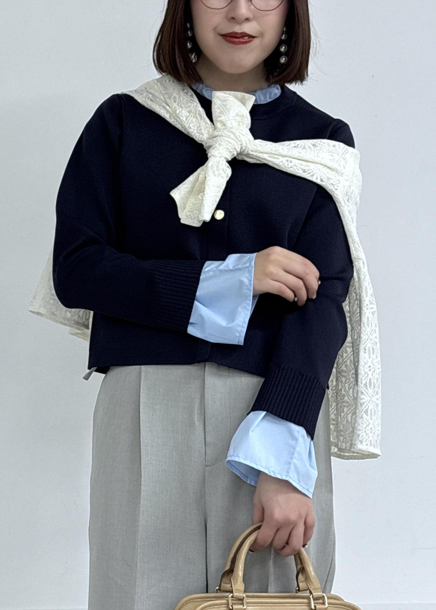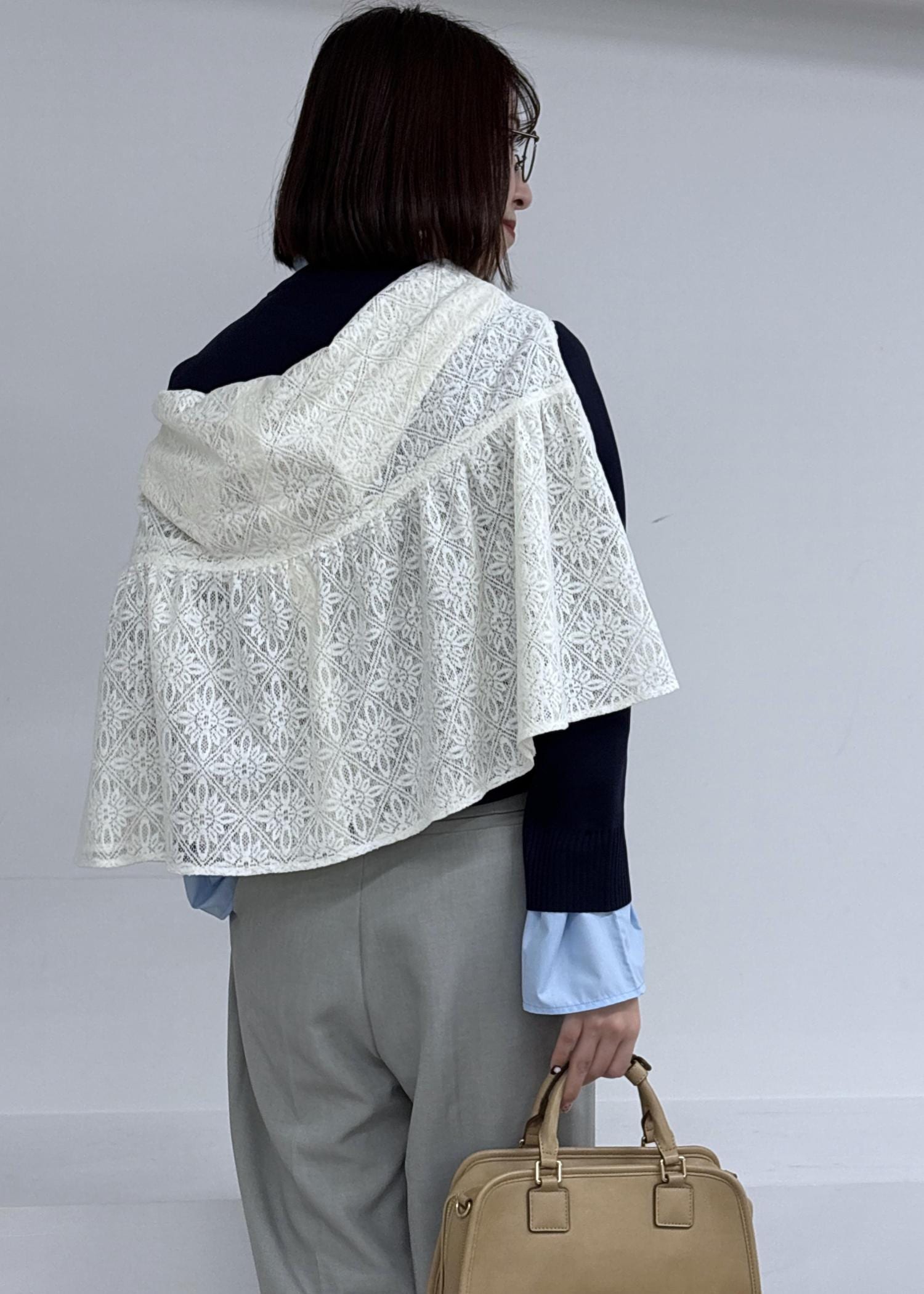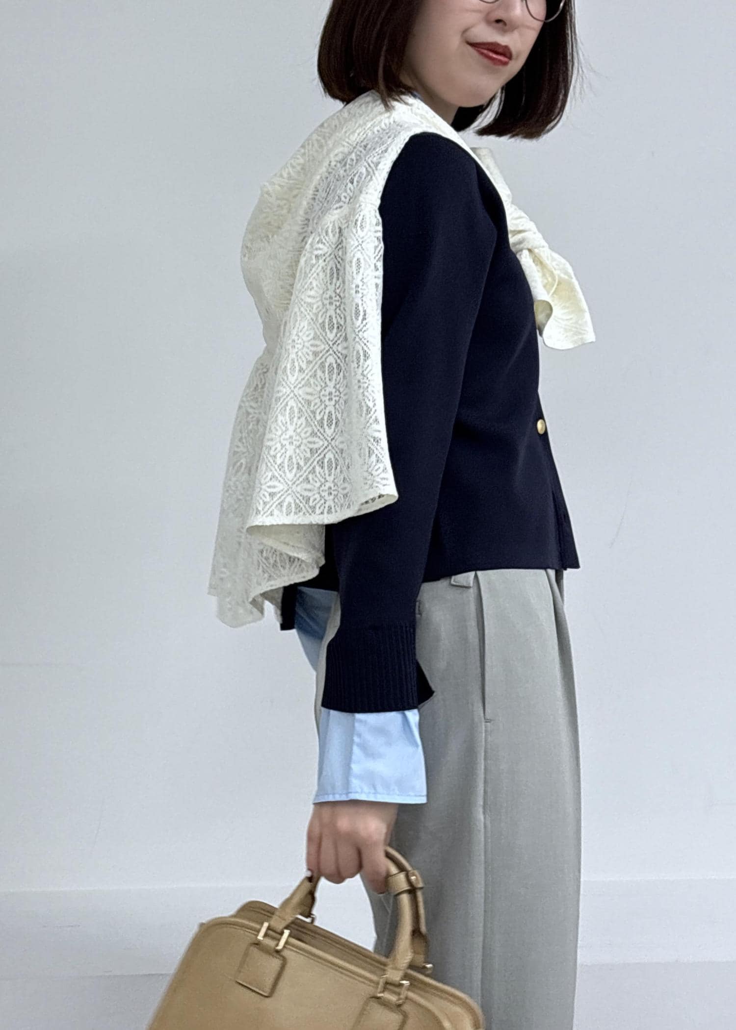 ネイビーにコーデのアクセントにもなるレースブラウスを肩掛けしてオシャレ見えに。