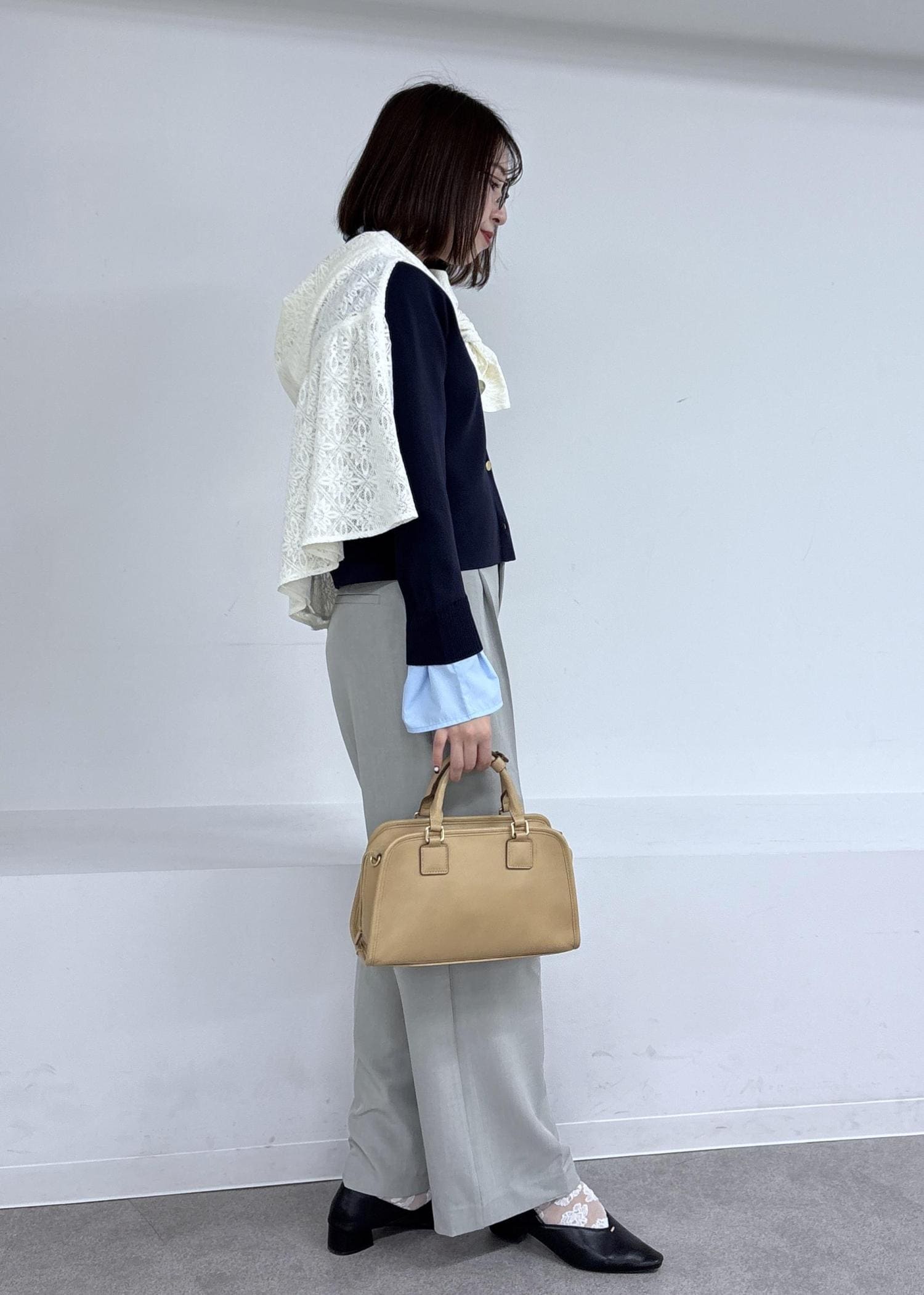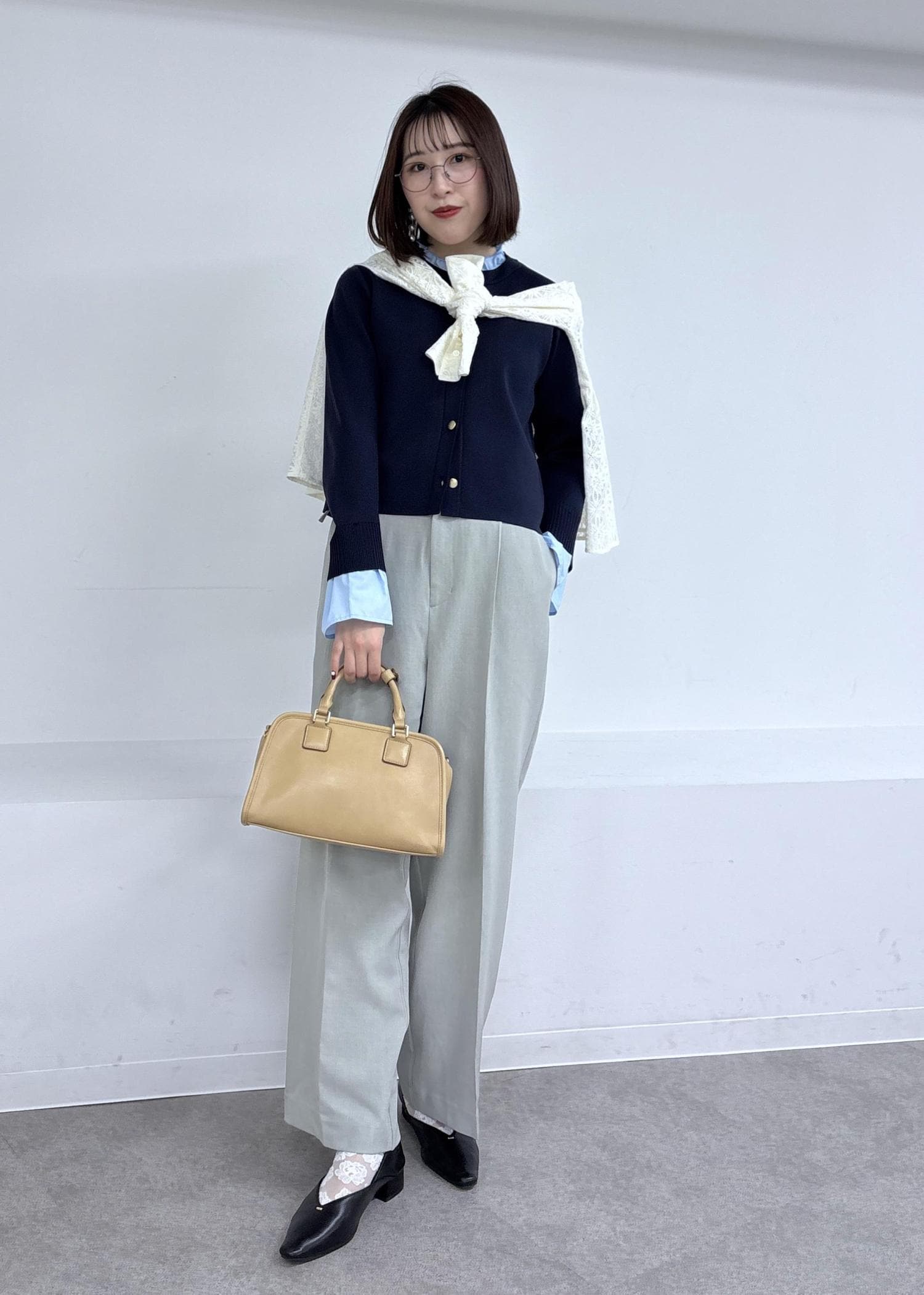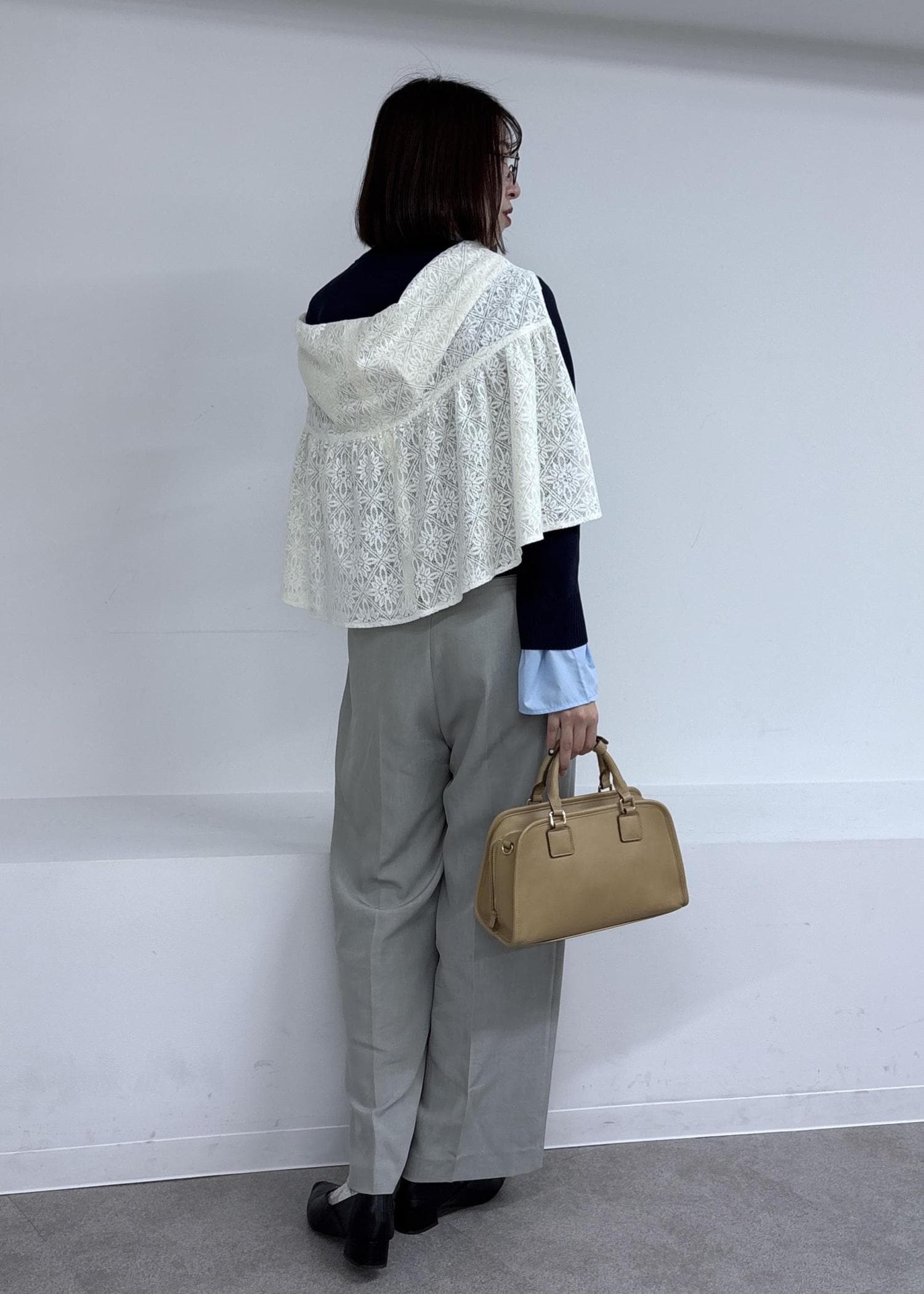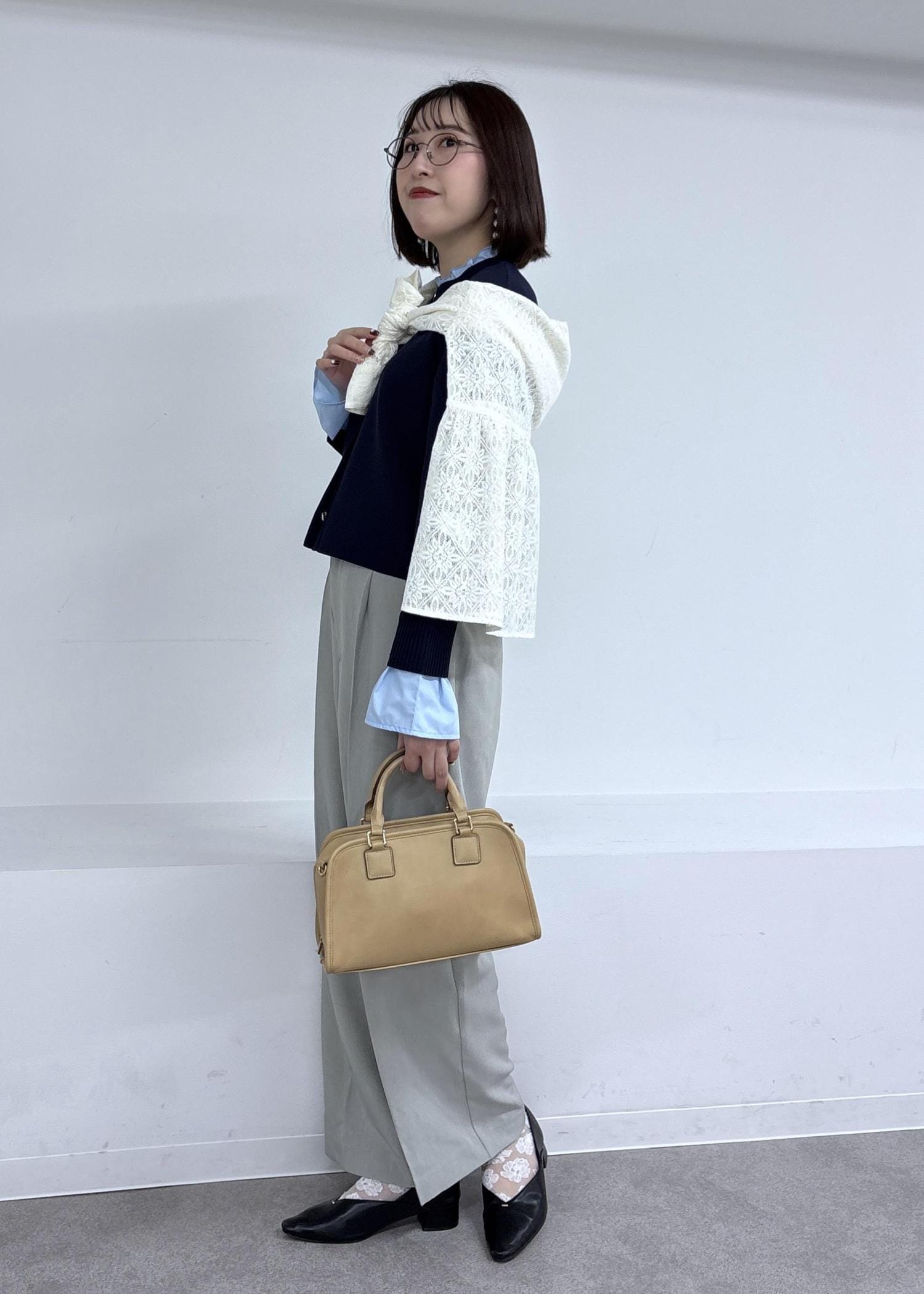 ネイビーにコーデのアクセントにもなるレースブラウスを肩掛けしてオシャレ見えに。