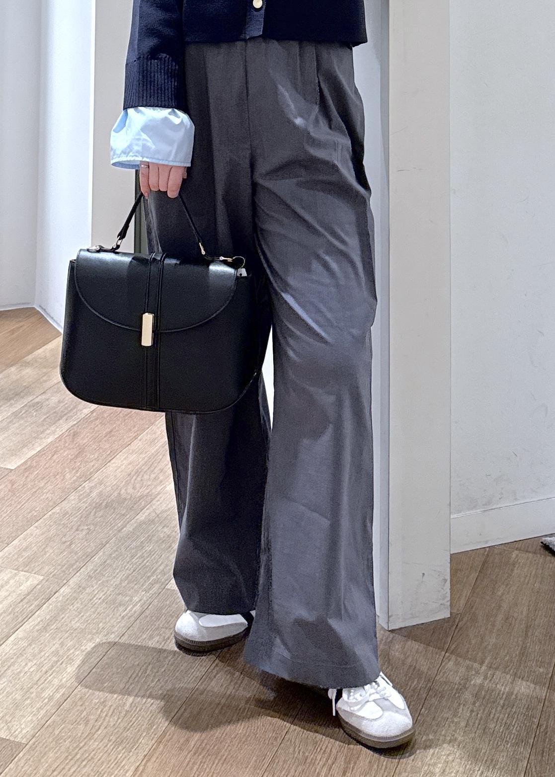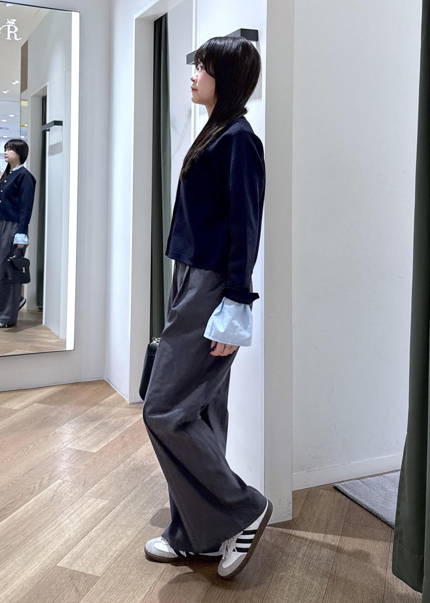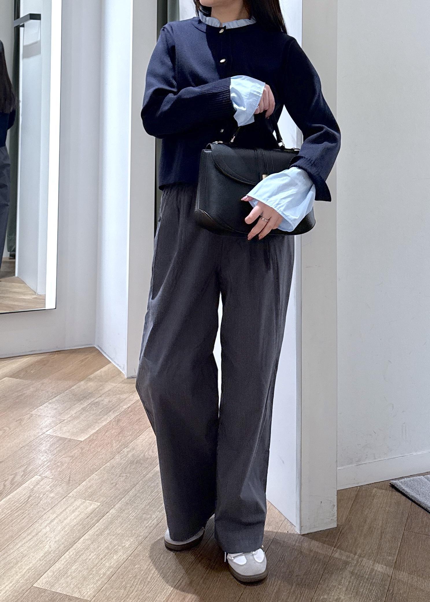 パンツはウエストがゴムで、脚のラインを拾わないため楽ちんな着心地でリラックス感があります。