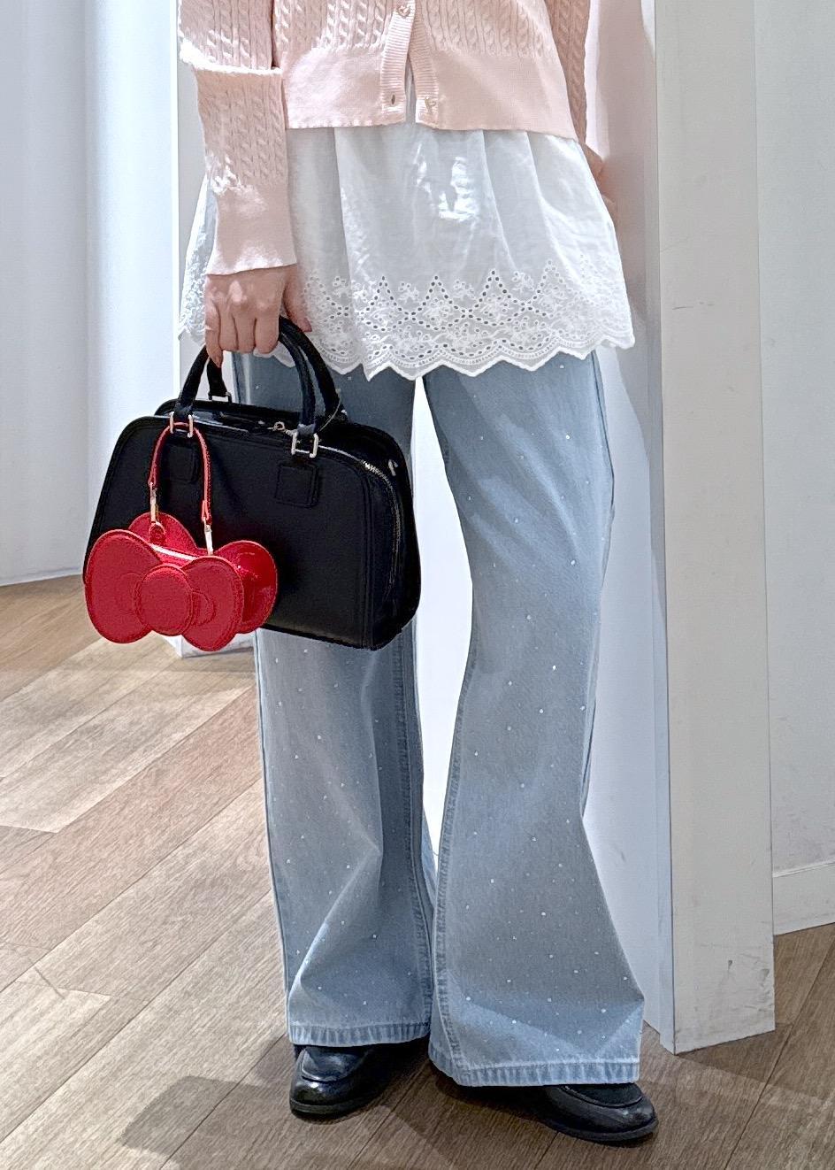 赤のハローキティリボン型ミニバッグがコーディネートの差し色になります。