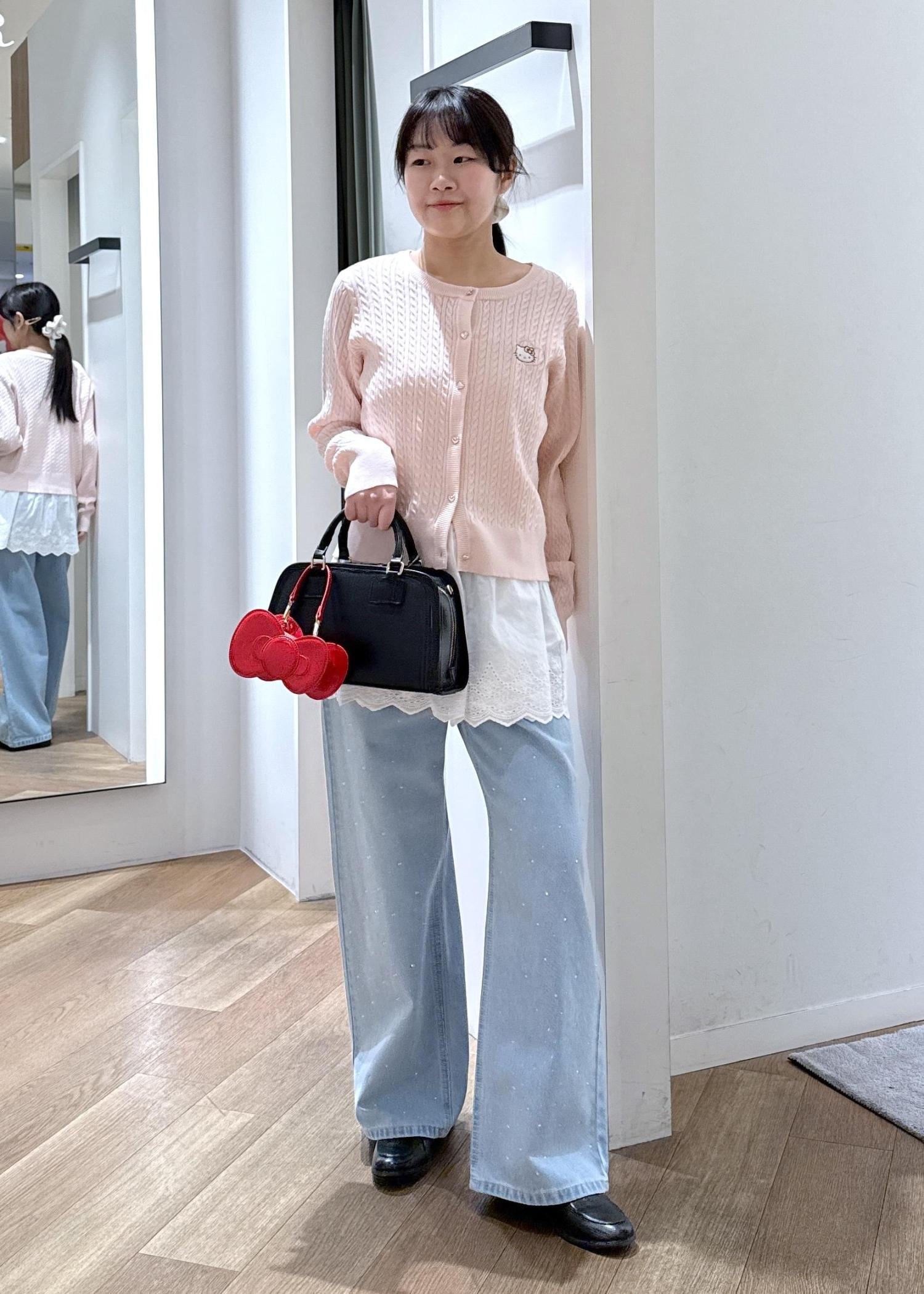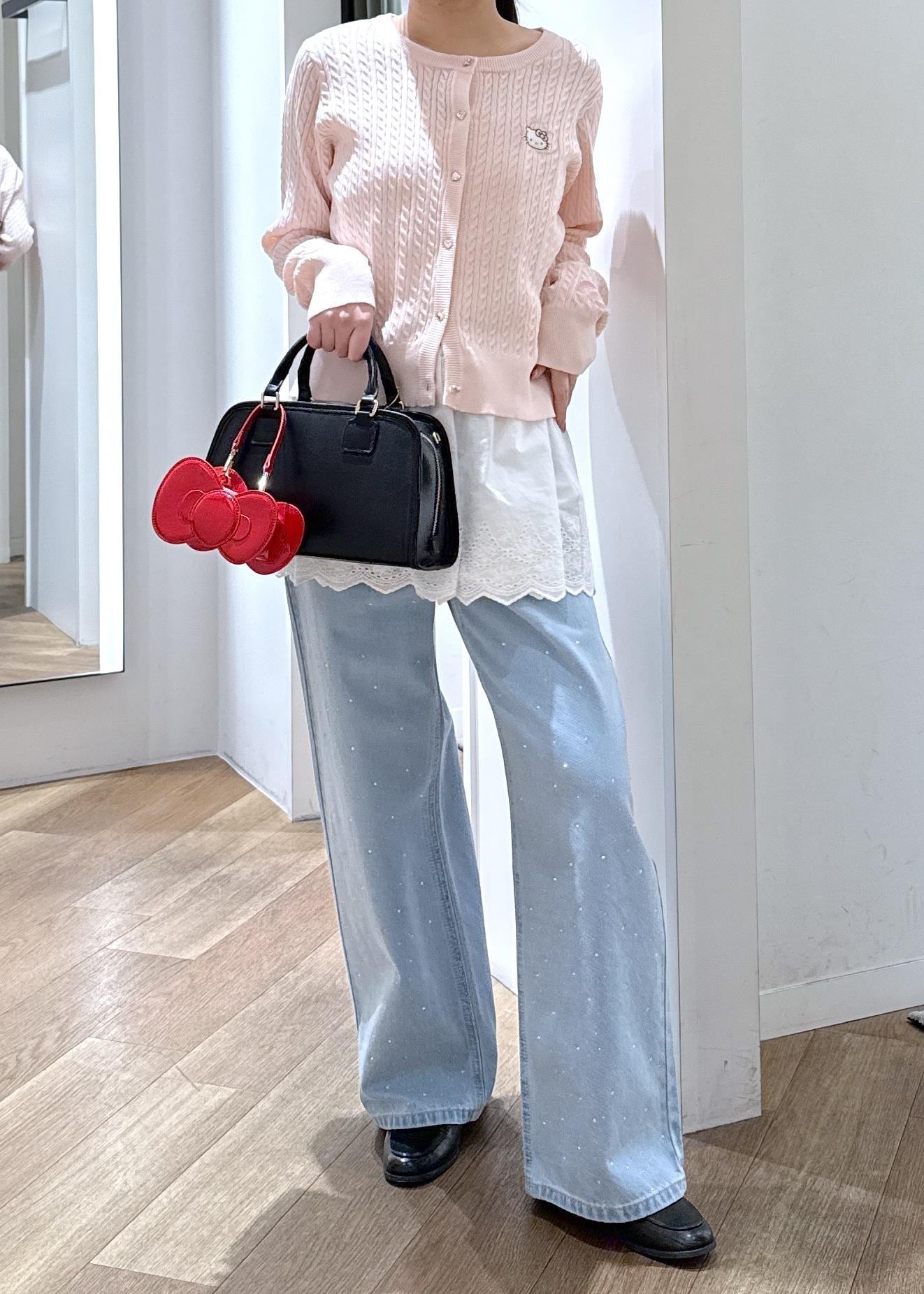 HELLO KITTYカーディガンにレースビスチェをレイヤードした春意識のコーディネートです。