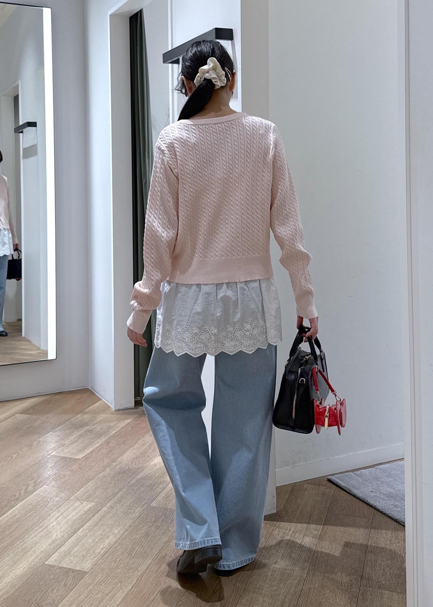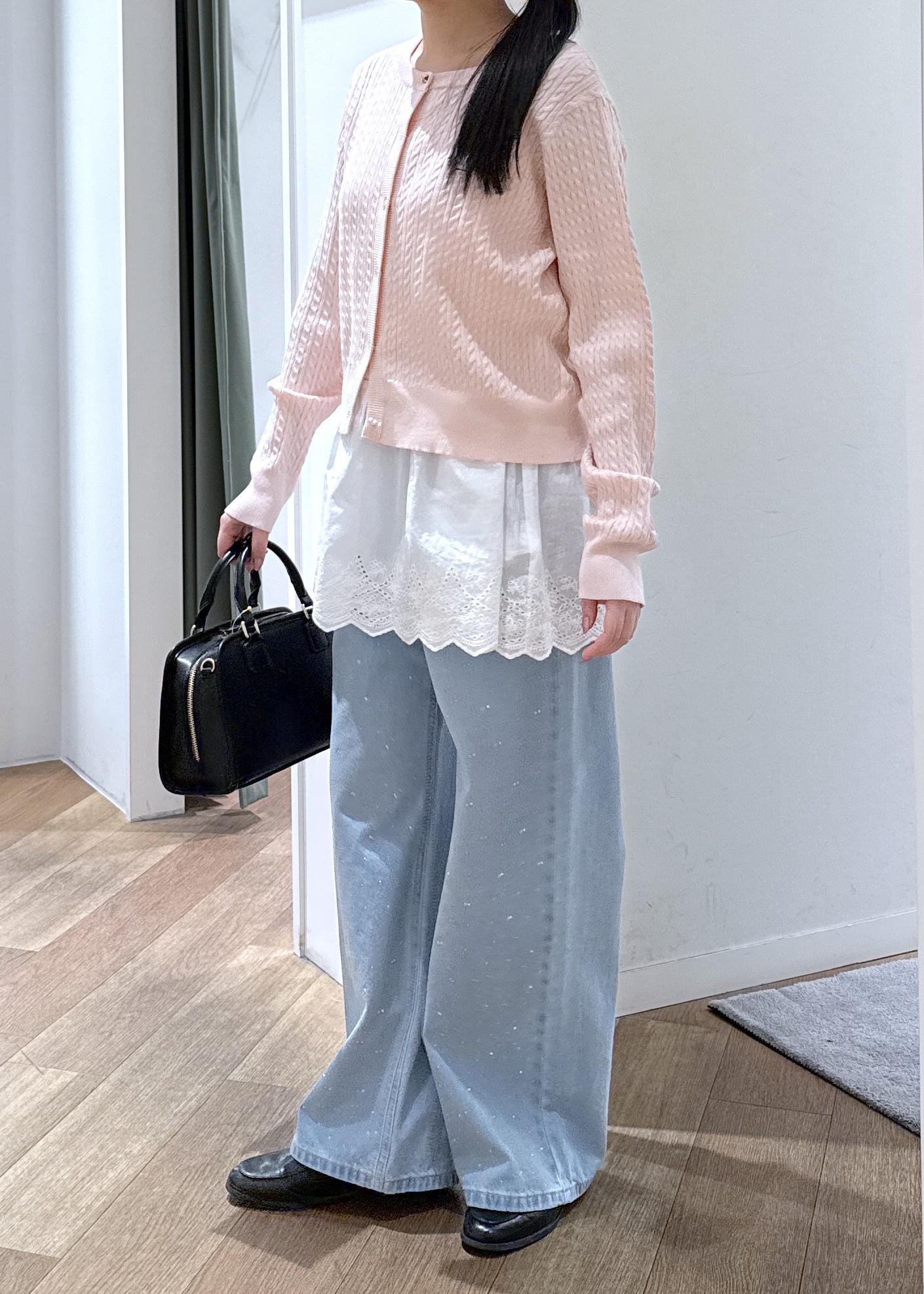 レースとピンクが甘めな印象のためデニムでカジュアルダウンしてバランスをとりました。