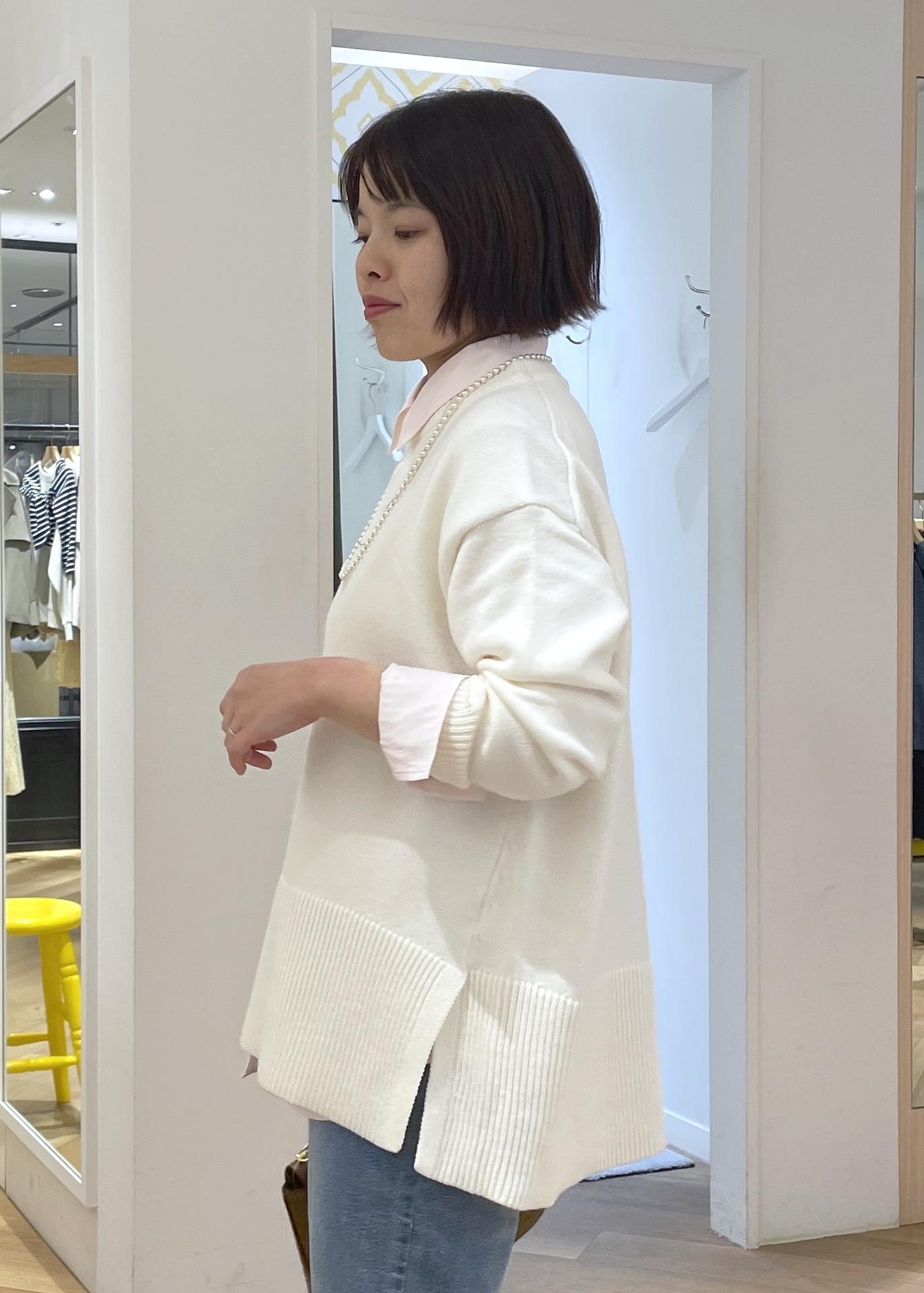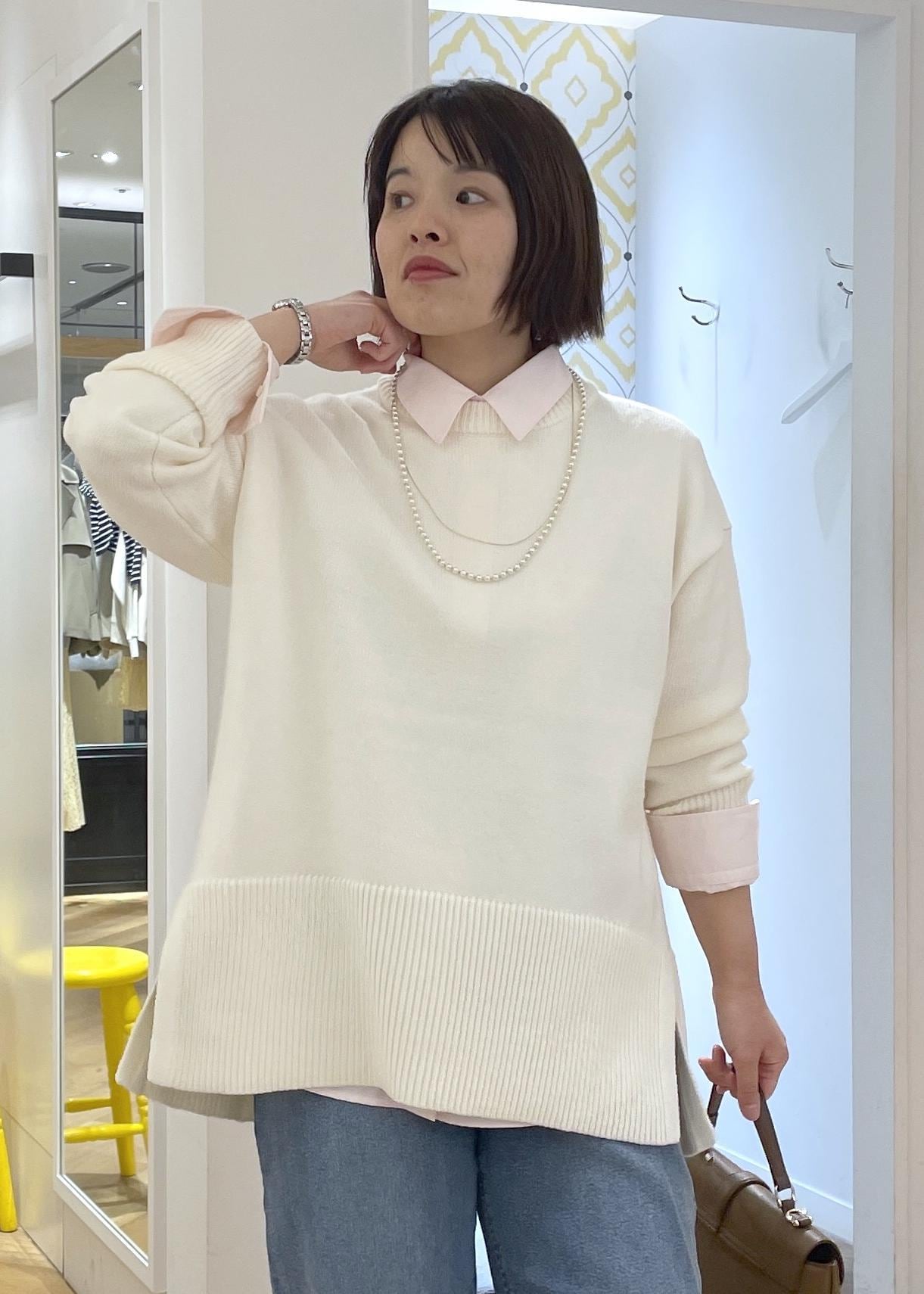 白ニットのピンクシャツレイヤードコーデ