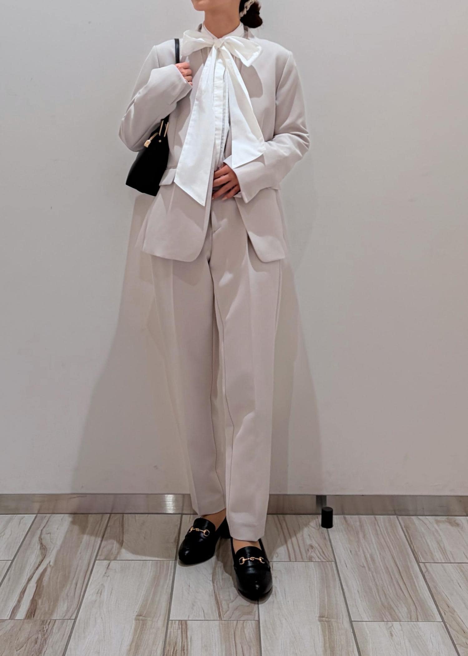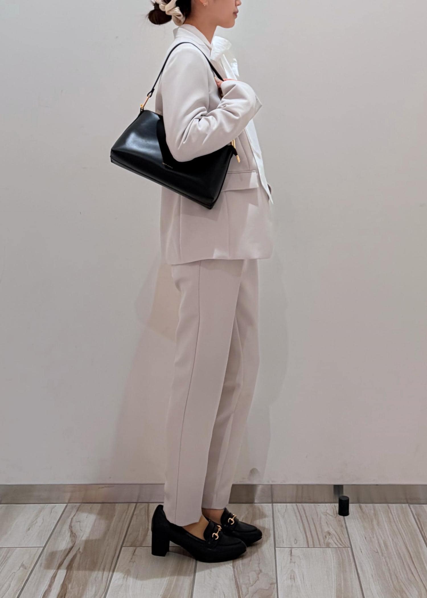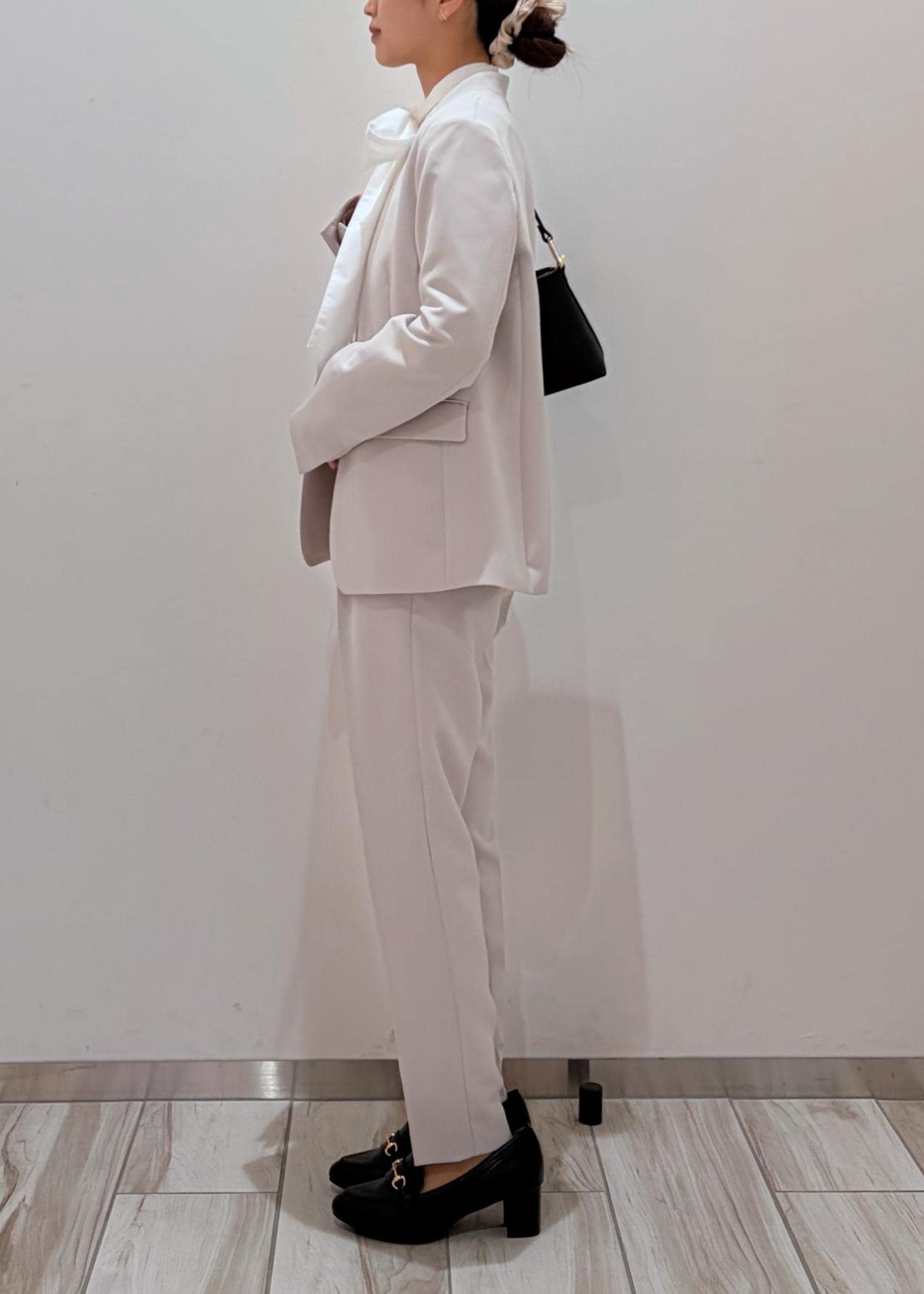 スーツは明るめのグレーを着用。限りなく白に近いお色味なので、全体的に清潔感の溢れるセットアップに◎