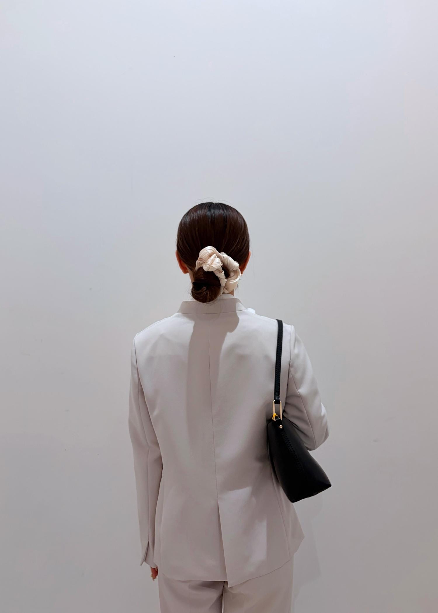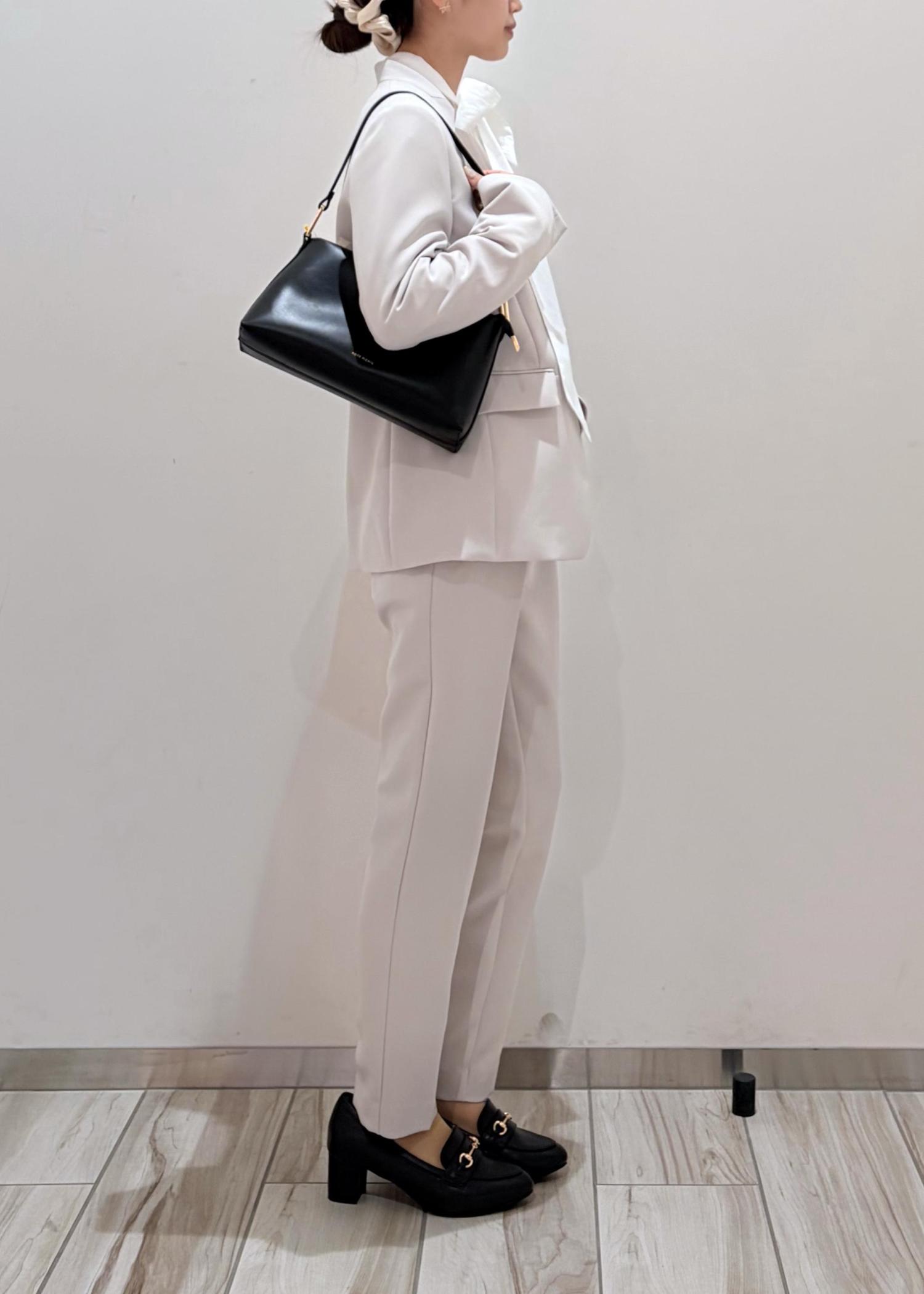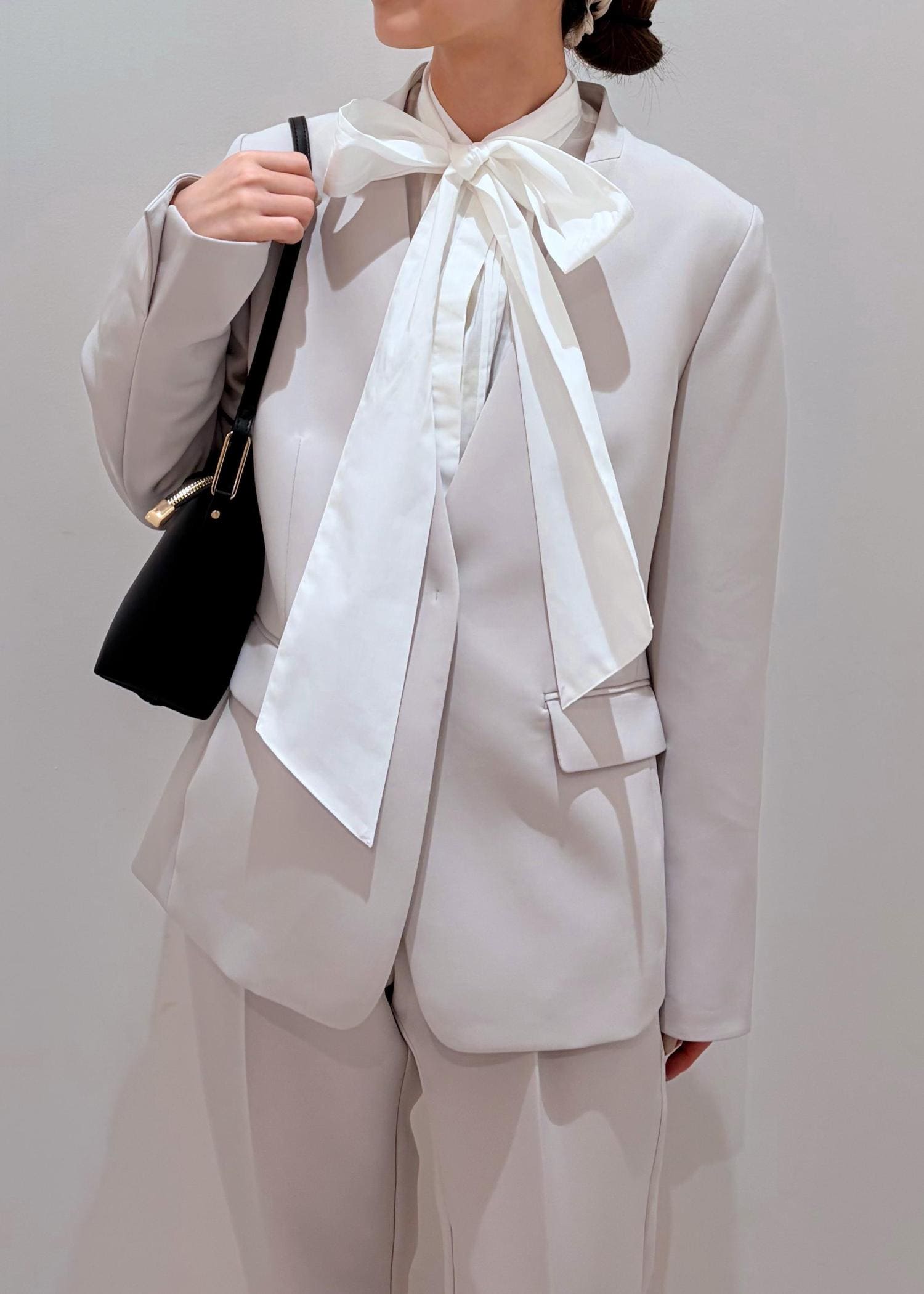 スーツは明るめのグレーを着用。限りなく白に近いお色味なので、全体的に清潔感の溢れるセットアップに◎