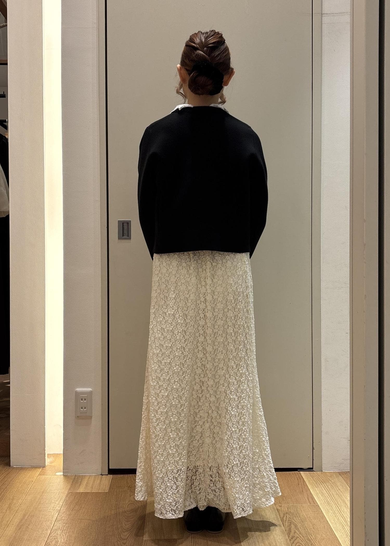 カラーリングはシックですが、スカートのレース感やカーディガンの下にレースカラーのニットを合わせることによって可愛さをプラスしバランスを取りました。