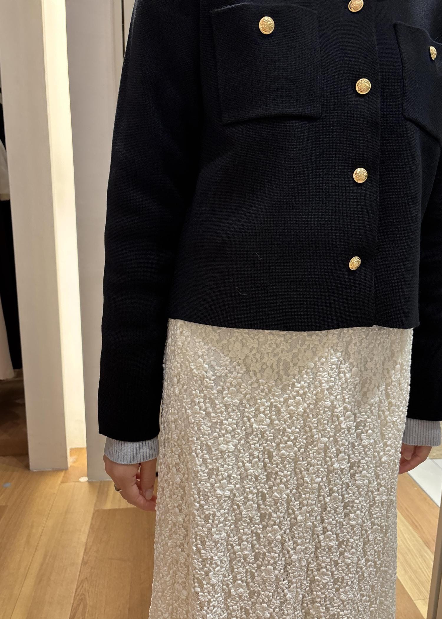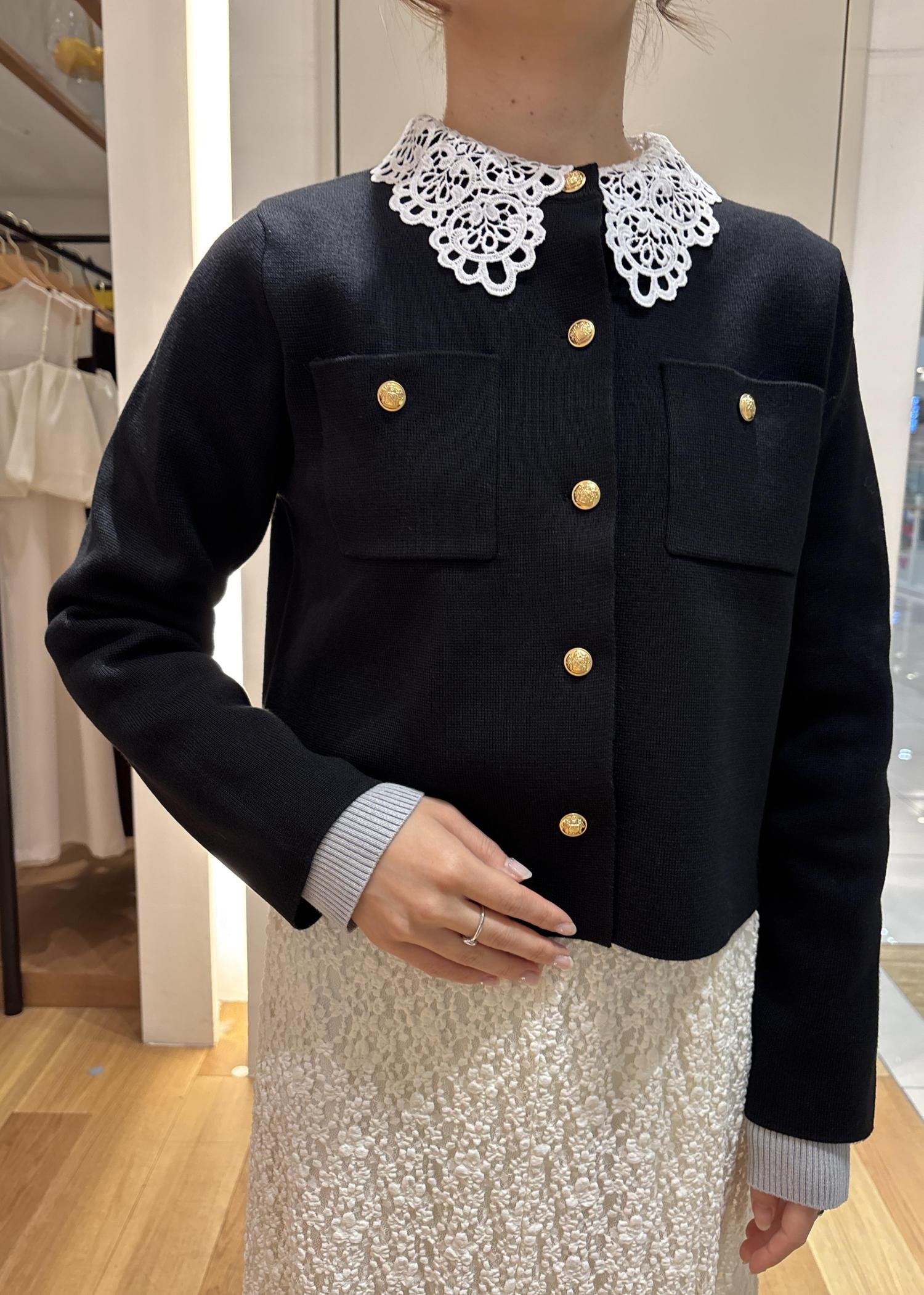 ブラックの金ボタンカーディガンにホワイトのレーススカートを合わせモノトーンでまとめました。