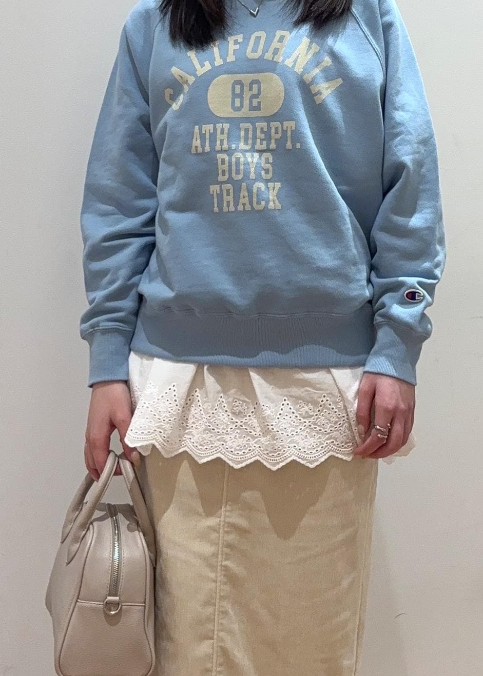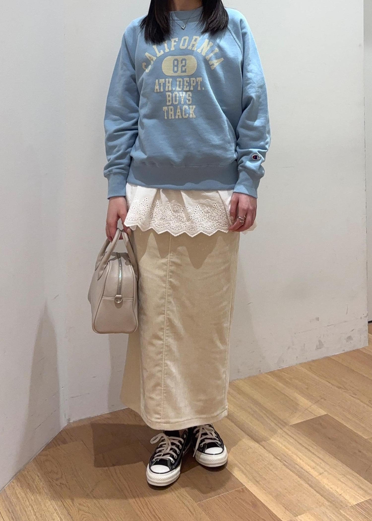 championのスウェットとビスチェをレイヤードさせたカジュアルなスタイリングにしました。スカートと合わせることで少し甘めに♡
