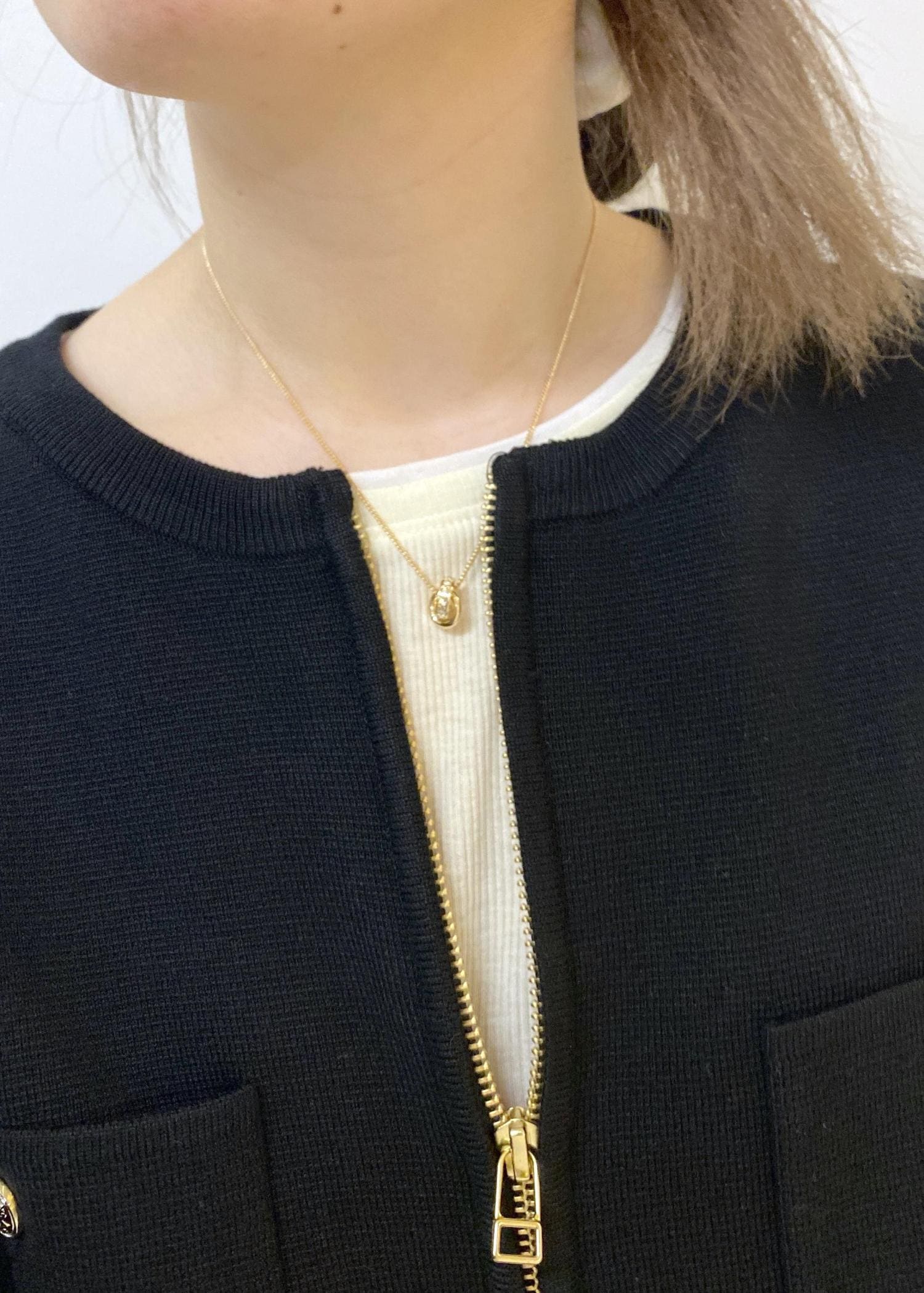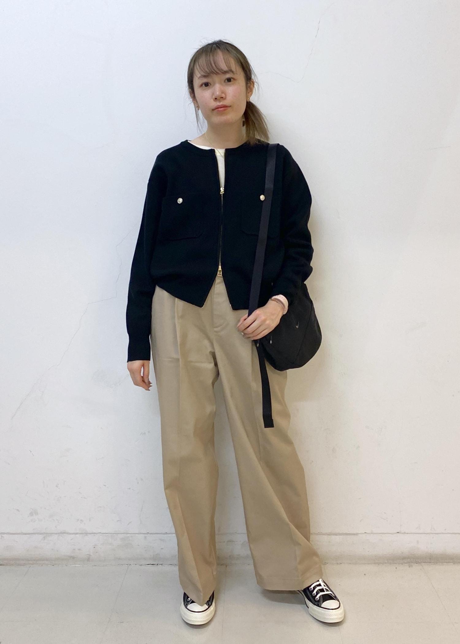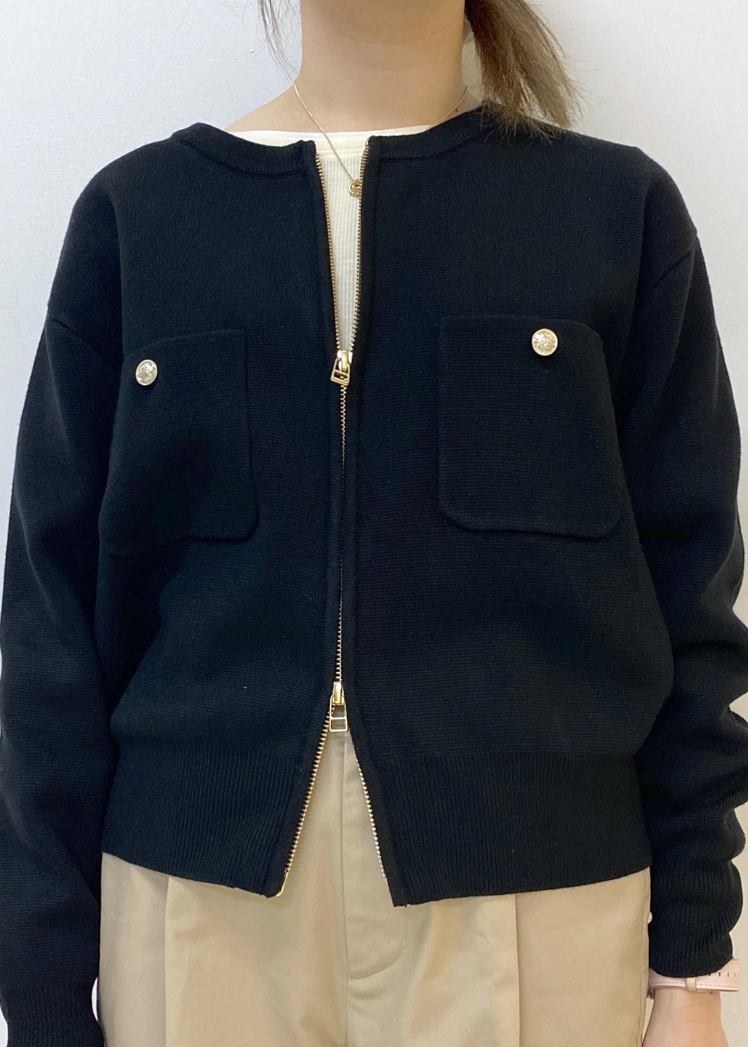 カーディガンはトレンドのダブルジップデザインでこなれ感を演出。
