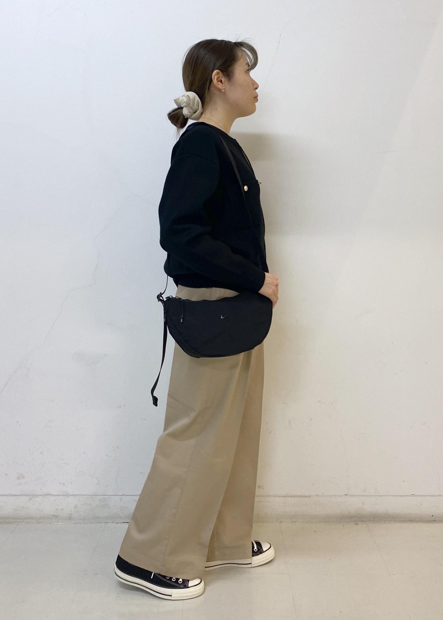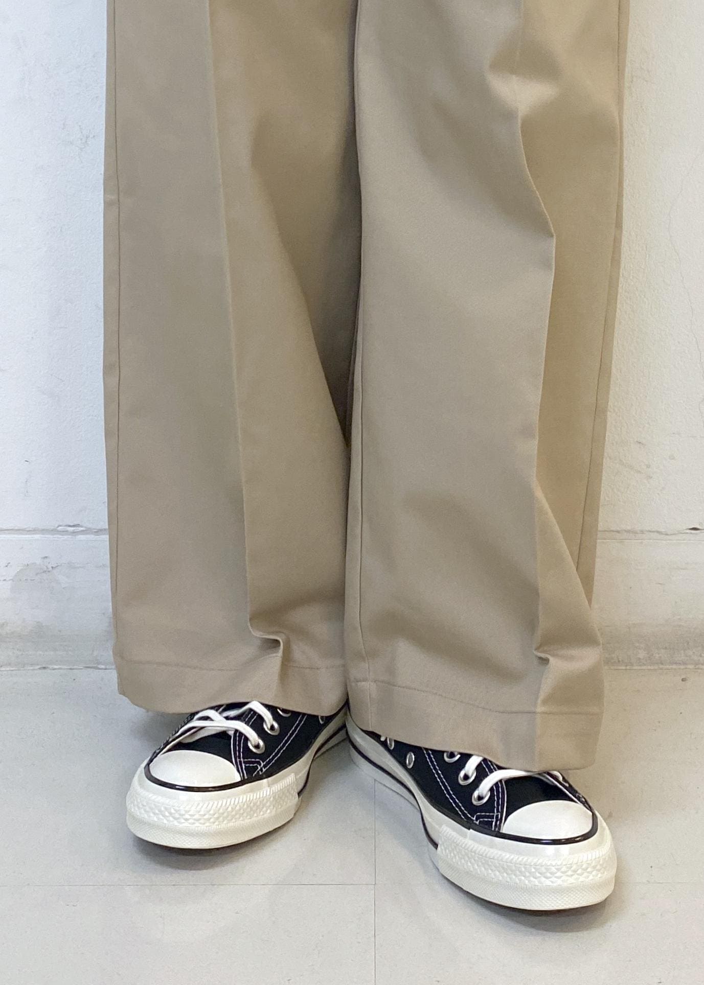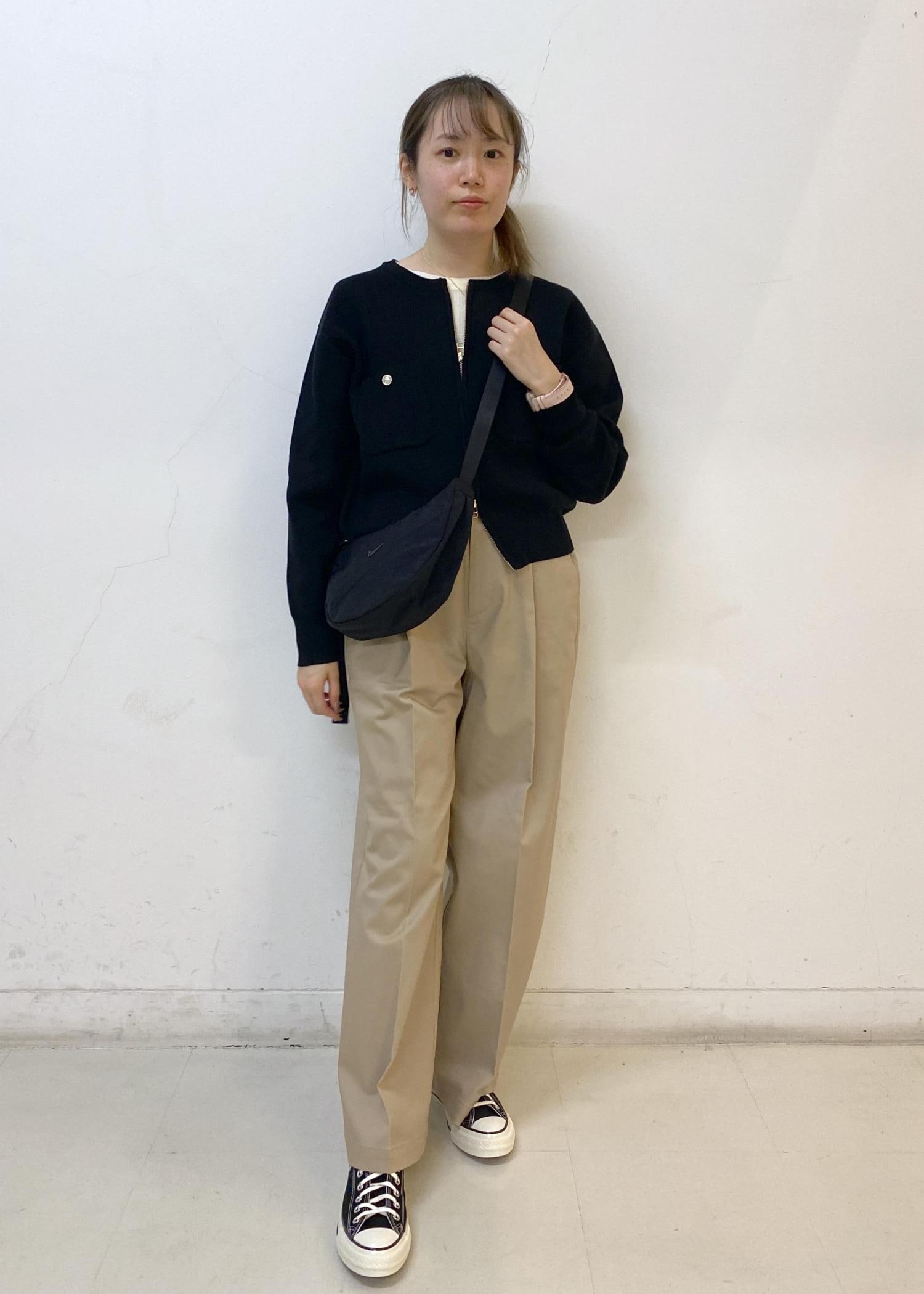 ワイドのカジュアルなデザインなので、トップスはインorすっきりめのデザインを合わせるとシルエットにメリハリが出て綺麗にお召しいただけます。