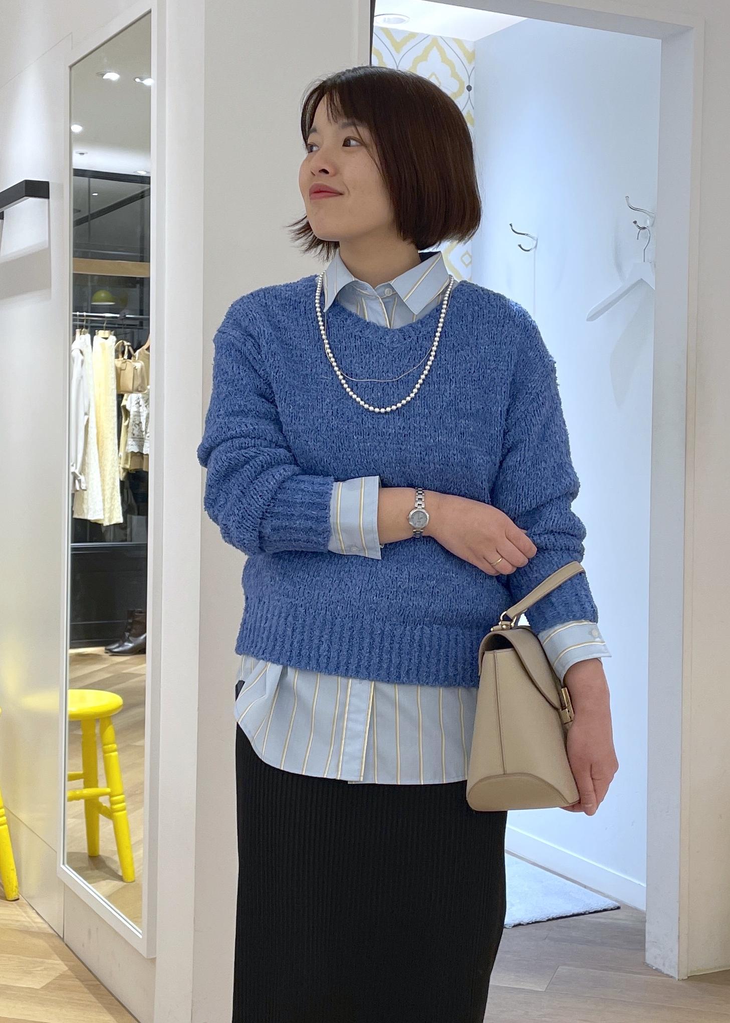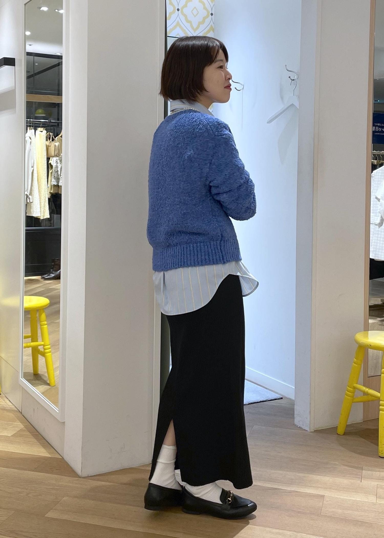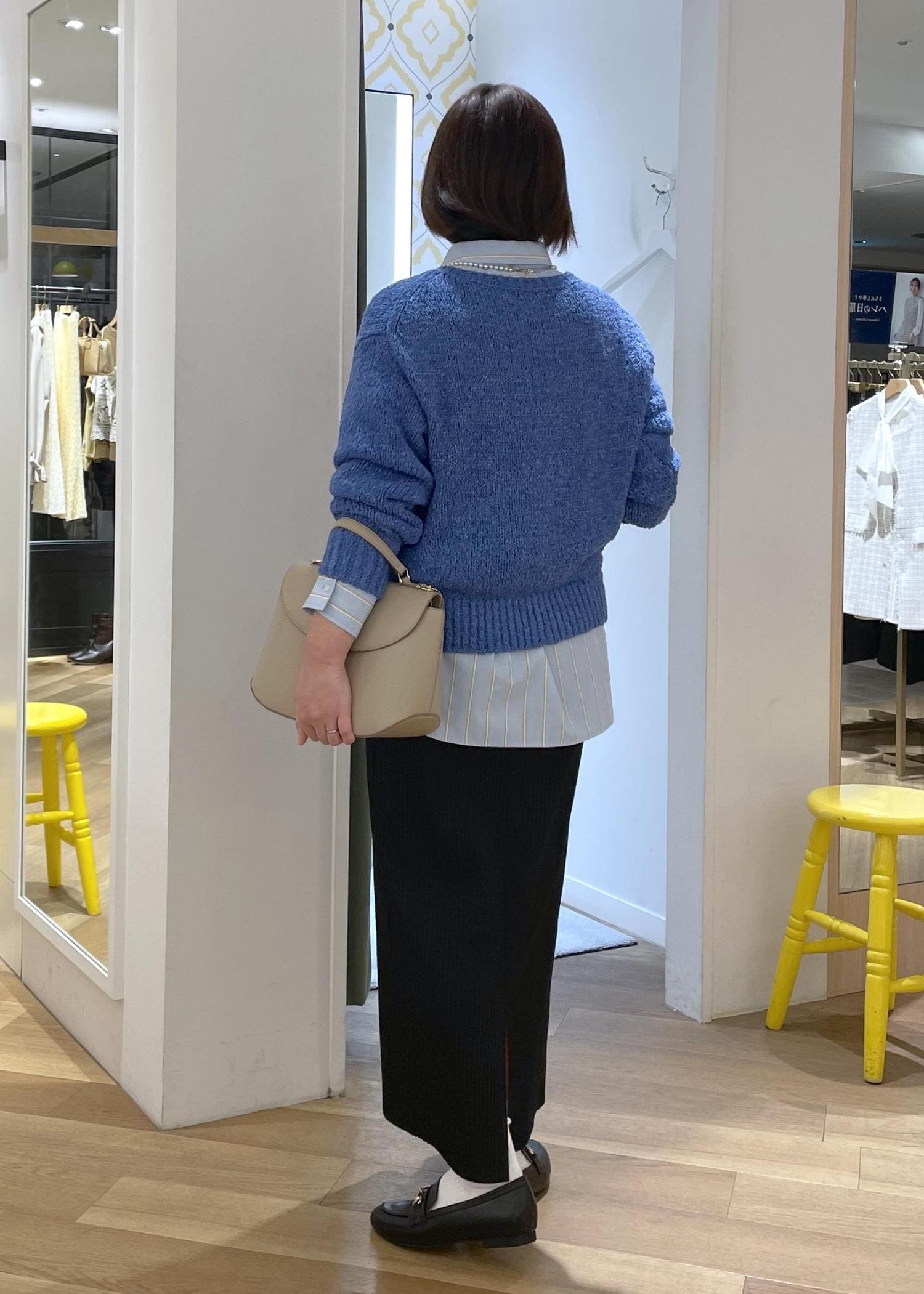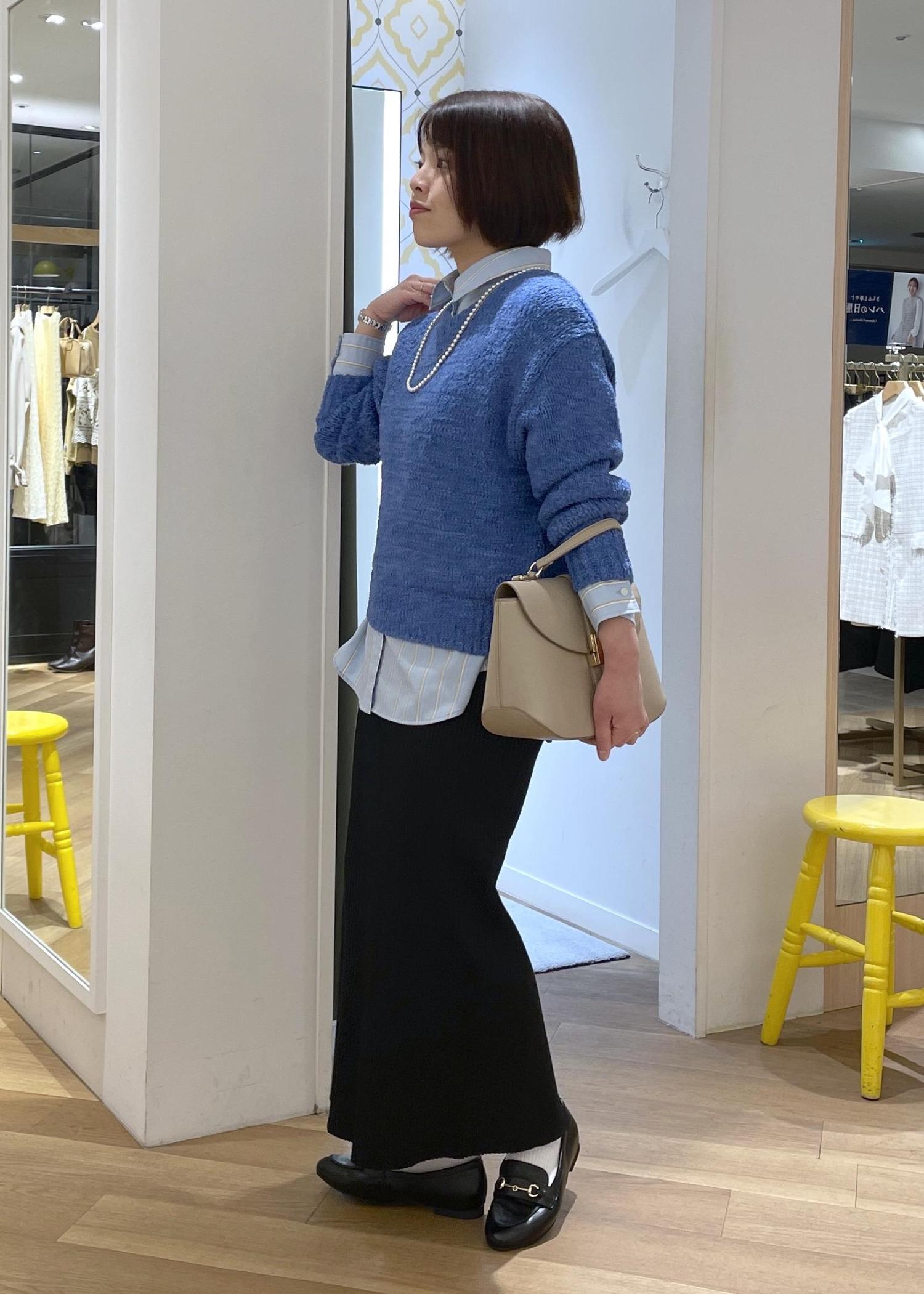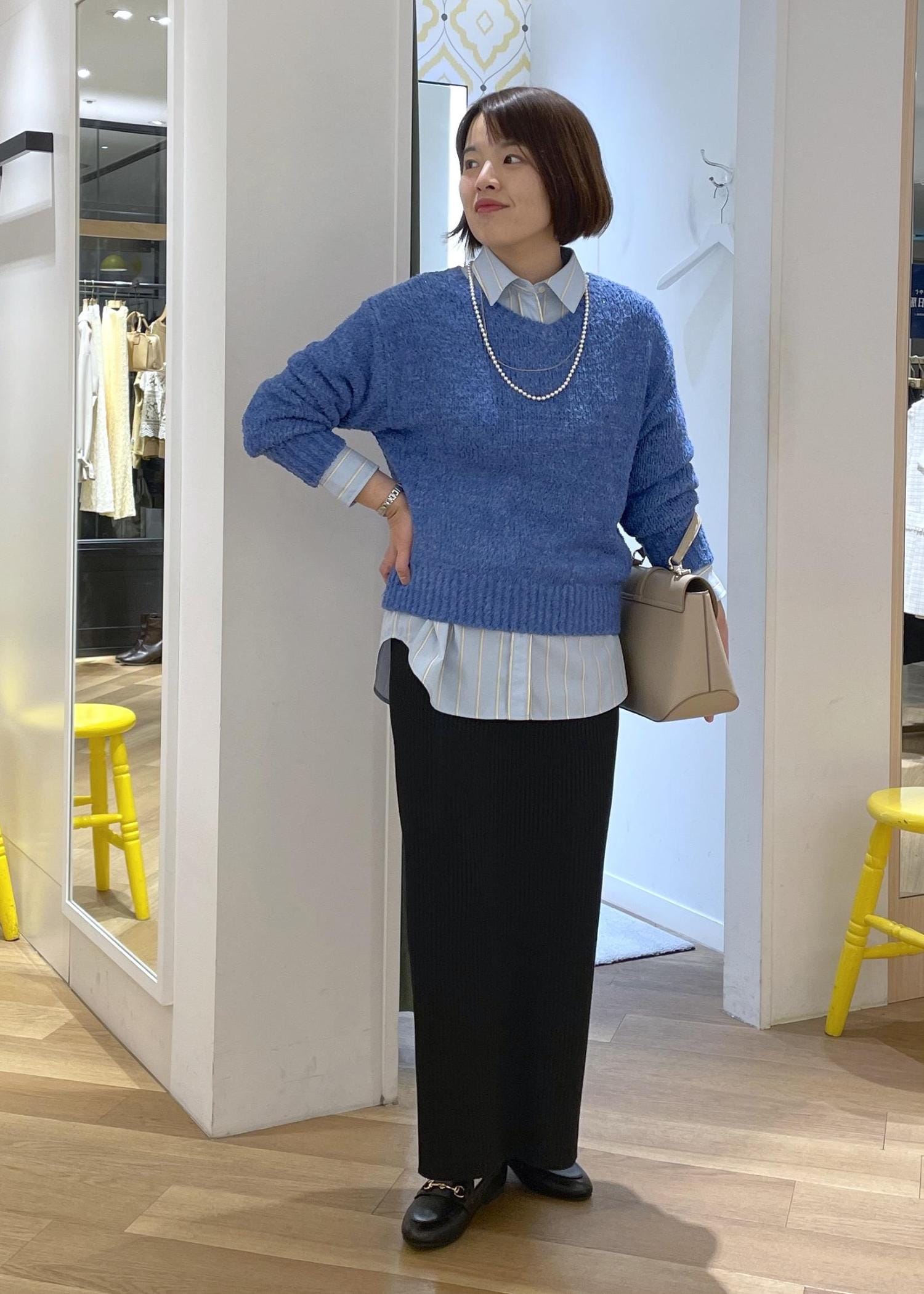 鮮やかなブルーのラメニットにブラックのアイラインスカートwl合わせた、大人カジュアルコーデです!