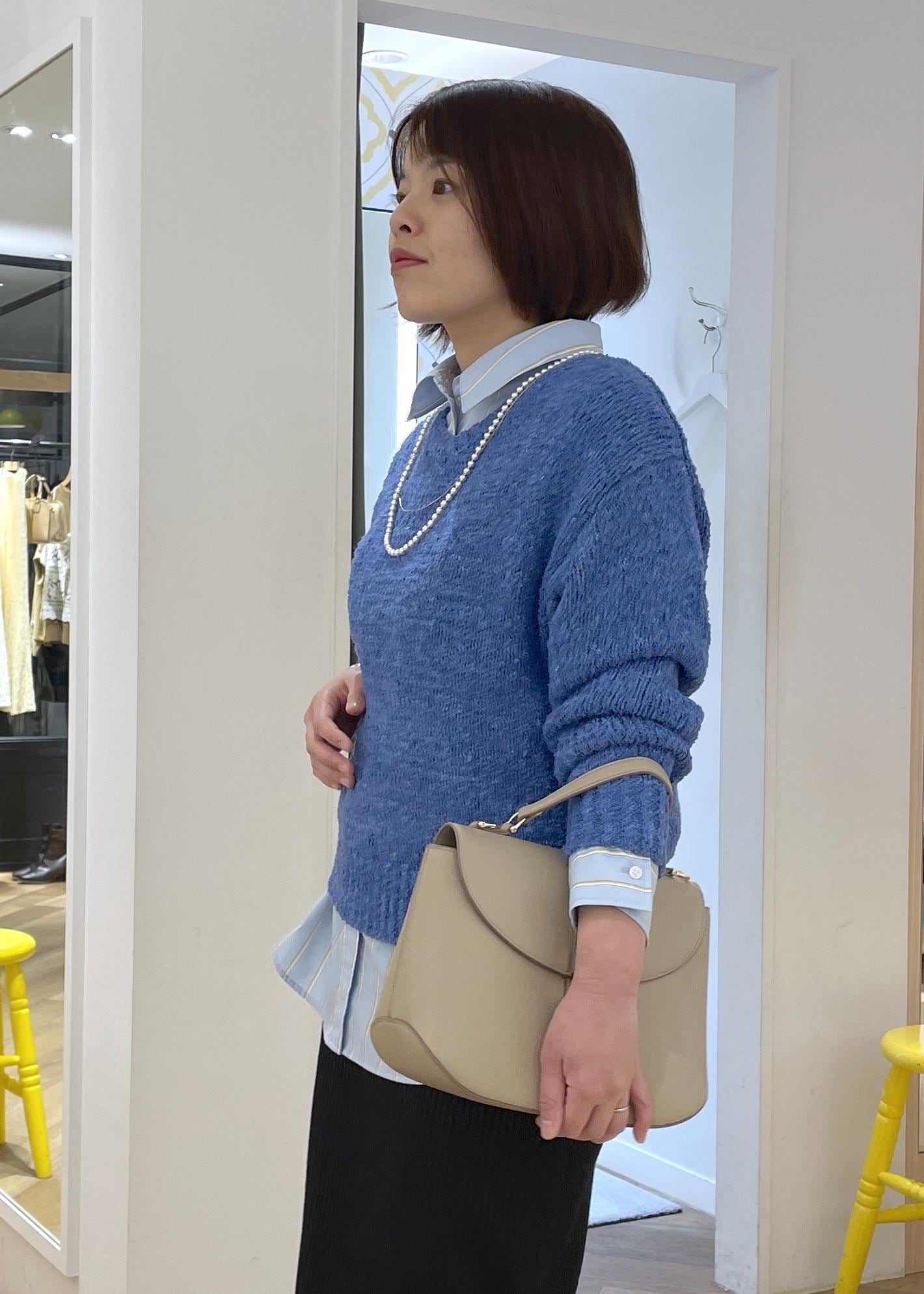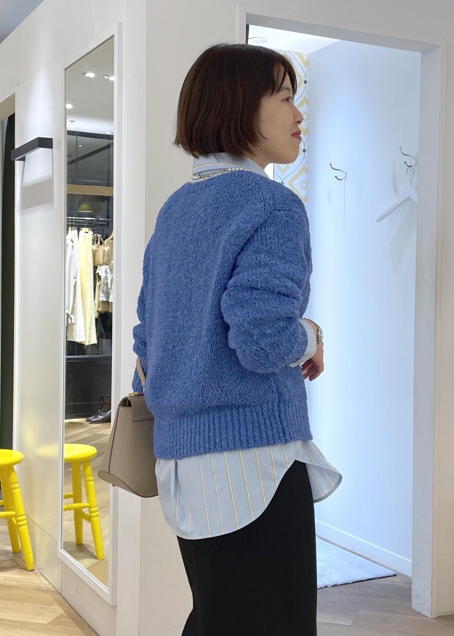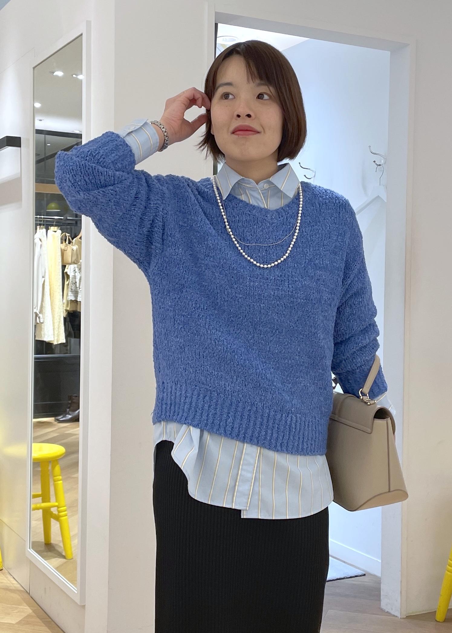 ニットにはシャツをレイヤードして少し知的な印象に◎