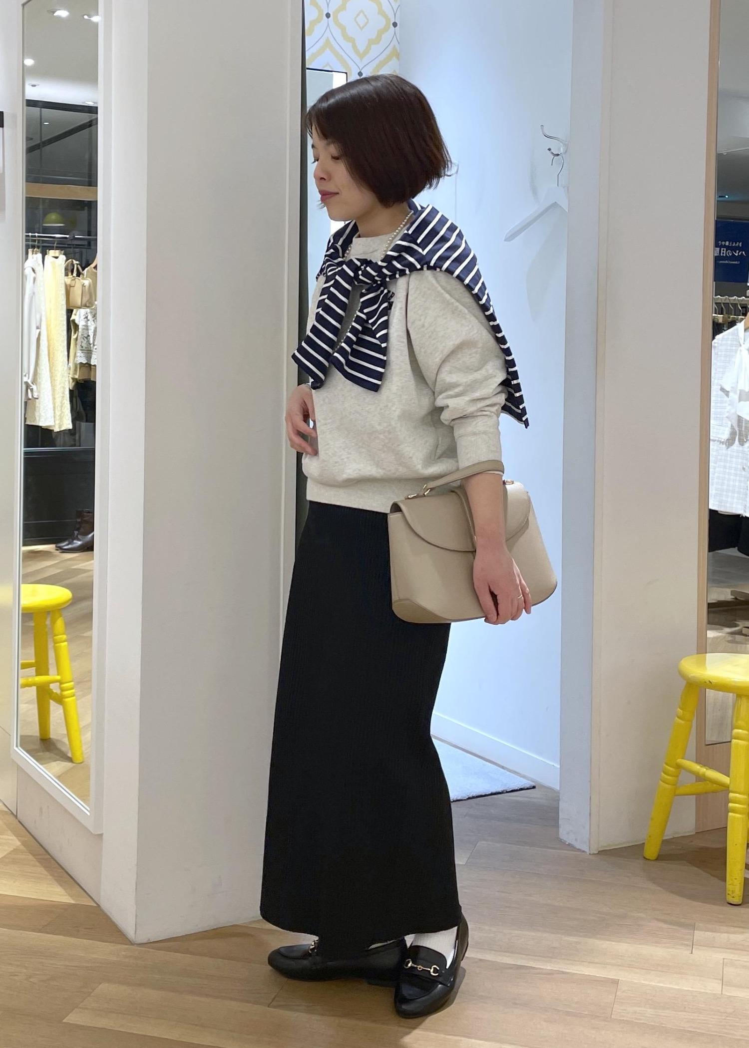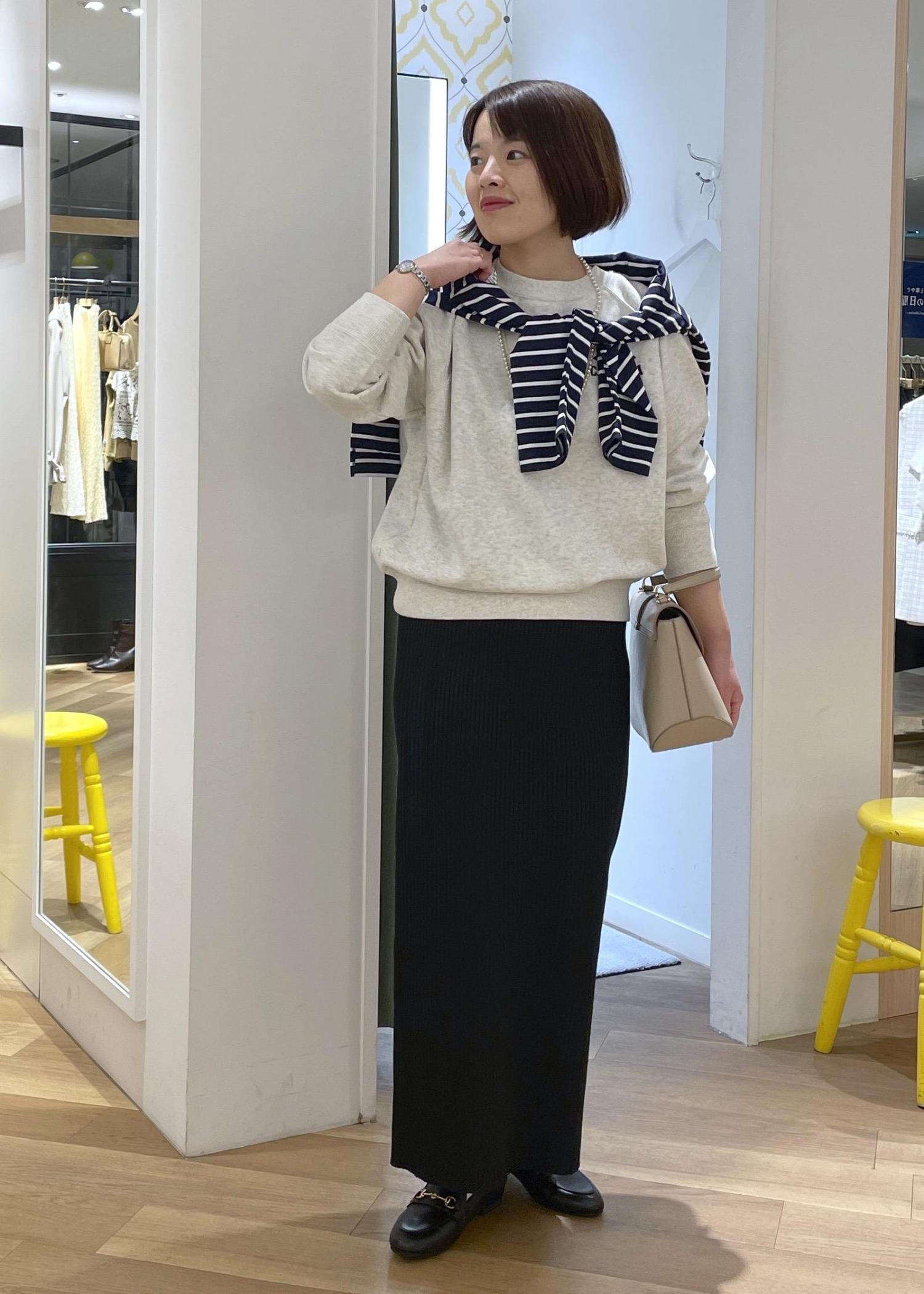 ゆるっと着れるロゴスウェットに黒のアイラインスカートを合わせた、リラックス感ある大人カジュアルコーデです!