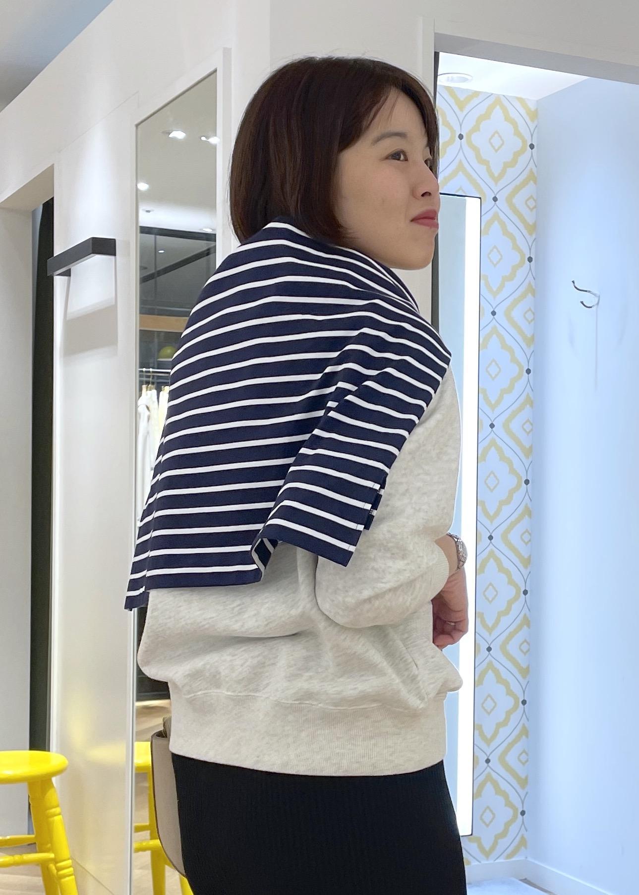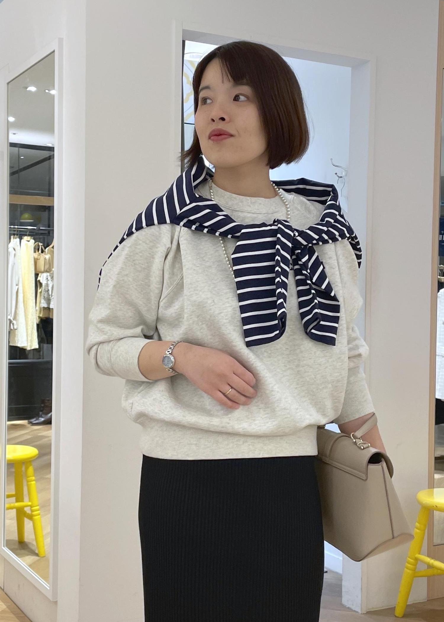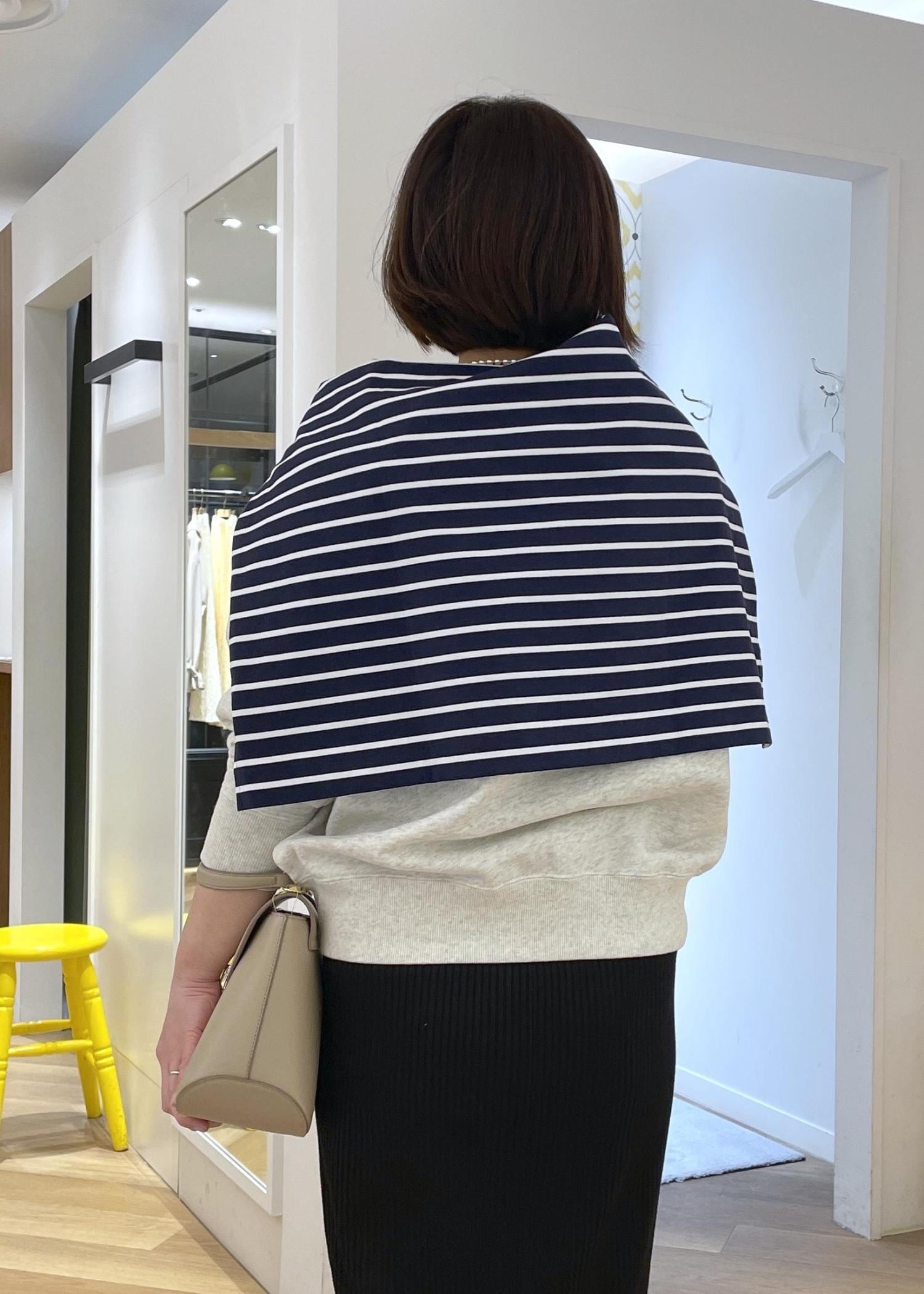 ボーダーカットソーを肩掛けして、コーデのアクセントに◎