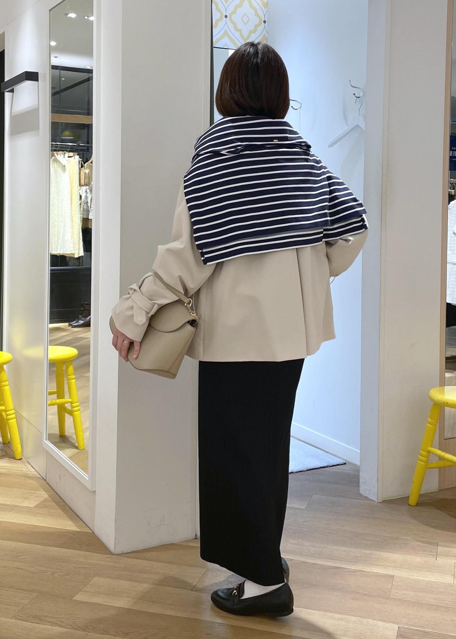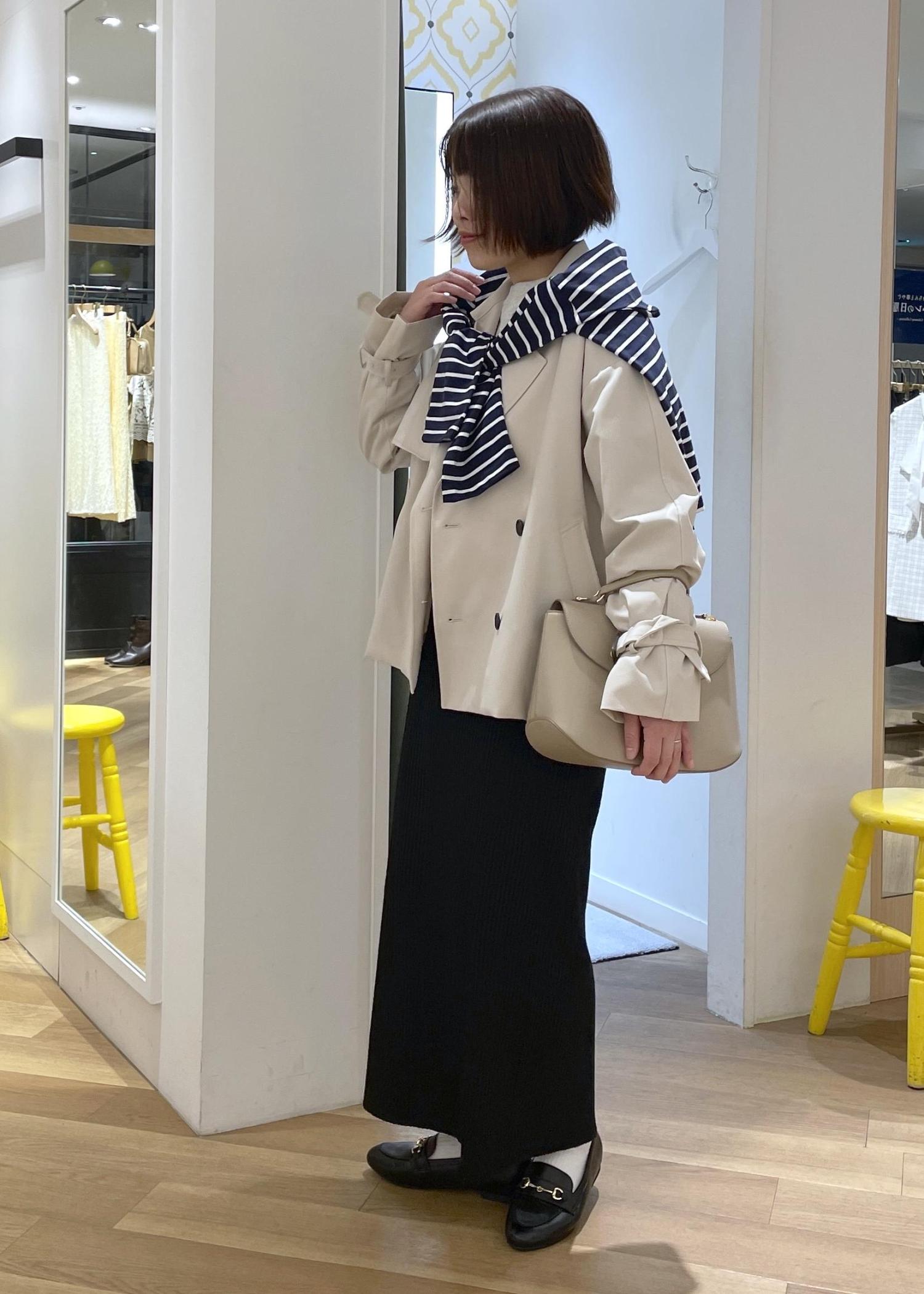 柔らかなベージュのトレンチコートに、大人な黒のアイラインスカートを合わせて、メリハリのある大人カジュアルコーデに◎