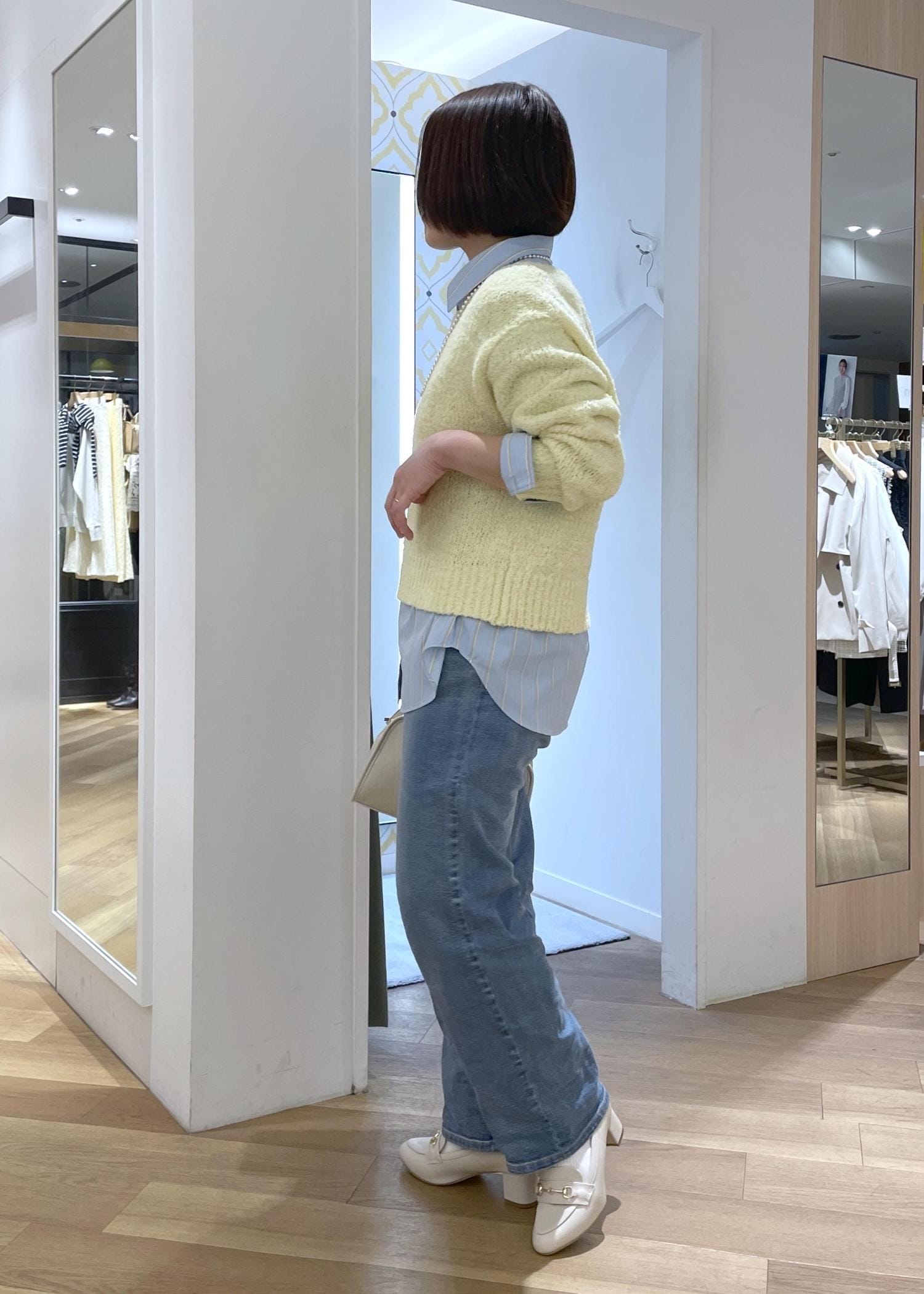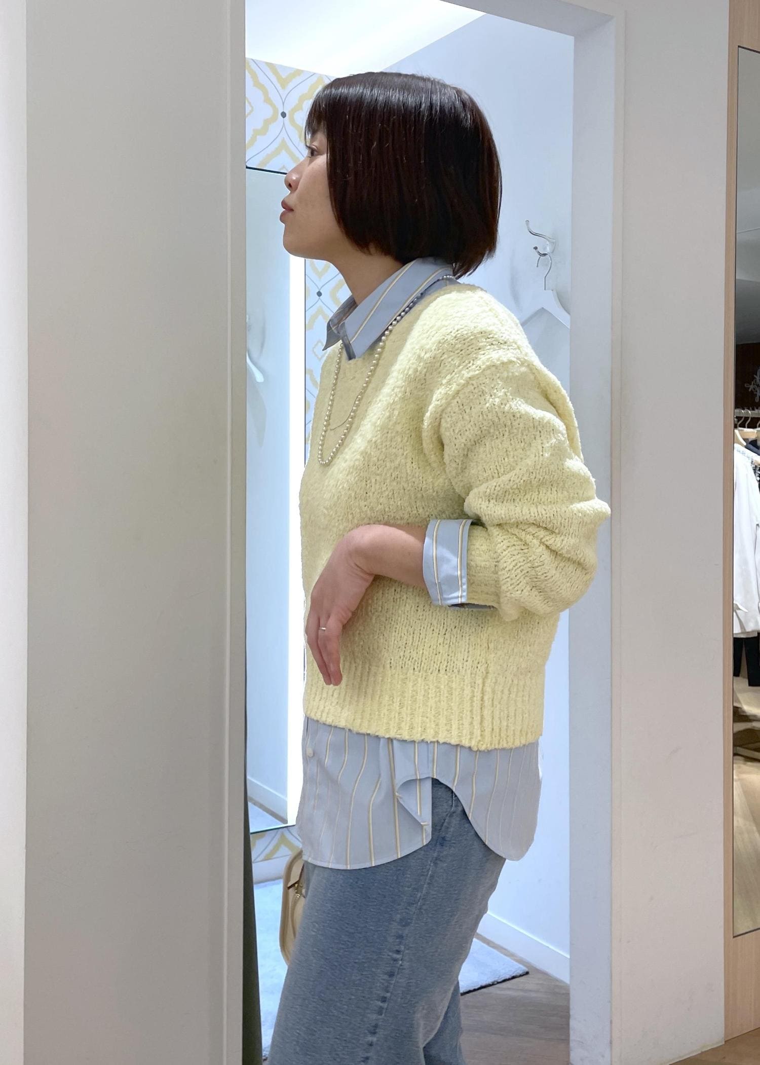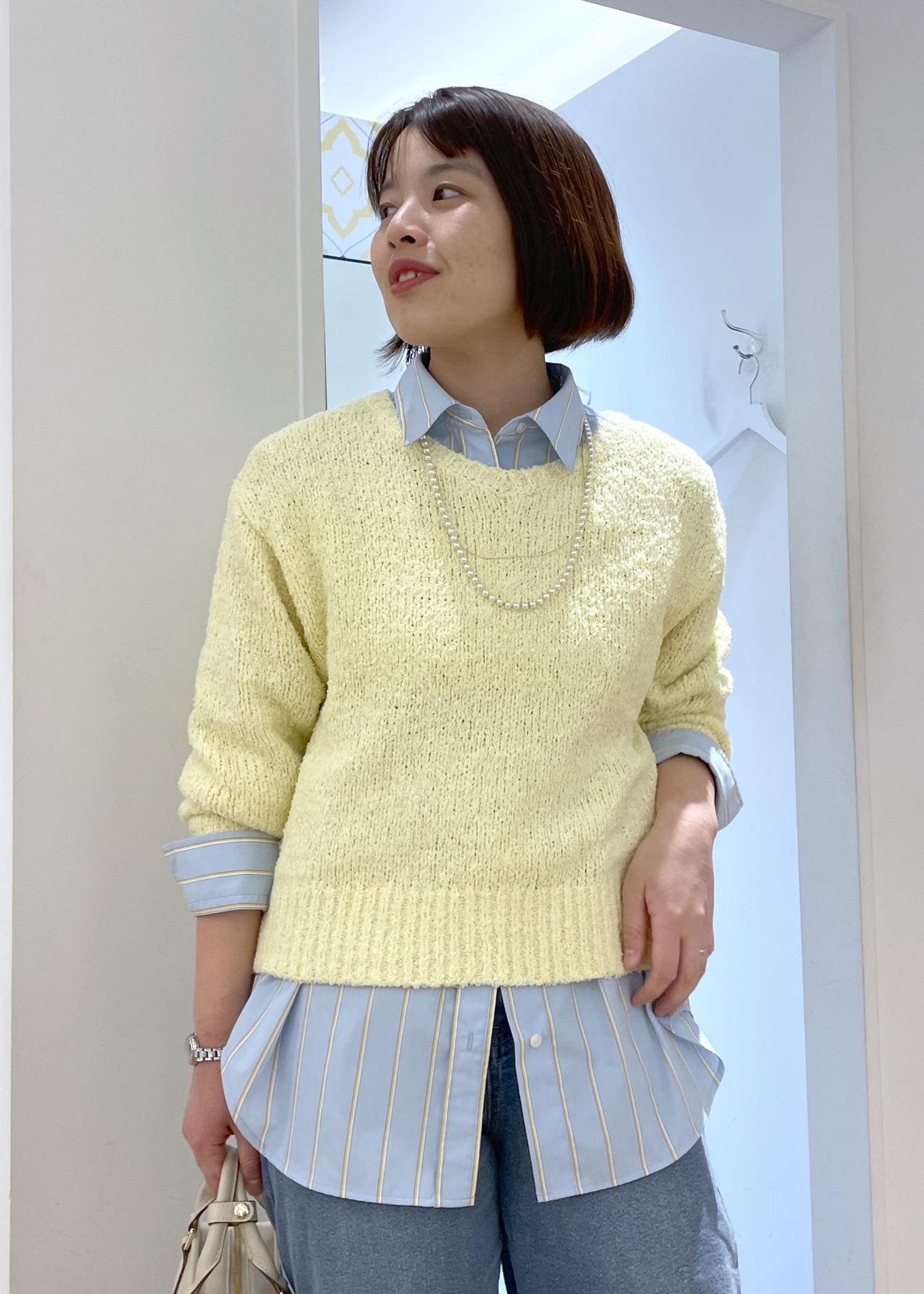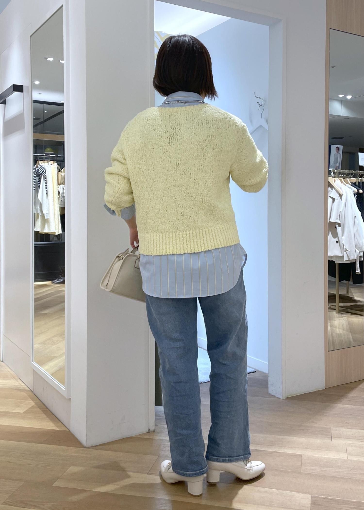 イエローのラメニットにブルーのデニムを合わせた、春にぴったりの爽やかカラーコーデです!