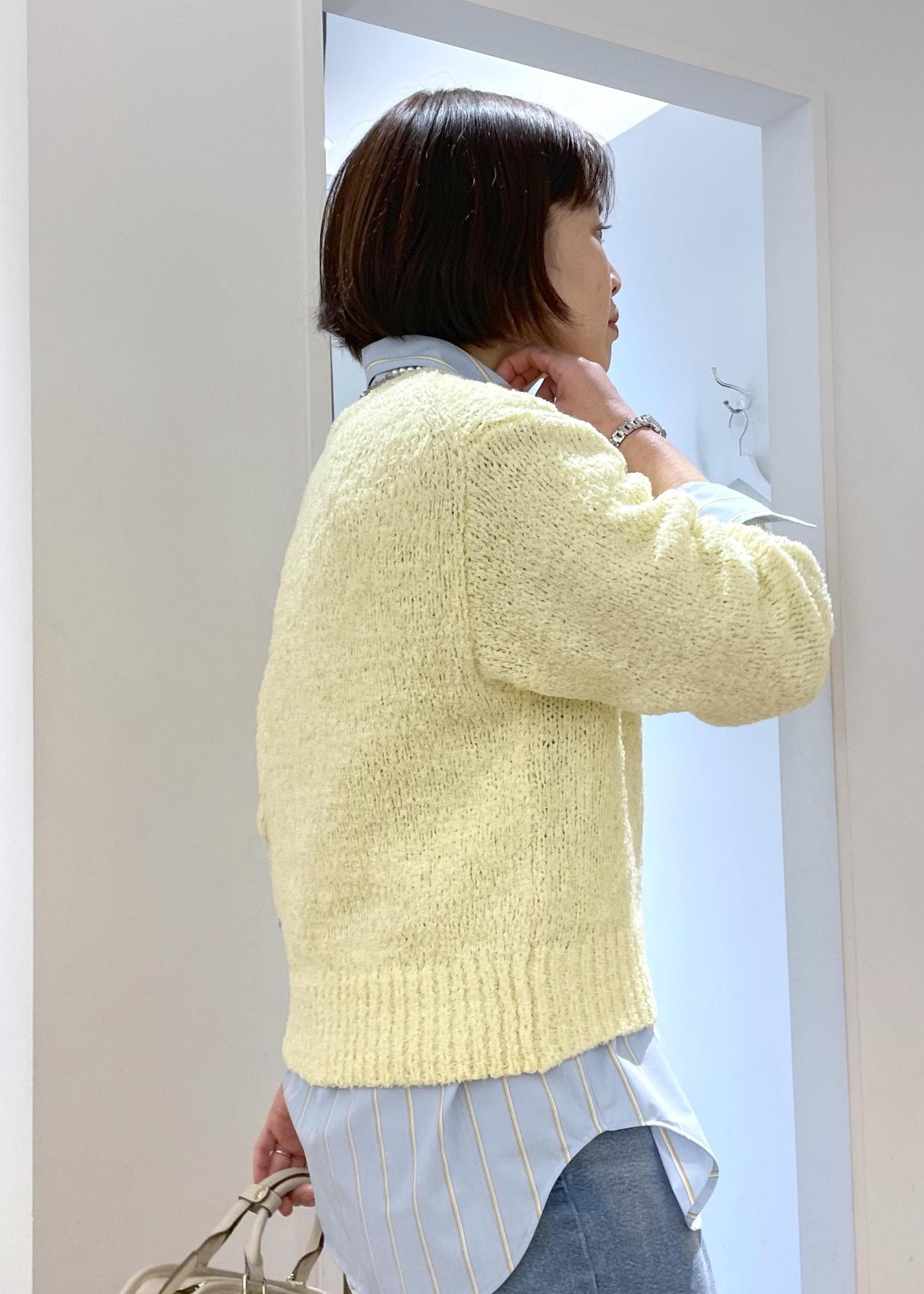 ニットのインナーにはストライプのシャツを合わせて少し知的な雰囲気もプラスしました◎