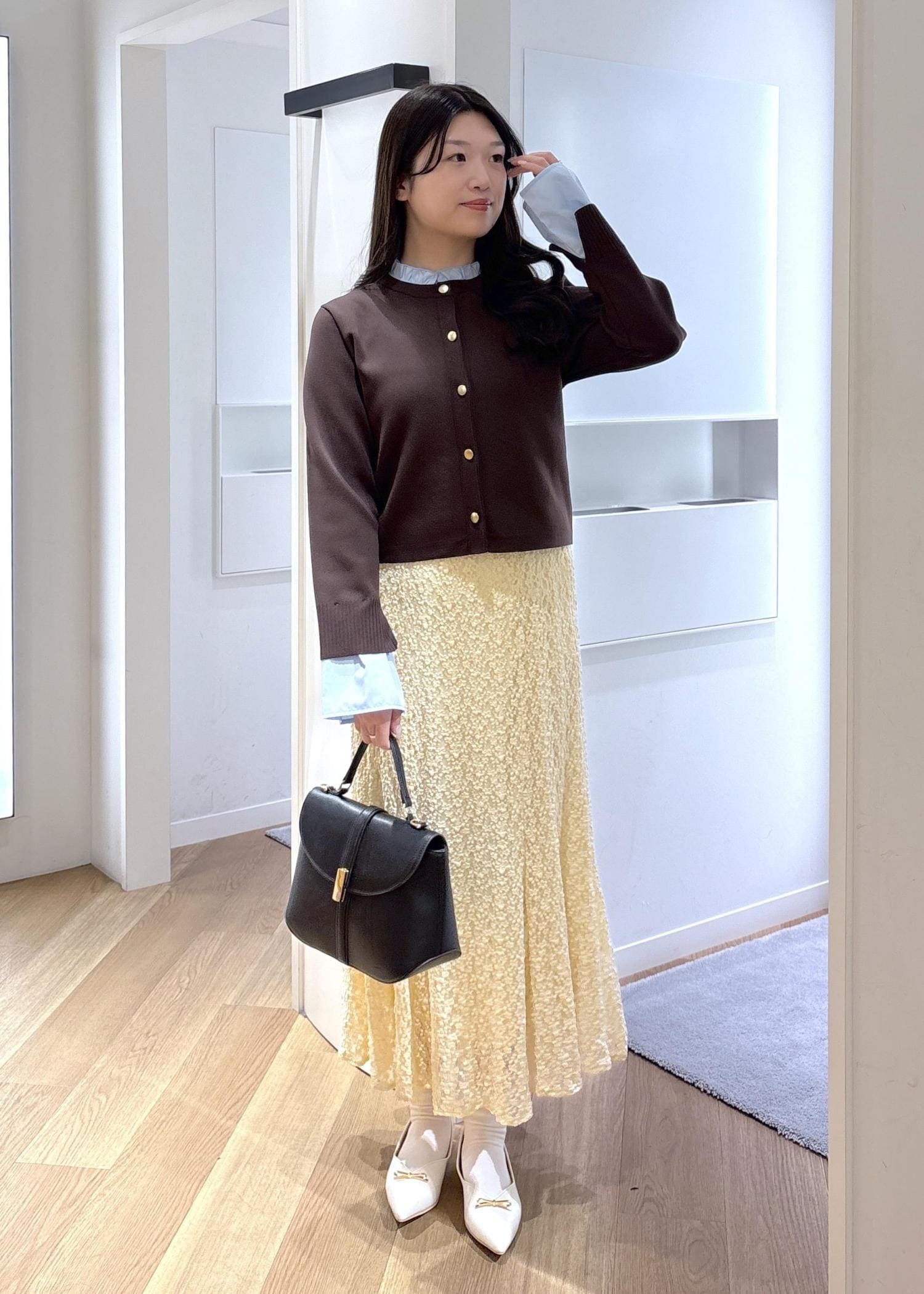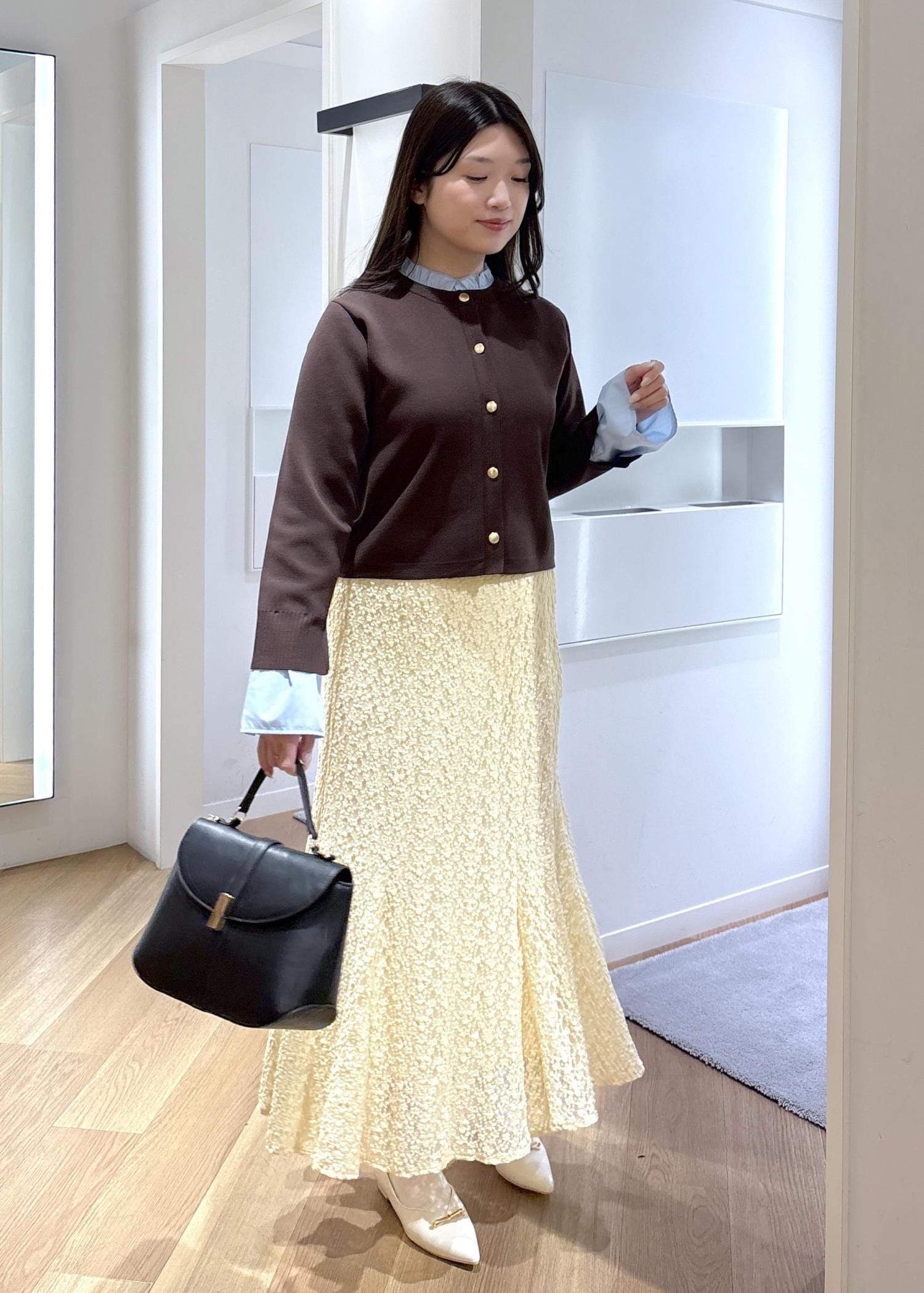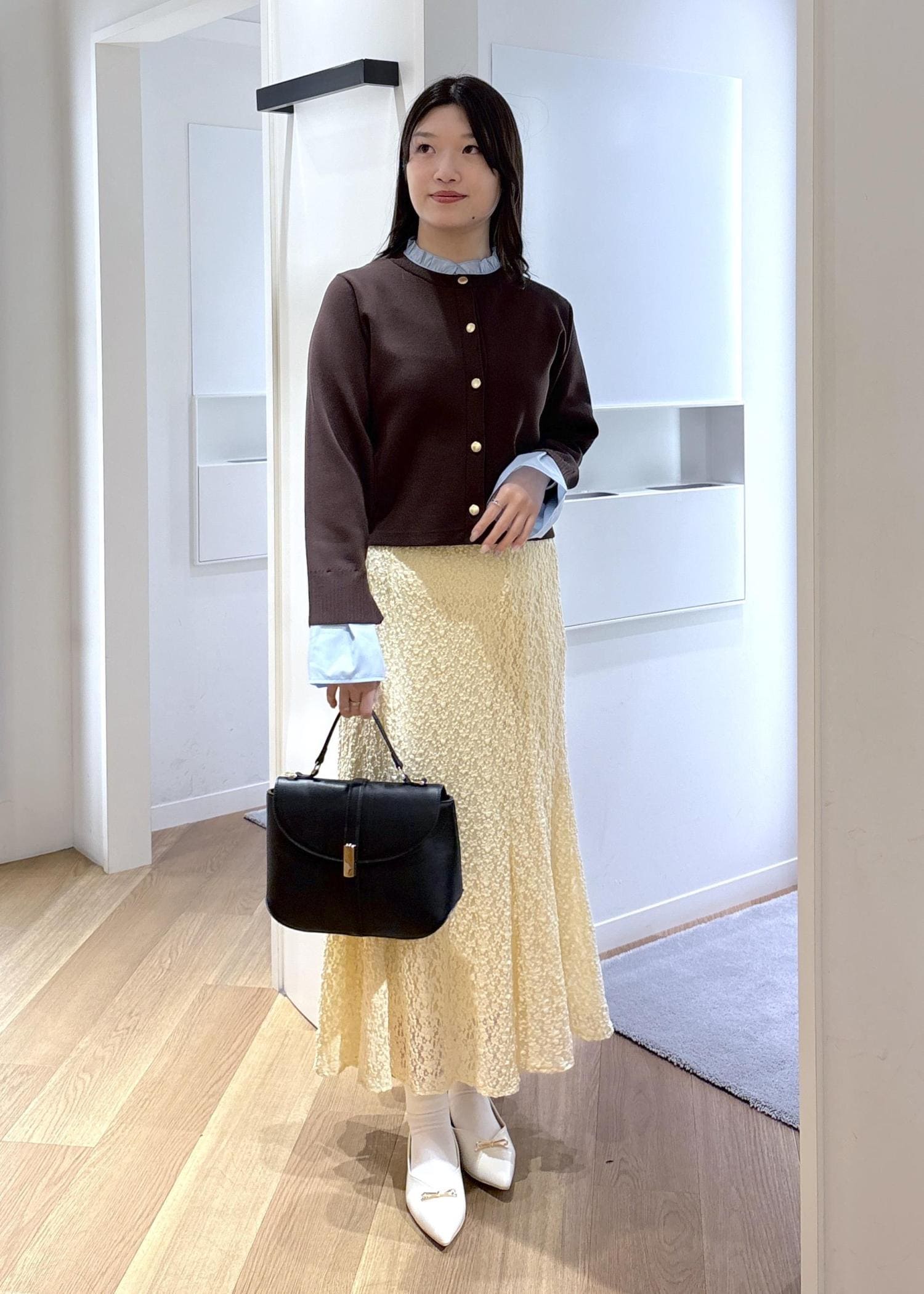 ブラウン×ブルーのトレンドカラーを取り入れ、きちんと感あるレーススカートで合わせたコーデです。