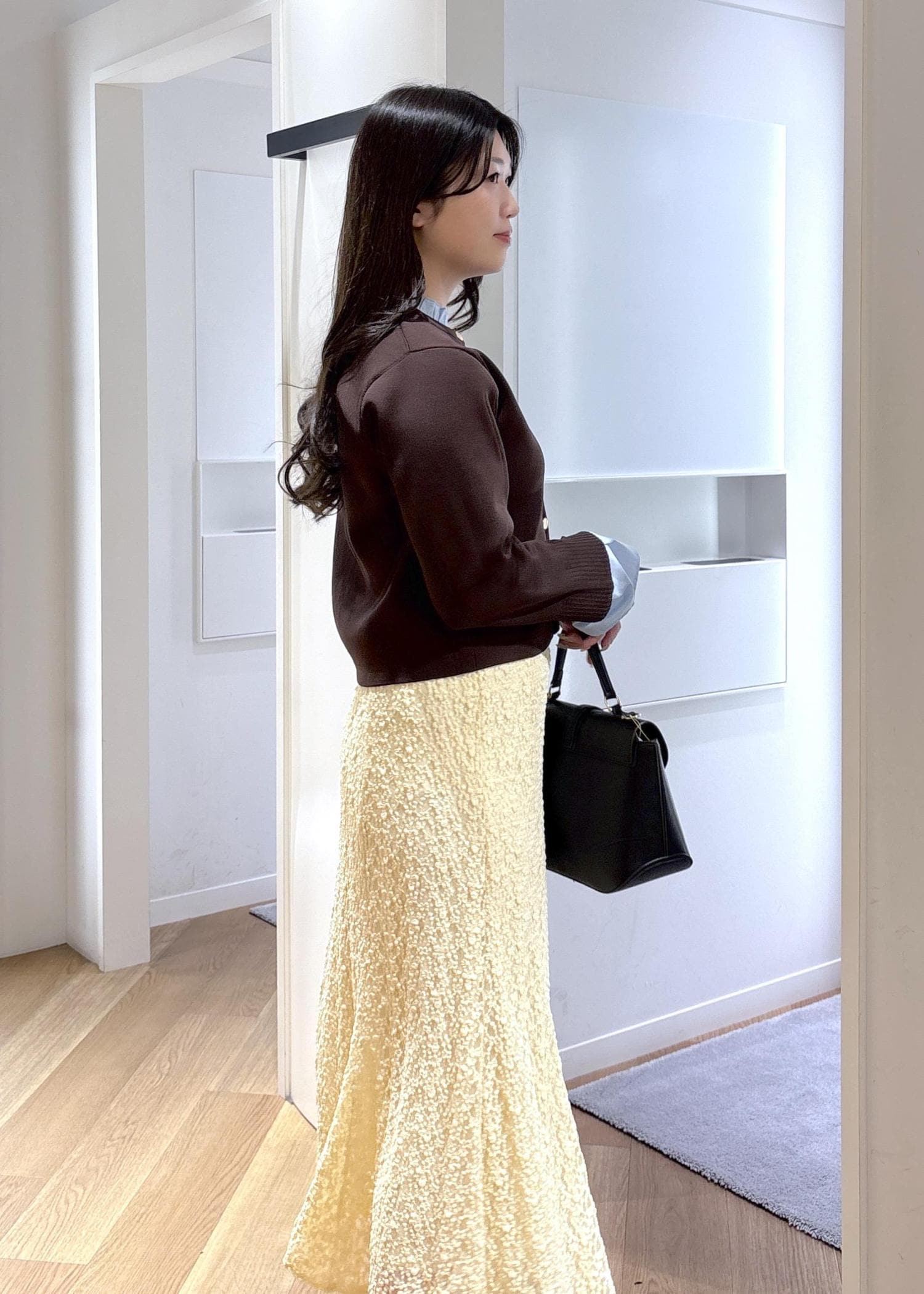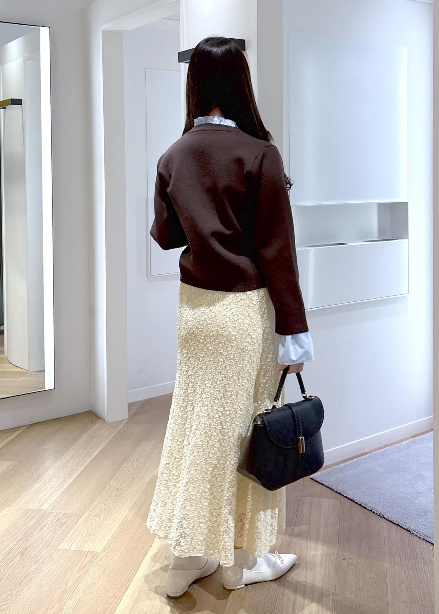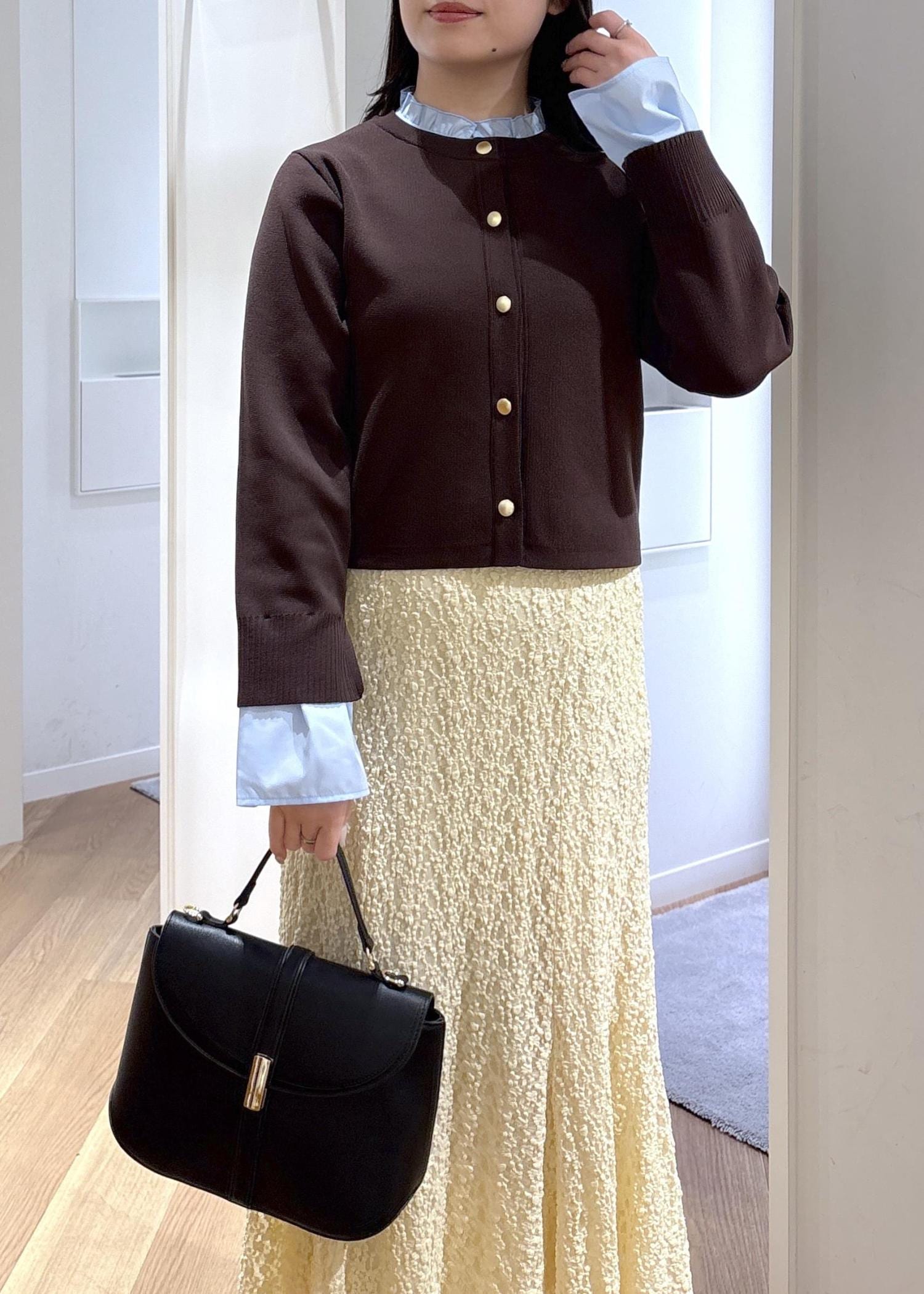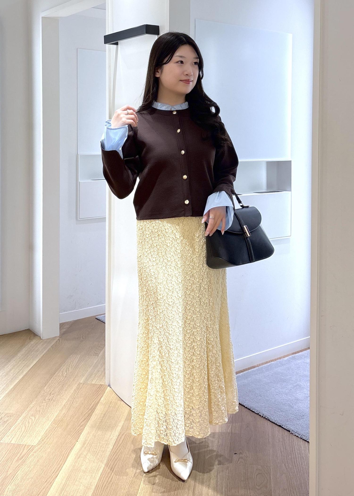 ブラウン×ブルーのトレンドカラーを取り入れ、きちんと感あるレーススカートで合わせたコーデです。