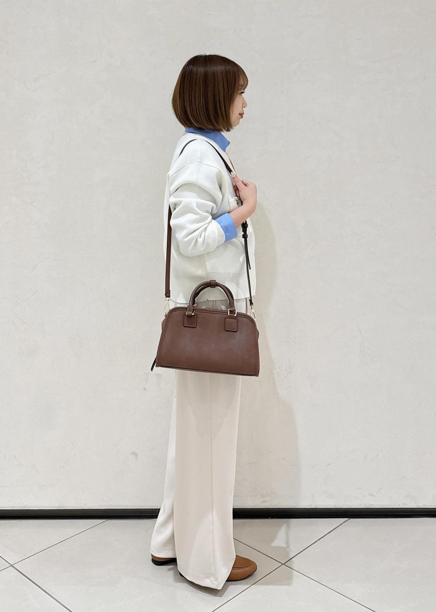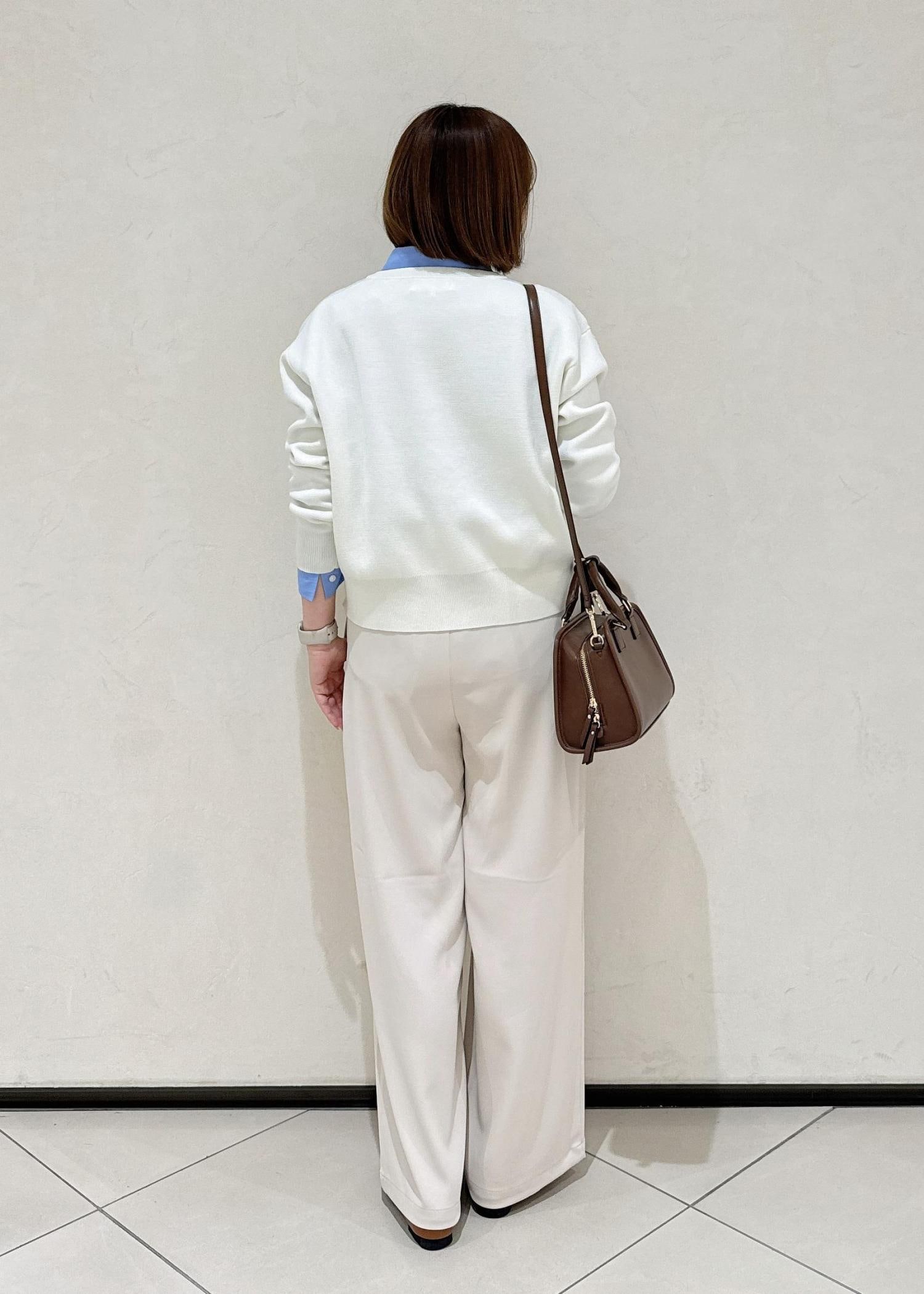 白のカーディガンとパンツで春らしいワントーンでまとめました。差し色でブルーのシャツを着て、ぼんやりなりすぎないようにしました。