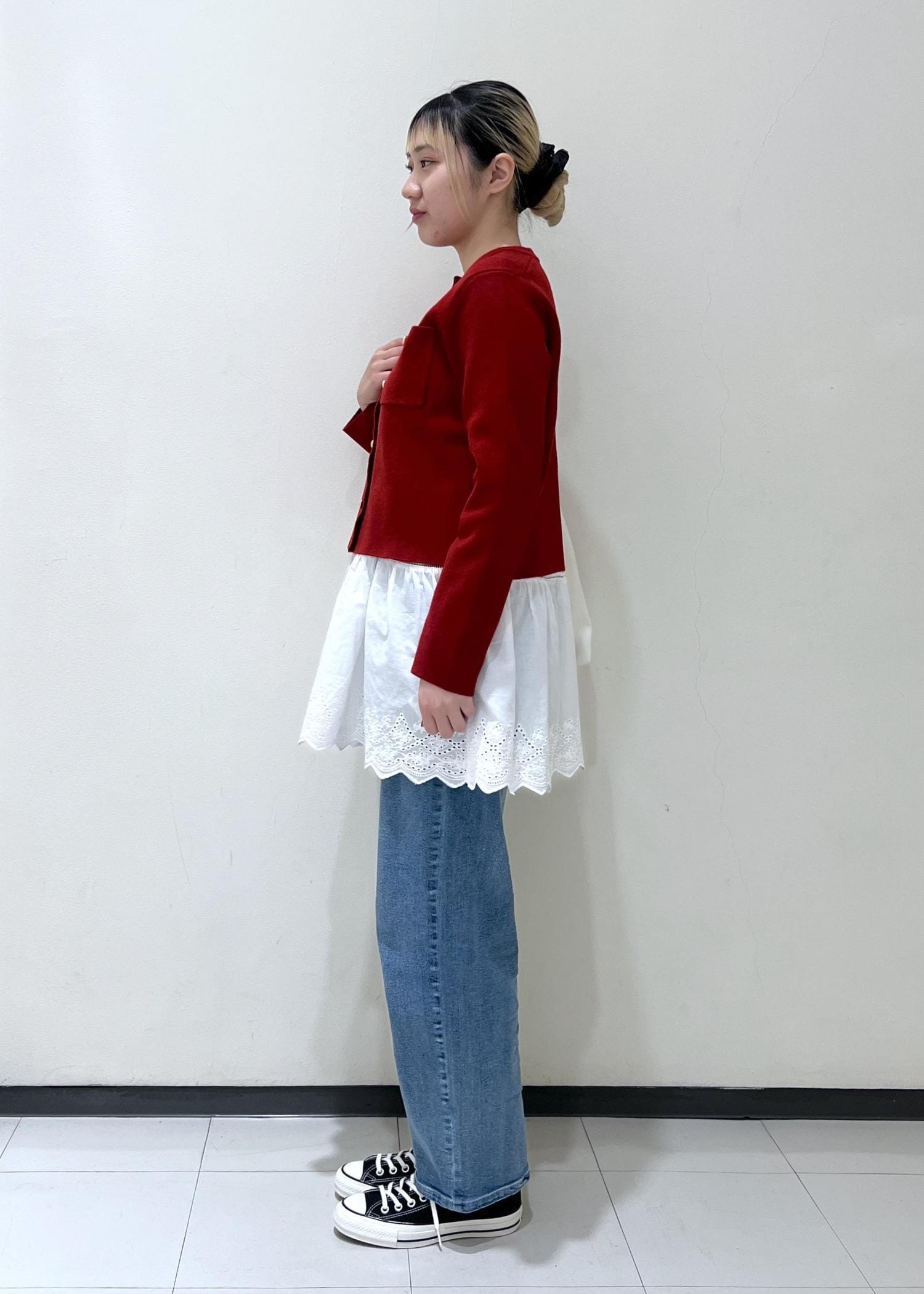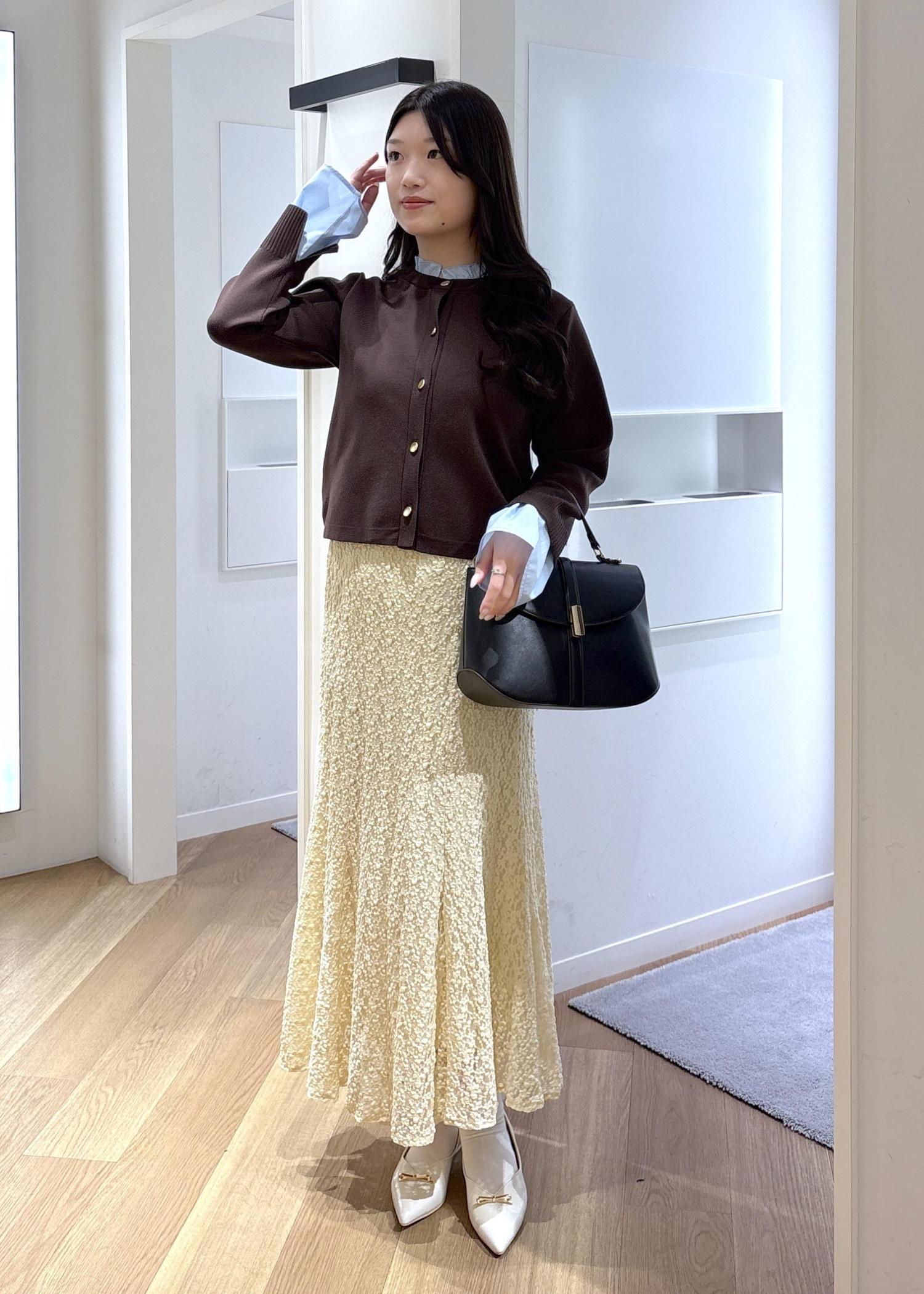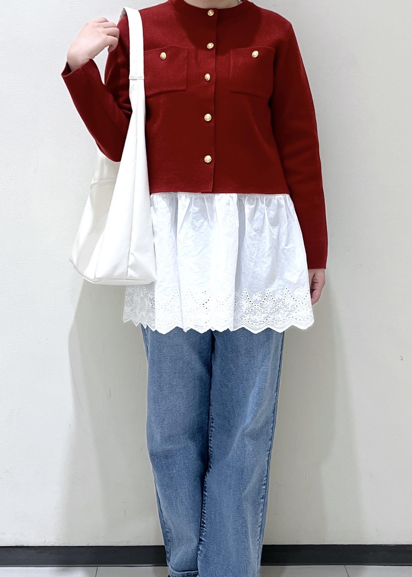 デニムはハイウエストなのでよりバランスをよくするためにカーディガンはあえて丈が短いMサイズにしました。
