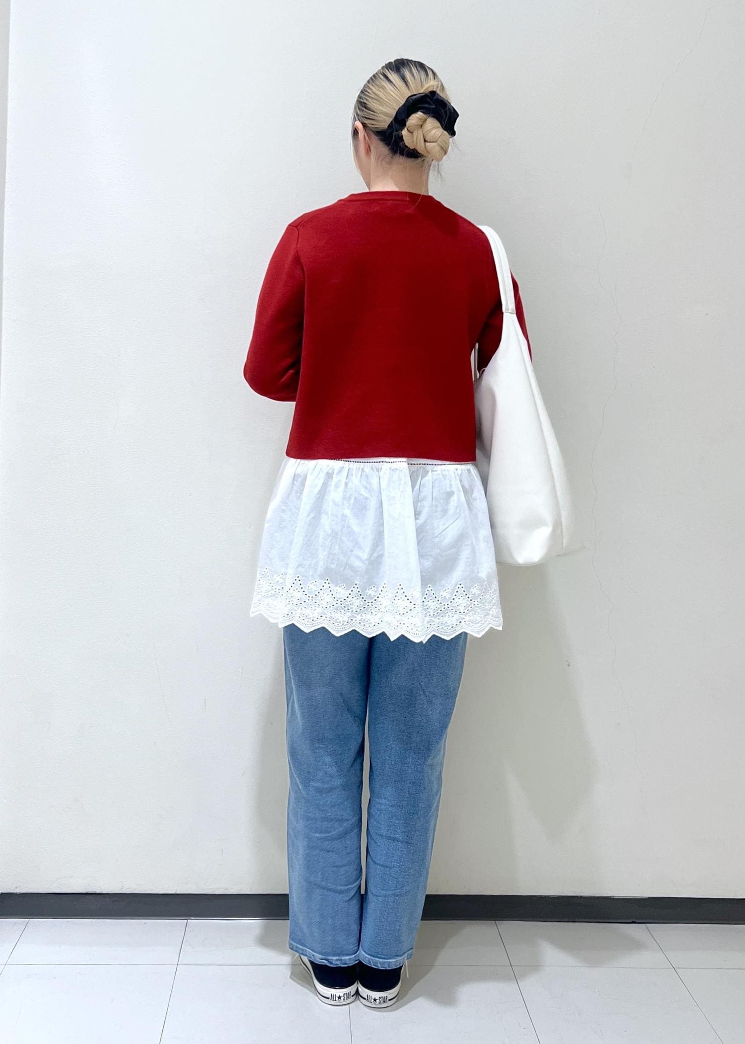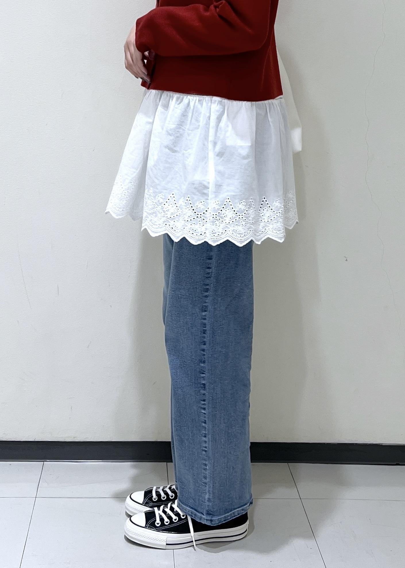 ミラノリブカーディガンとデニムだけではシンプルになってしまうので白レースを合わせることで抜け感プラスしました◎