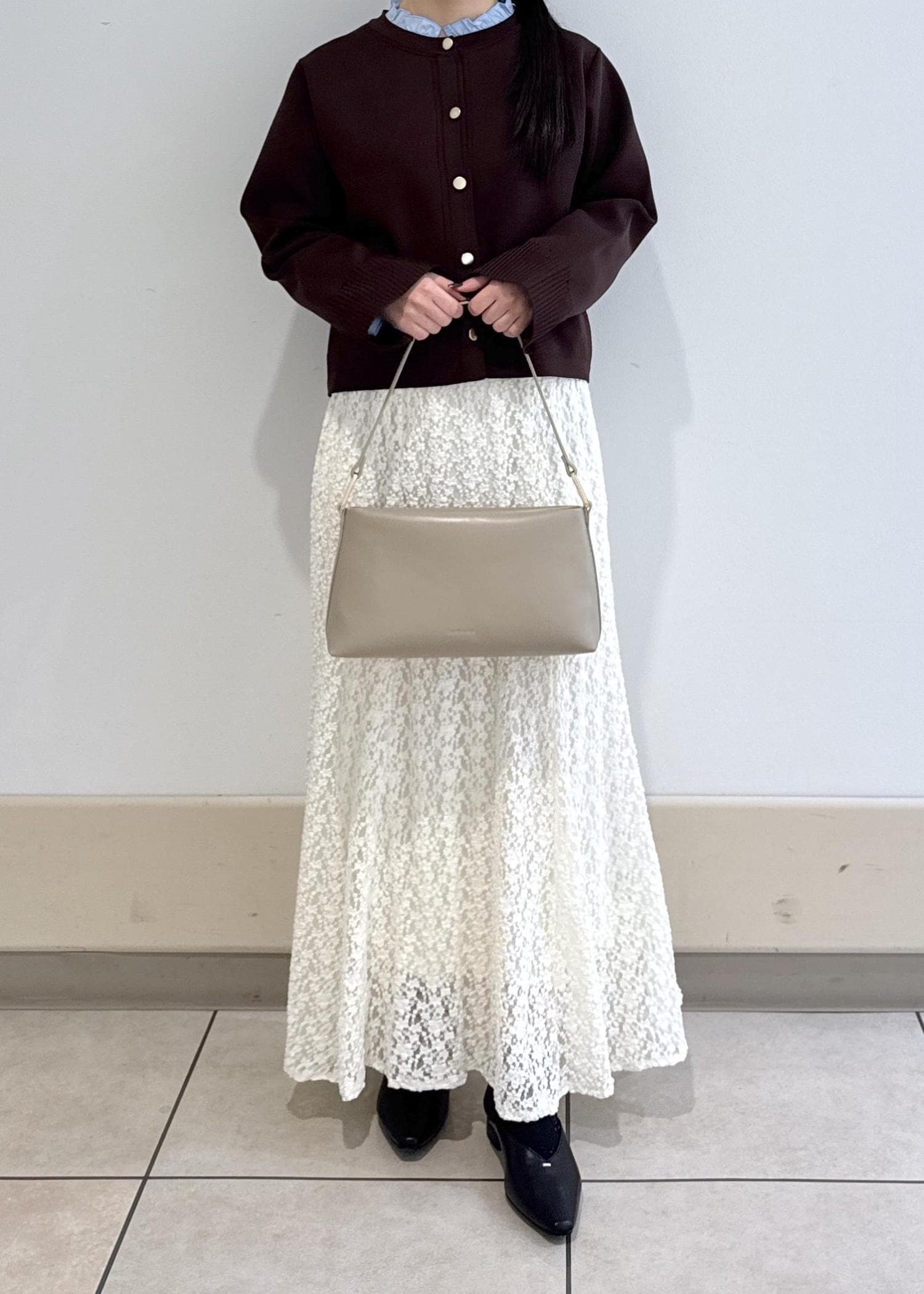 フリルとの合わせがポイントのカーディガンと刺繍スカートの組み合わせが上品なスタイリングです!