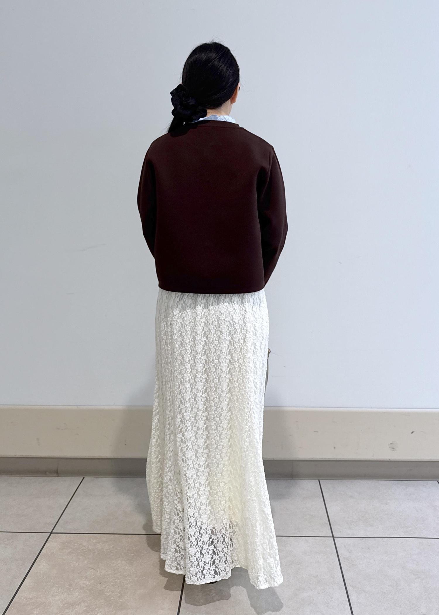 少し丈間が短めのトップスと、マーメイドスカートの合わせは、全体的なシルエットをきれいに見せてくれます!