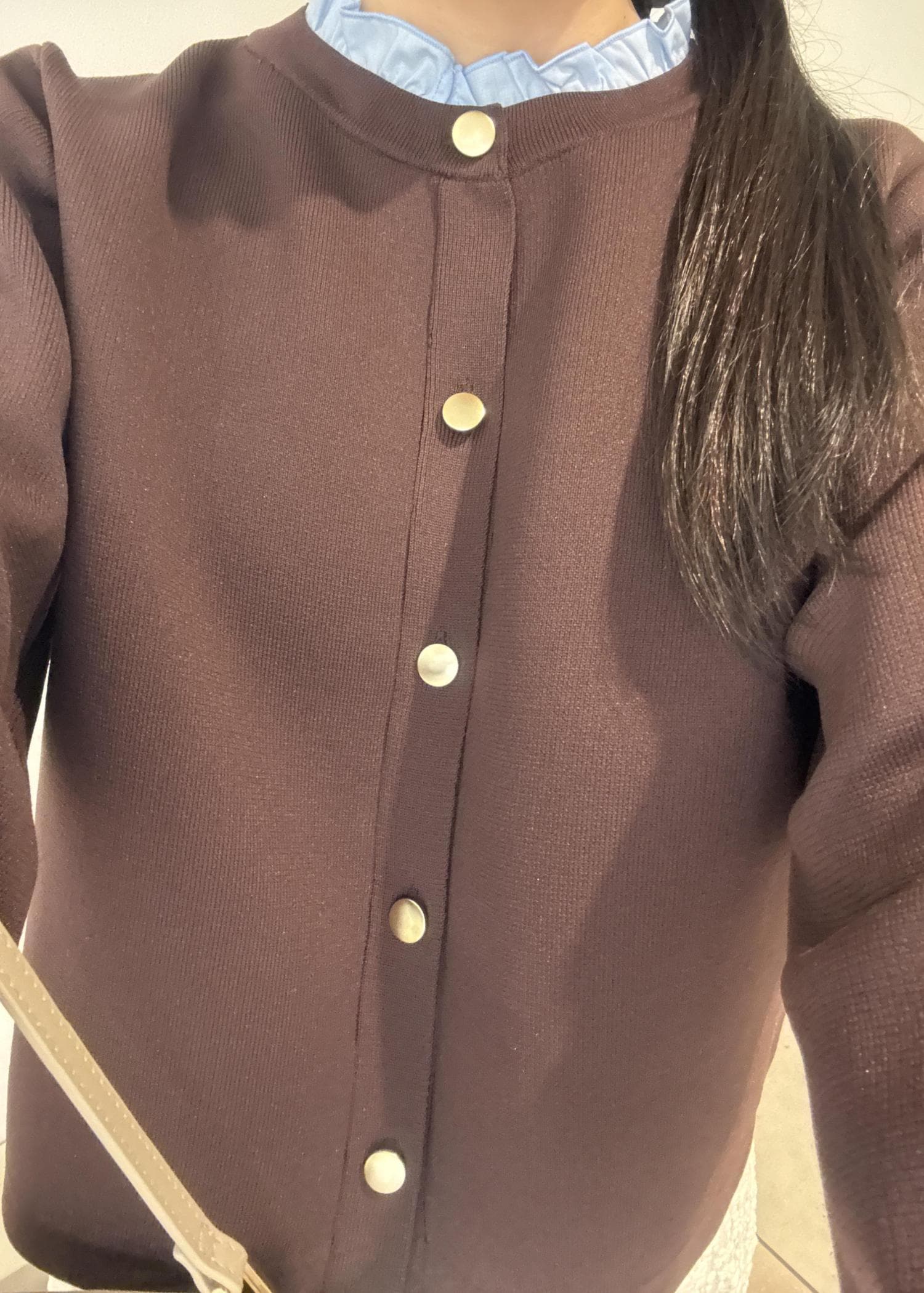 ROPÉ PICNIC襟フリルドッキングカーディガンダークブラウン / F¥5,995レビュー短すぎず長すぎないちょうどいい丈間なカーディガン!