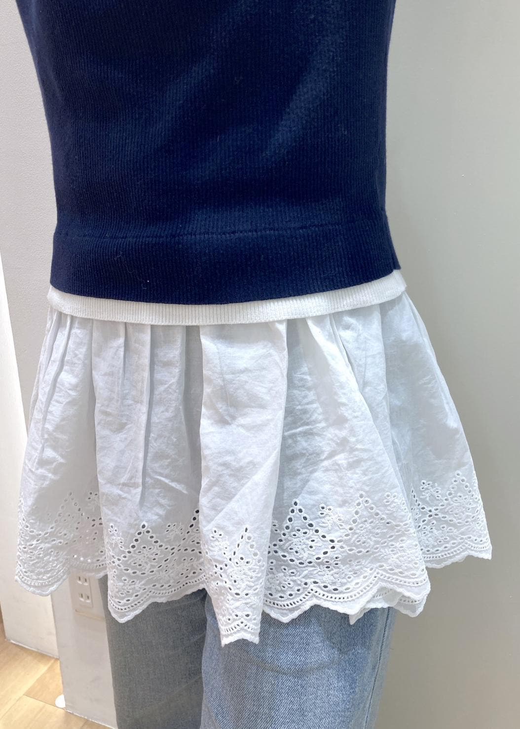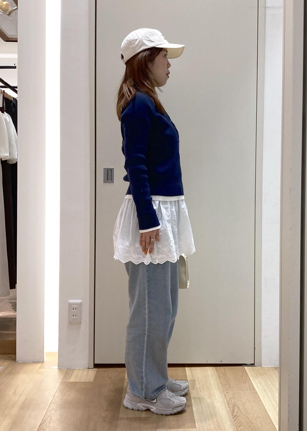 レイヤードしているかのようなデザインのニットポロとデニムに、レースキャミをプラスして、体型カバーとコーディネートのアクセントになるようにしました。