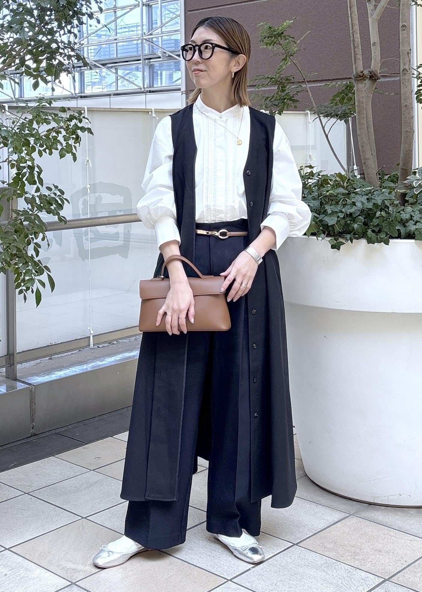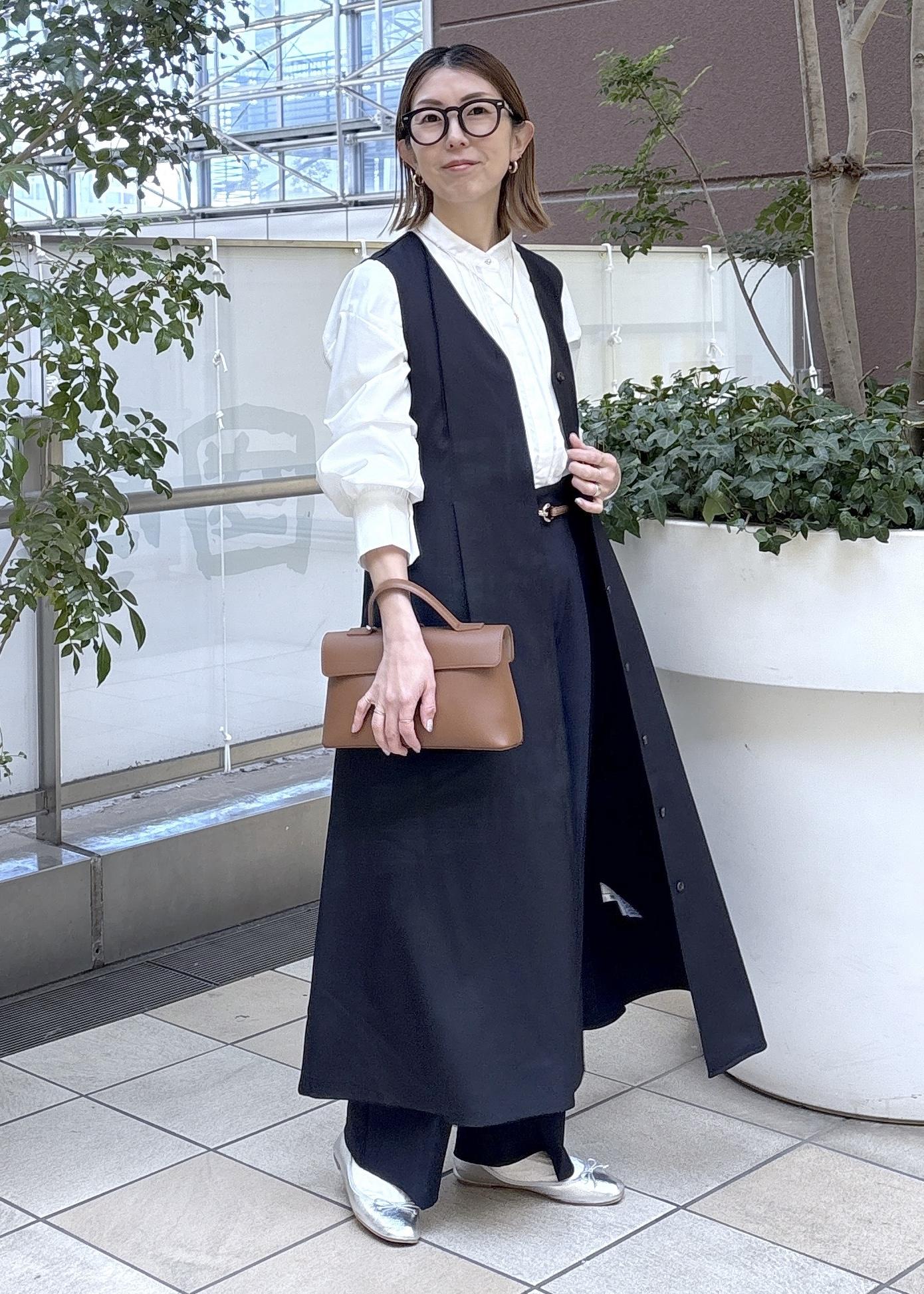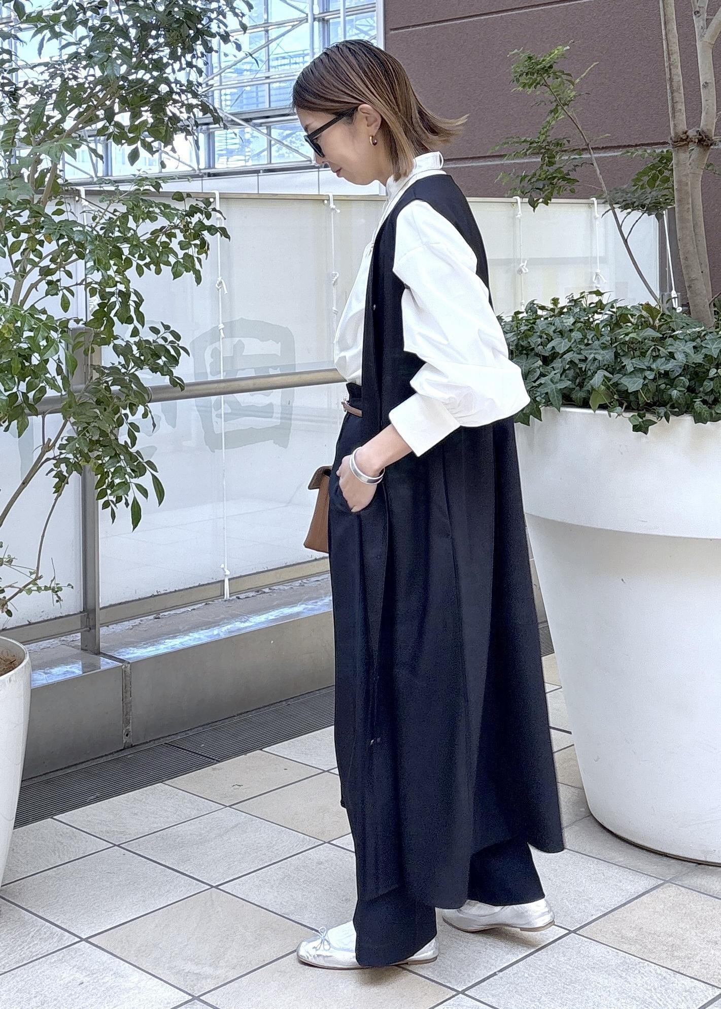 ジャンパースカートをジレ風に着たお仕事にもピッタリのスタイリングです。
