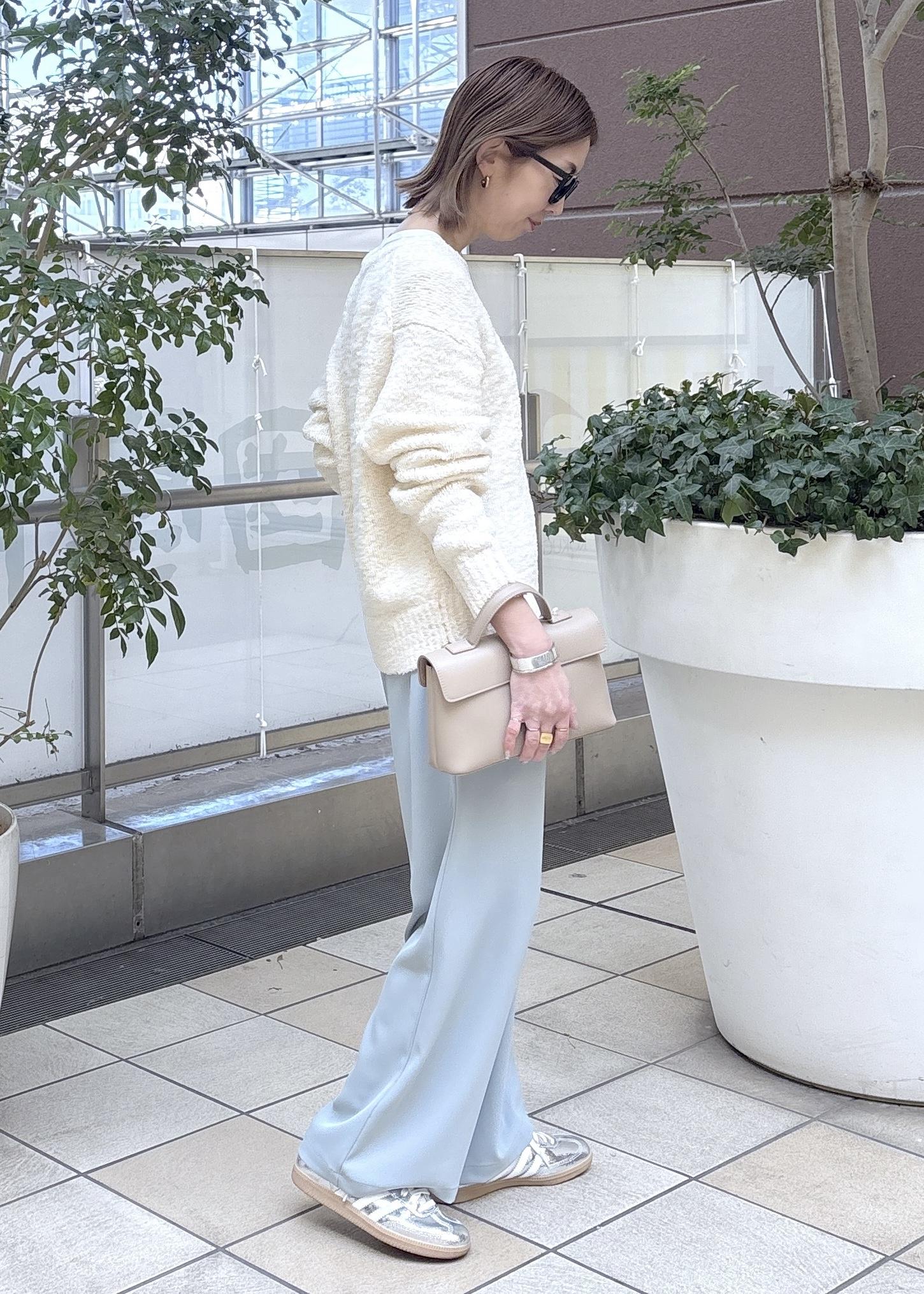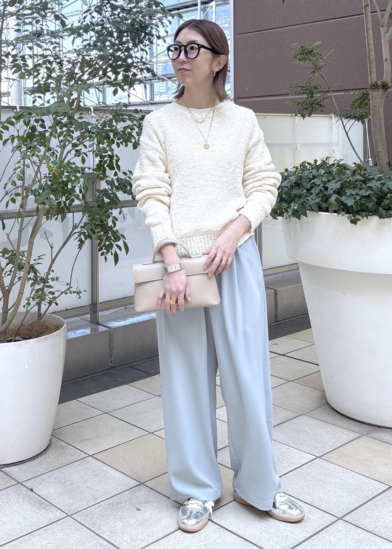 さりげないラメが光るニットと合わせで春らしいスタイリングに