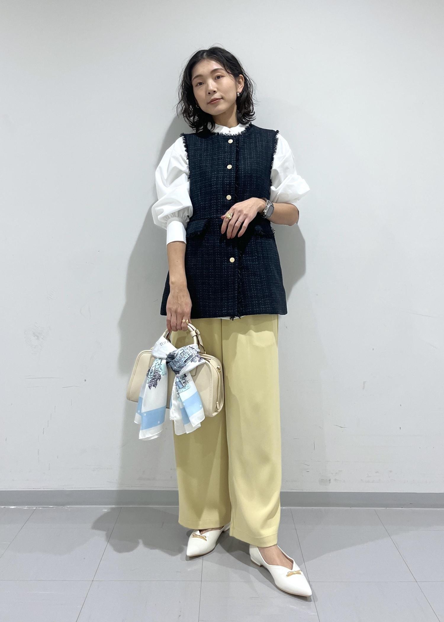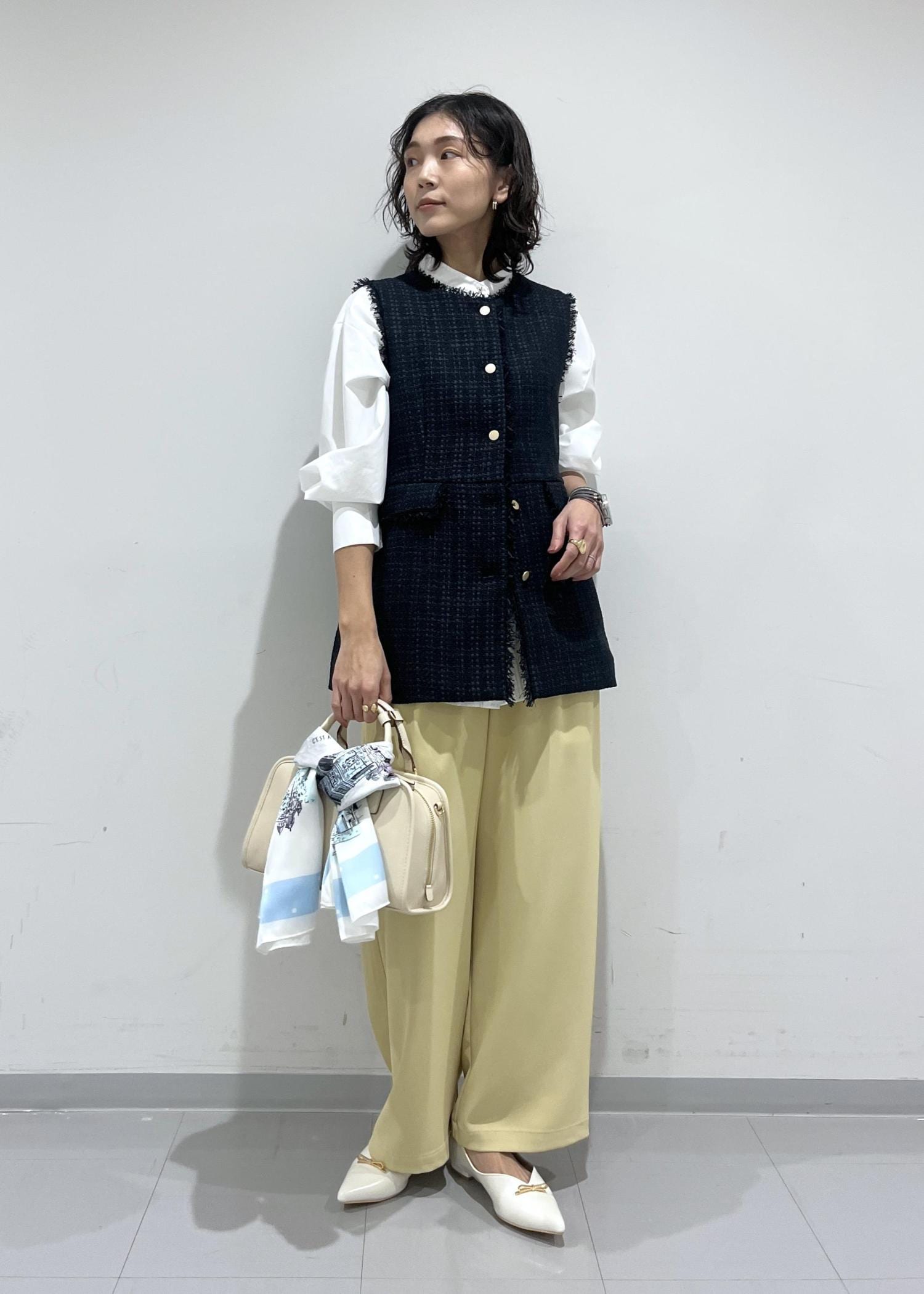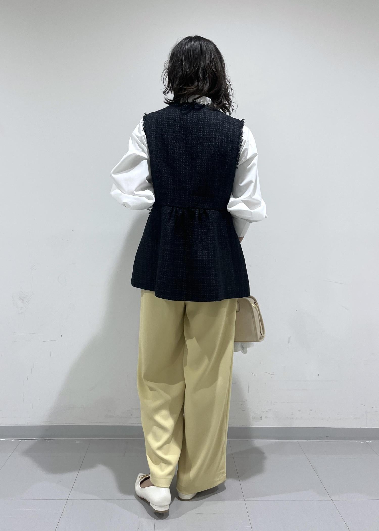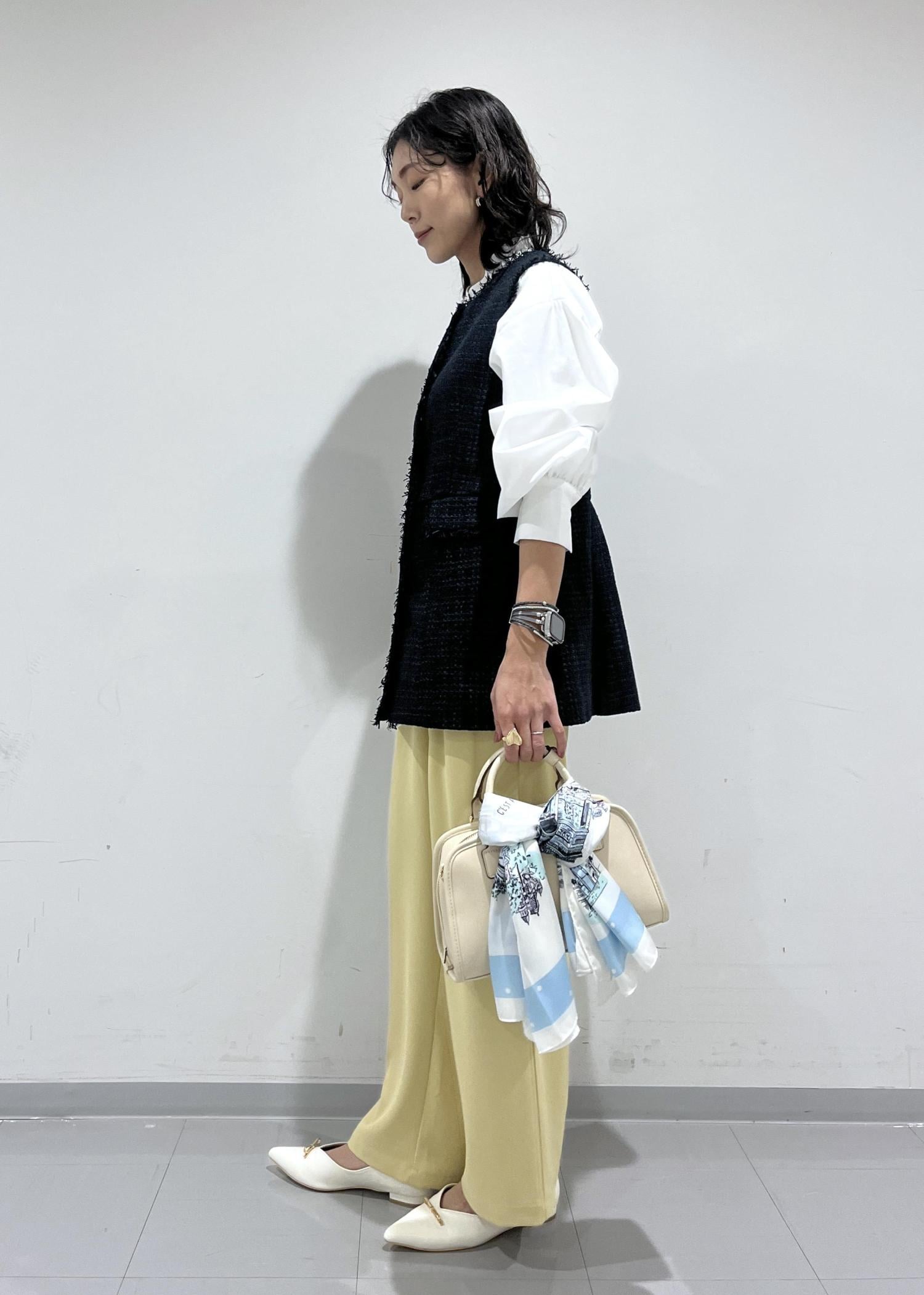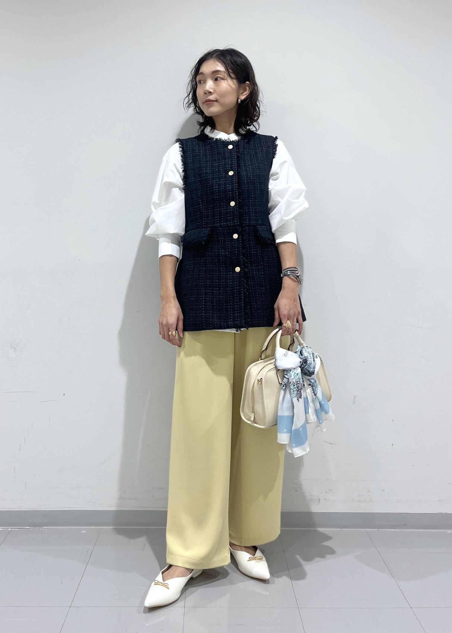 長めのワイドパンツももたついた印象なく合わせられます。 -