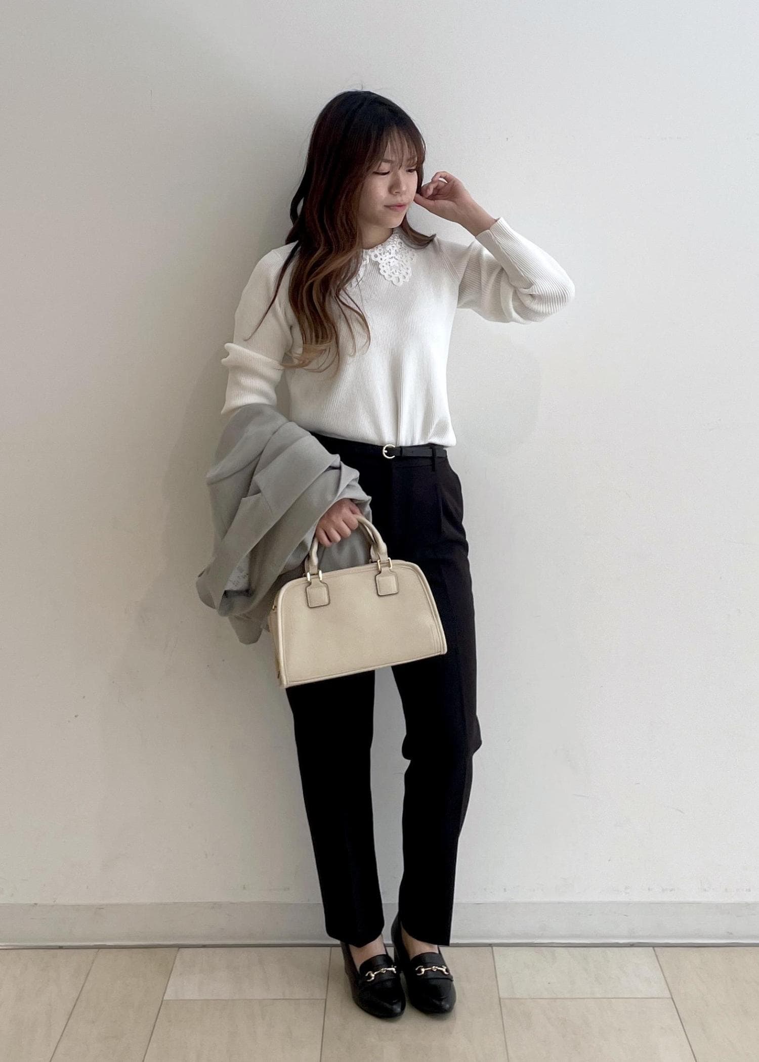 ブラウスではなくニット系を合わせることで、今時期から先取りして着れます◎