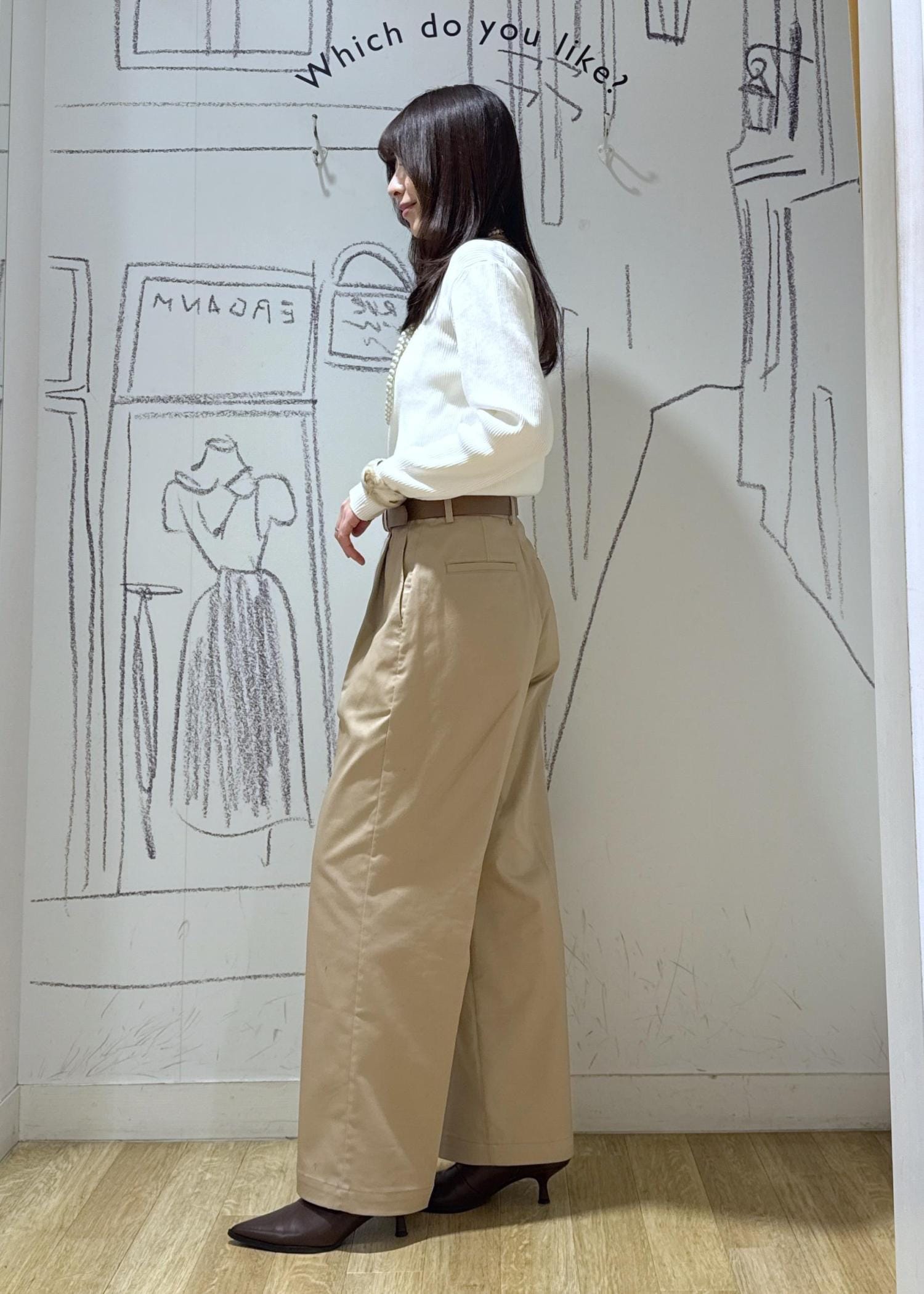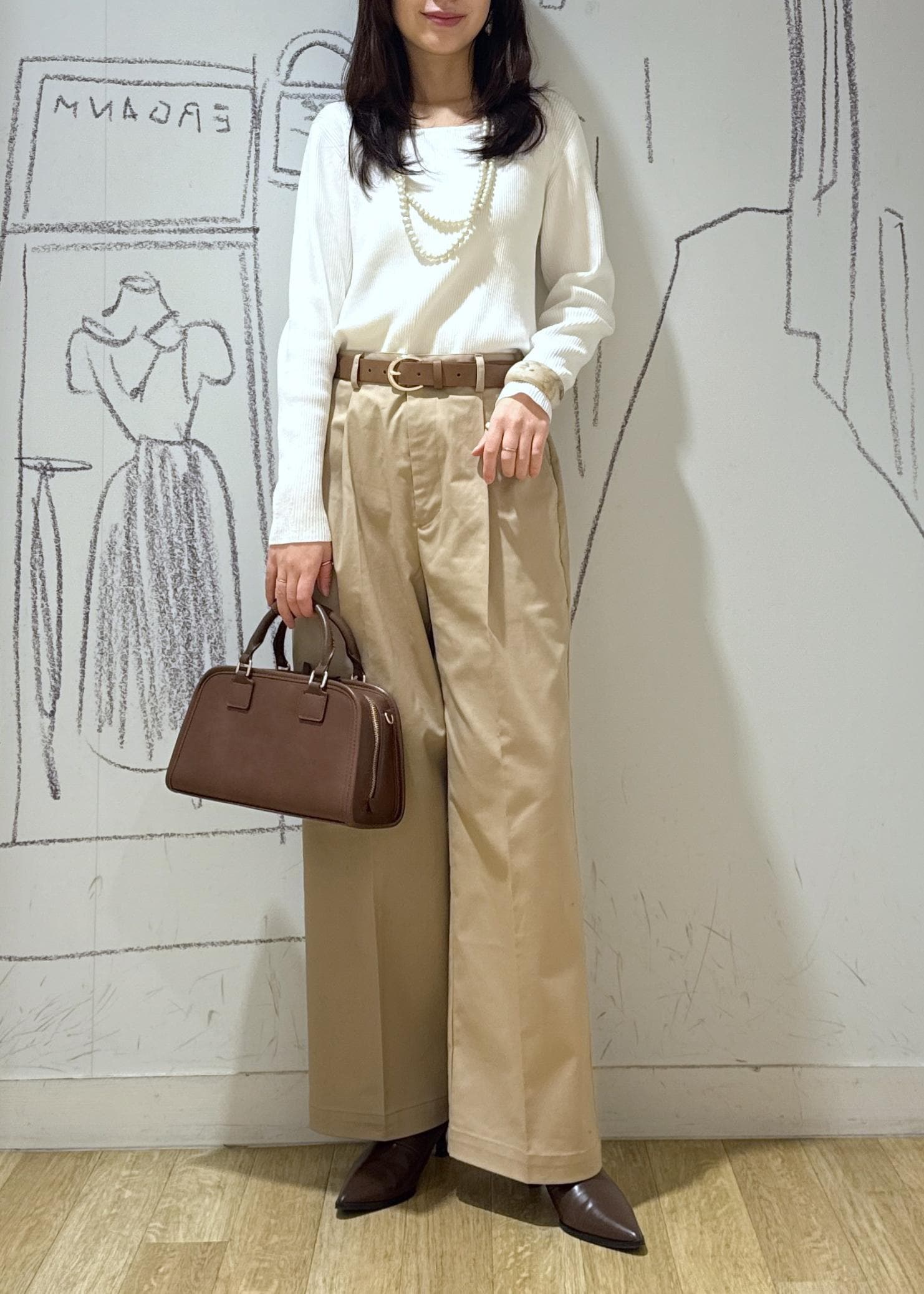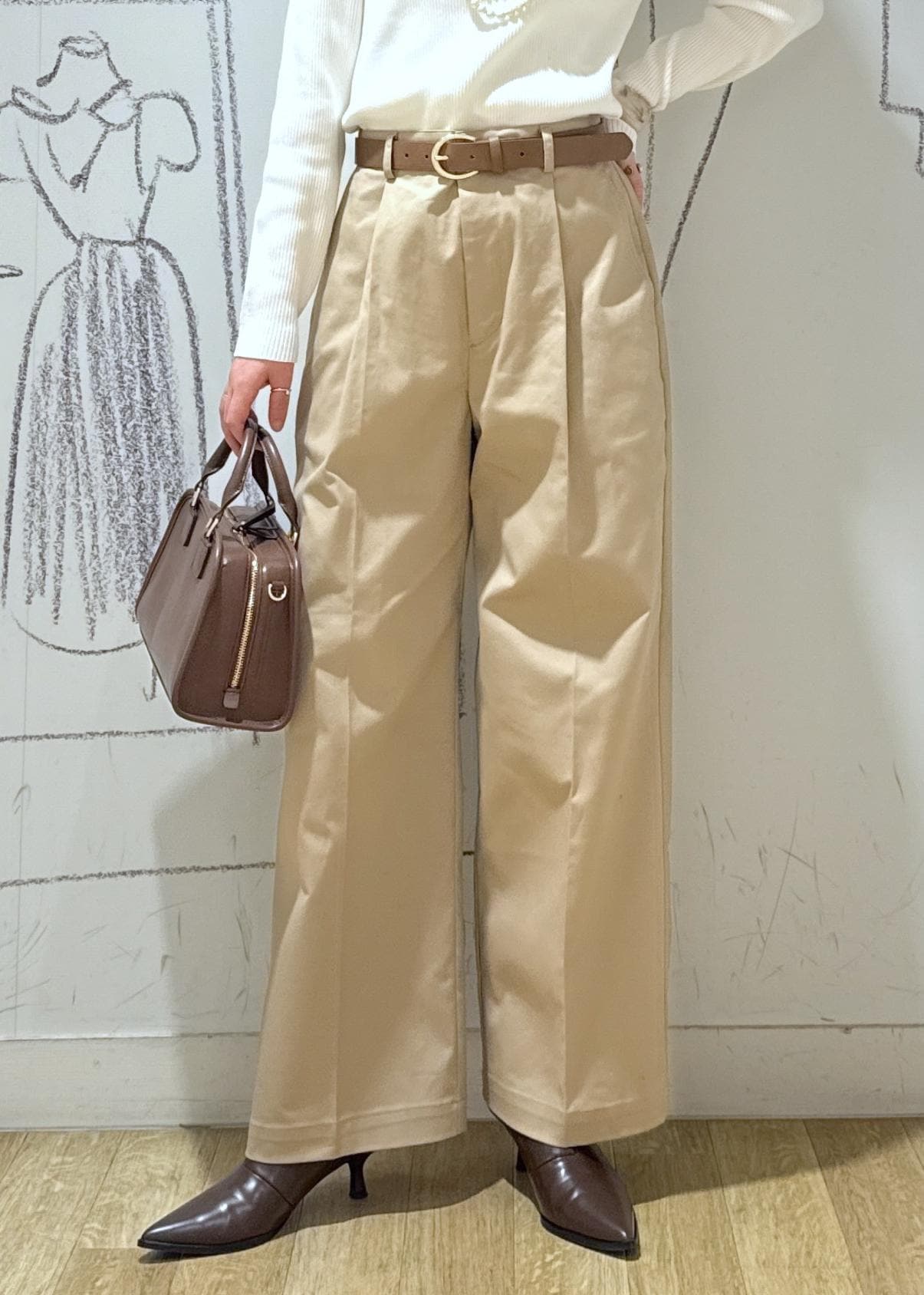 ROPÉ PICNICウエストタックチノパンツベージュ / M¥6,490レビューパリッとハリのある生地感で脚のラインを拾わず履くことが出来ます。ハイウエスト寄りなので骨格ウェーブにとっては嬉しいデザイン。着丈は足の甲に軽く掛かる長さ。