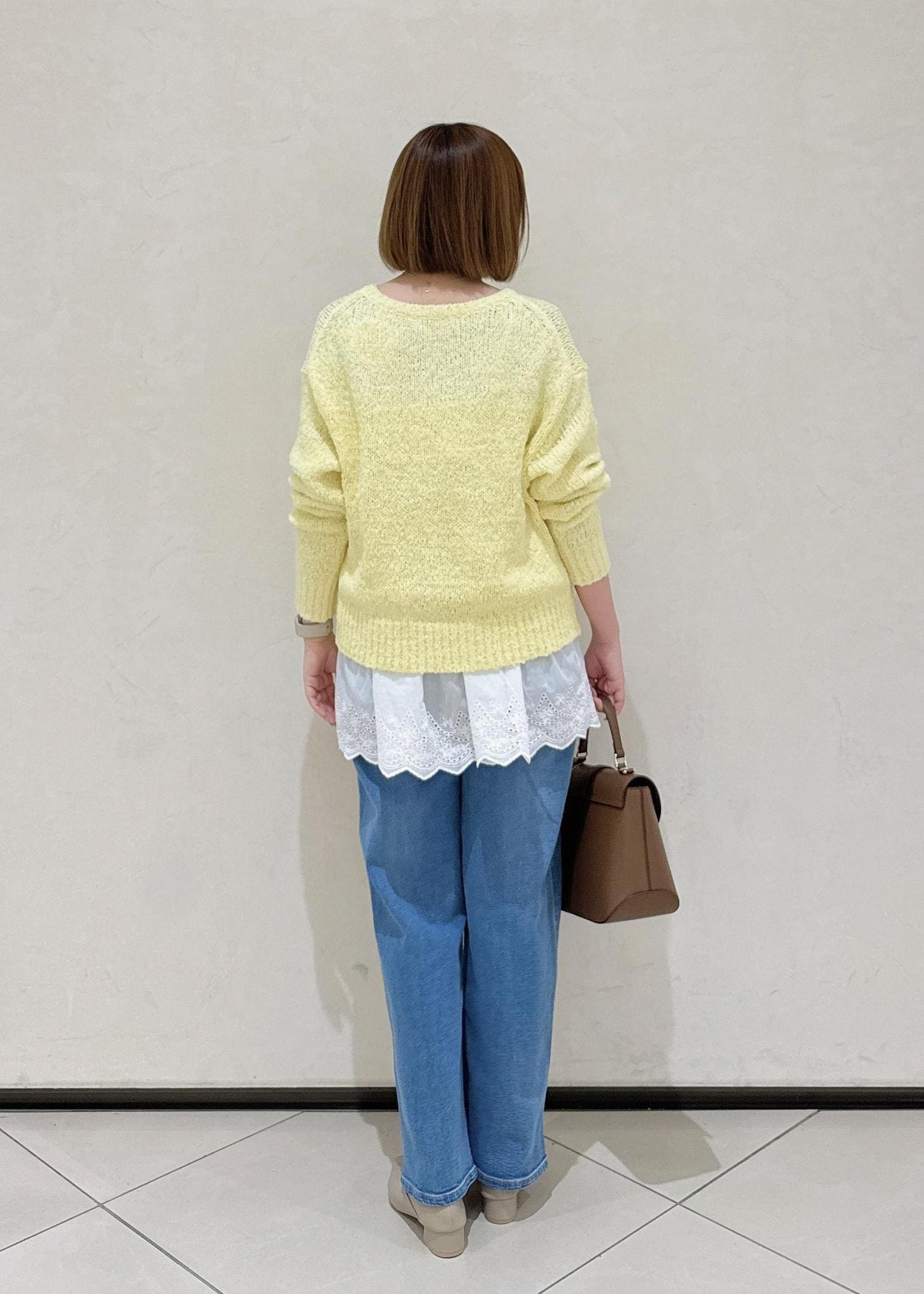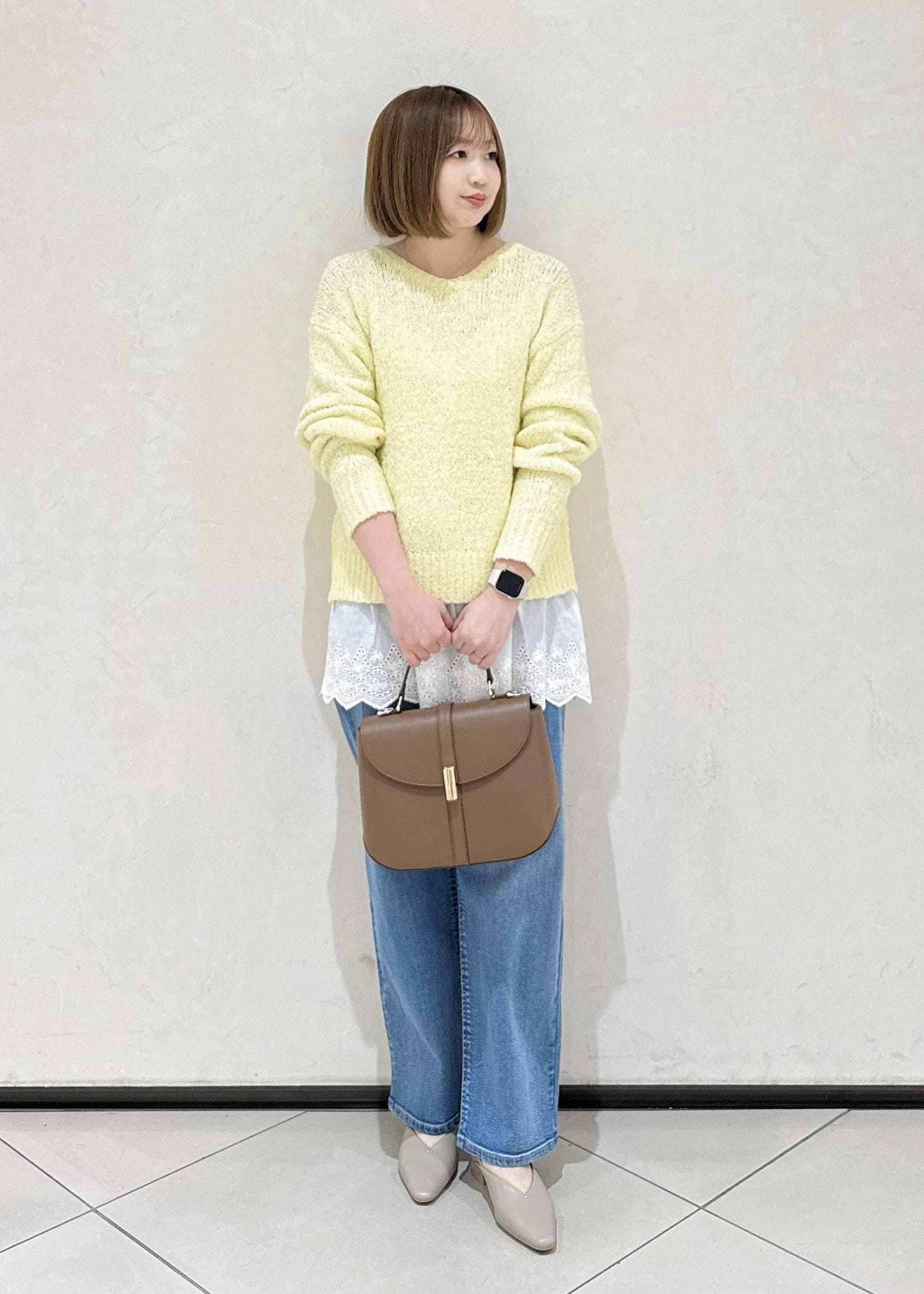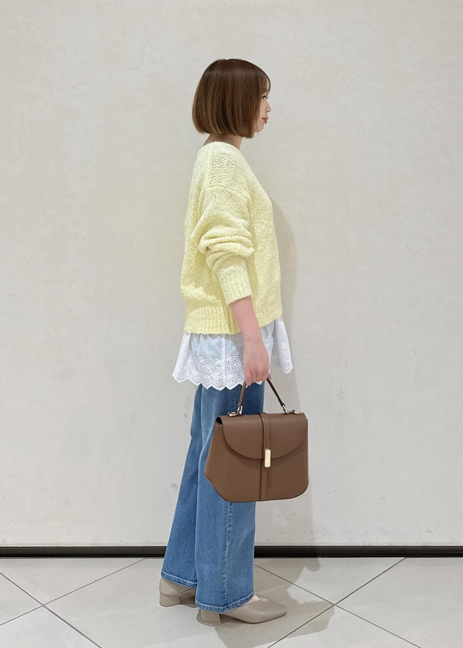 イエローのニットにデニムで春らしいコーデです。