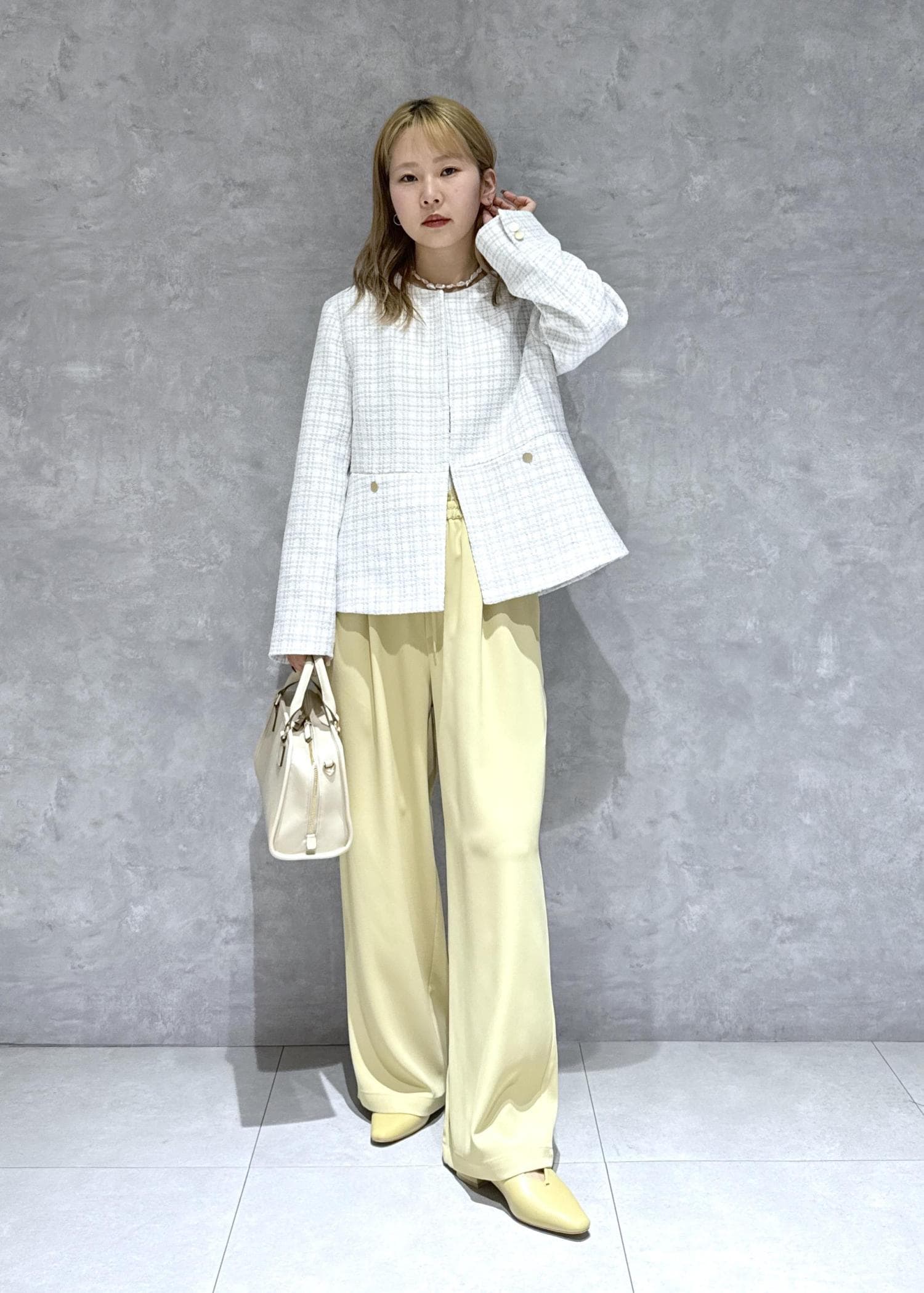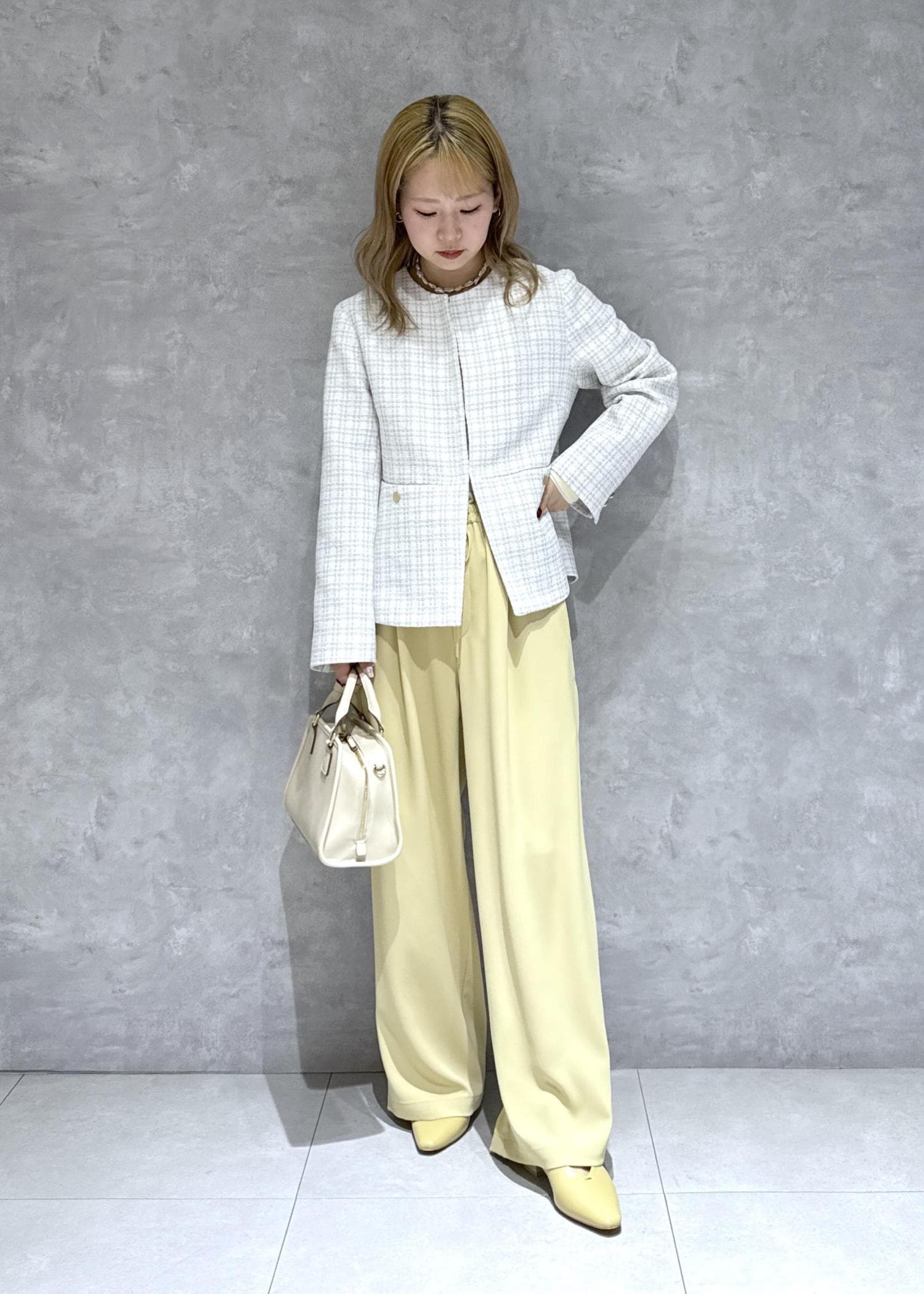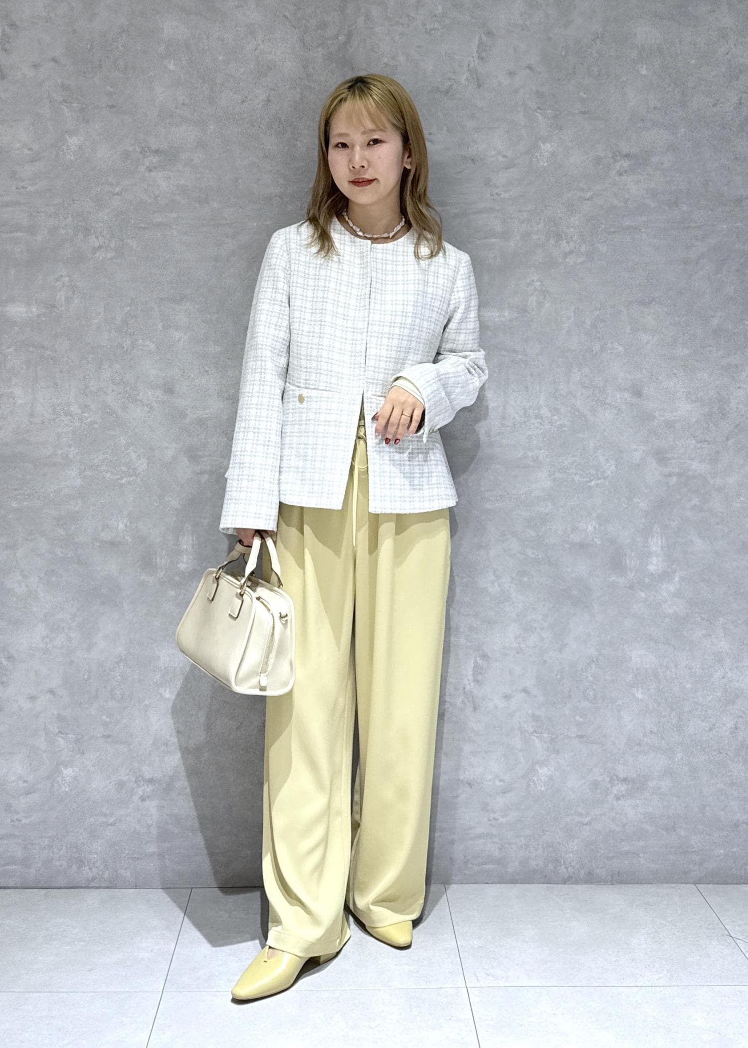 春らしいレモンイエローをポイントに綺麗めコーデにまとめました。