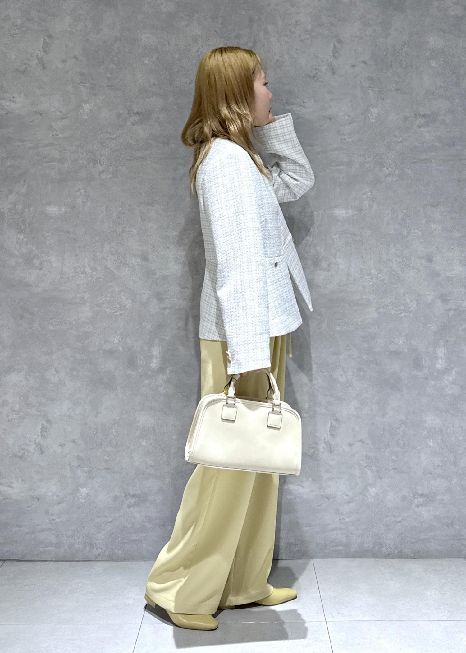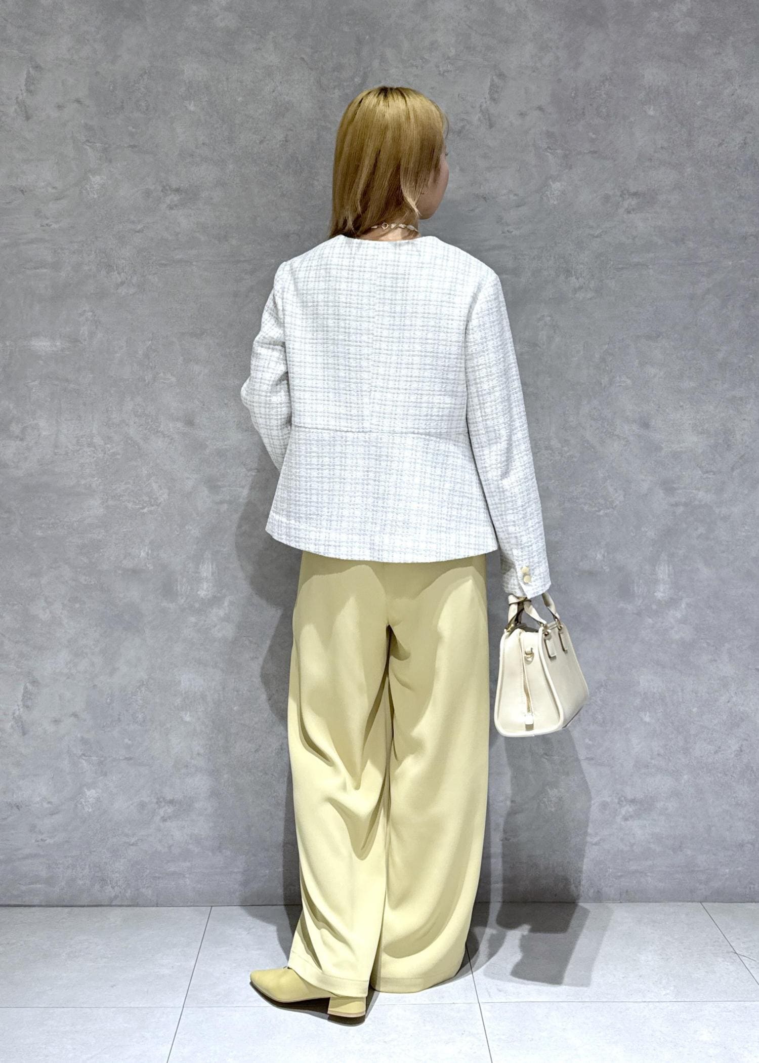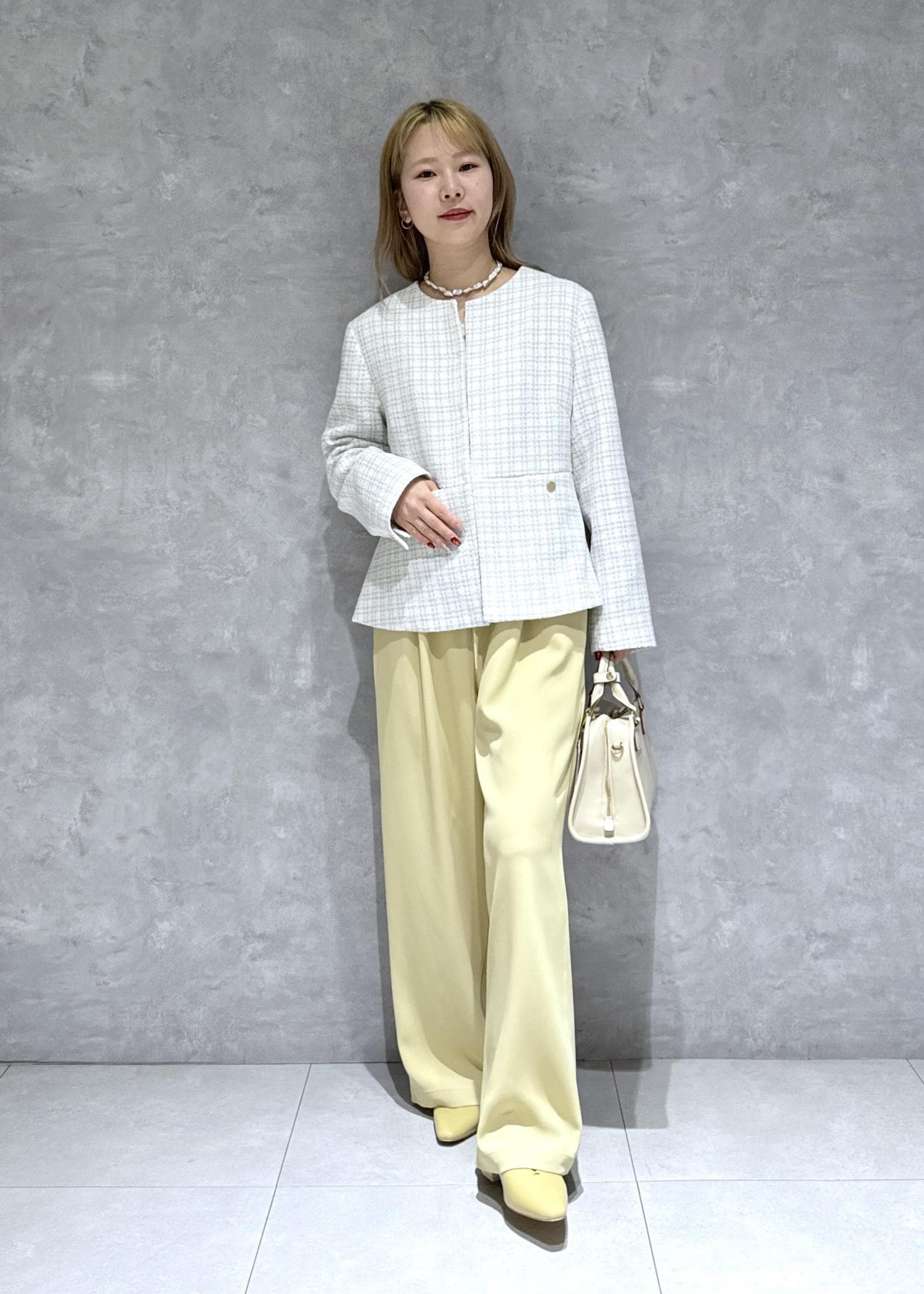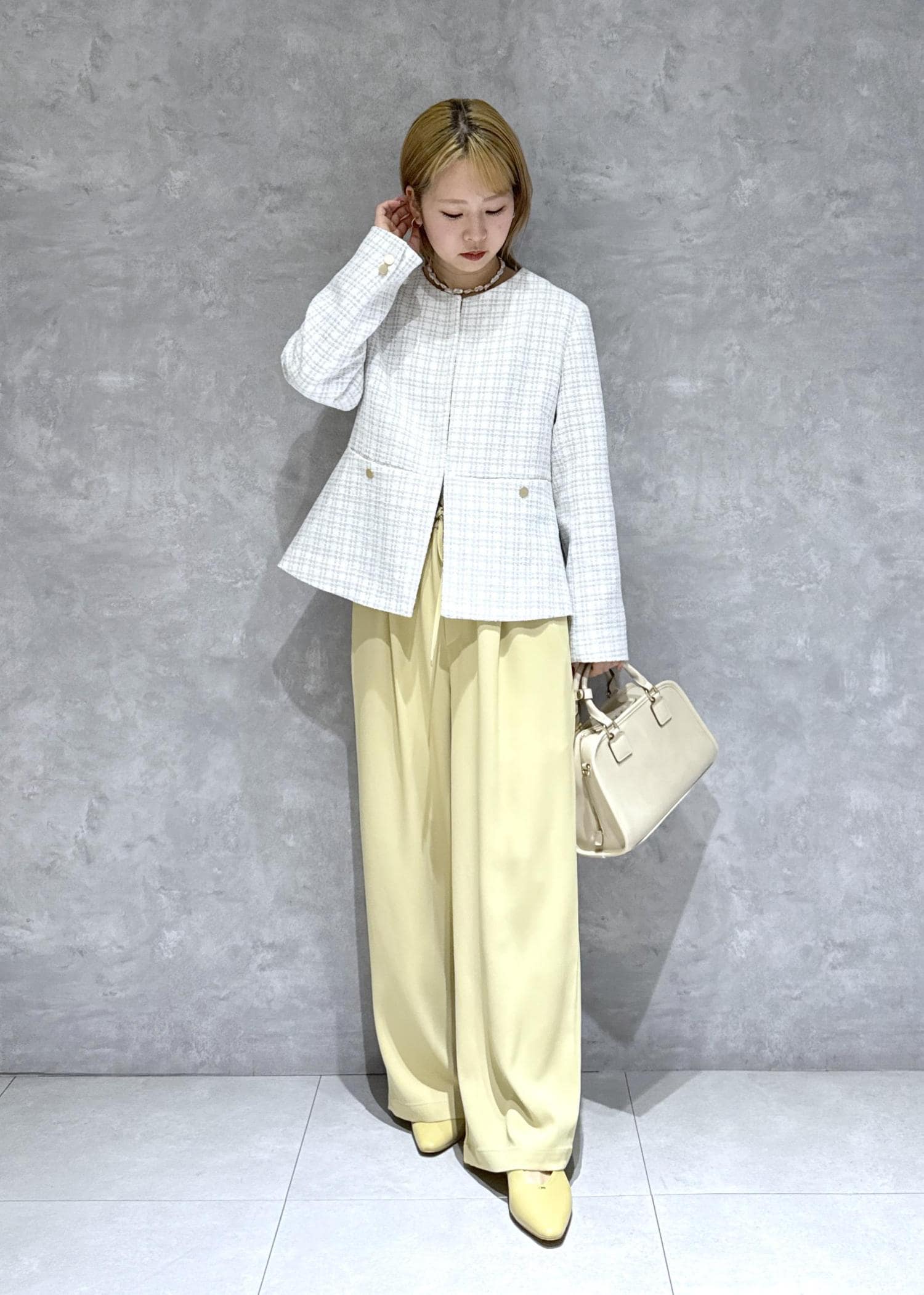 春らしいレモンイエローをポイントに綺麗めコーデにまとめました。