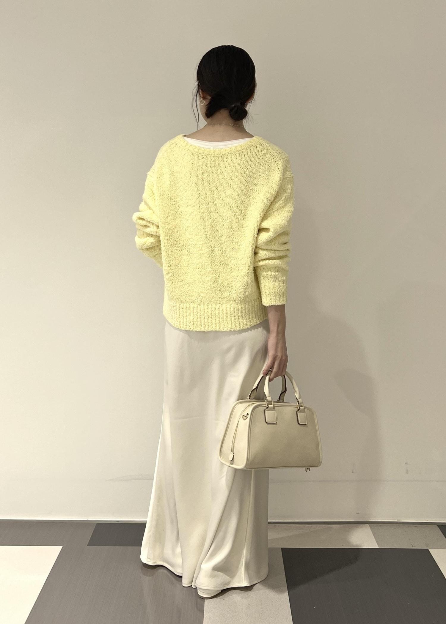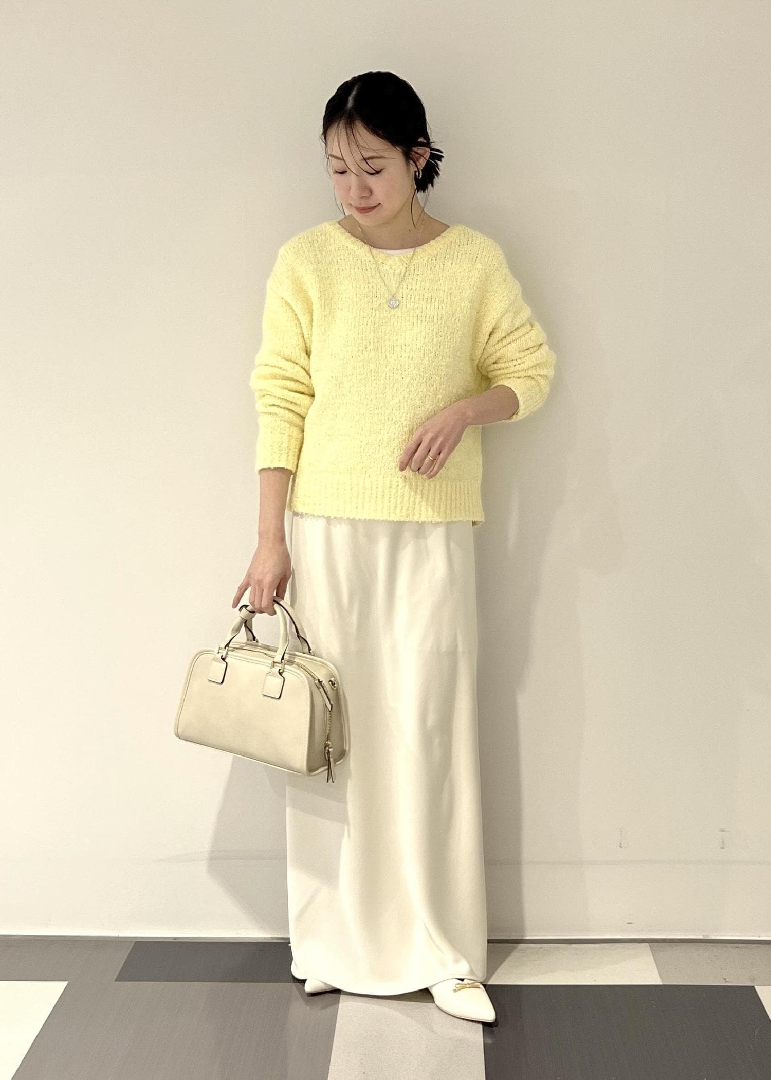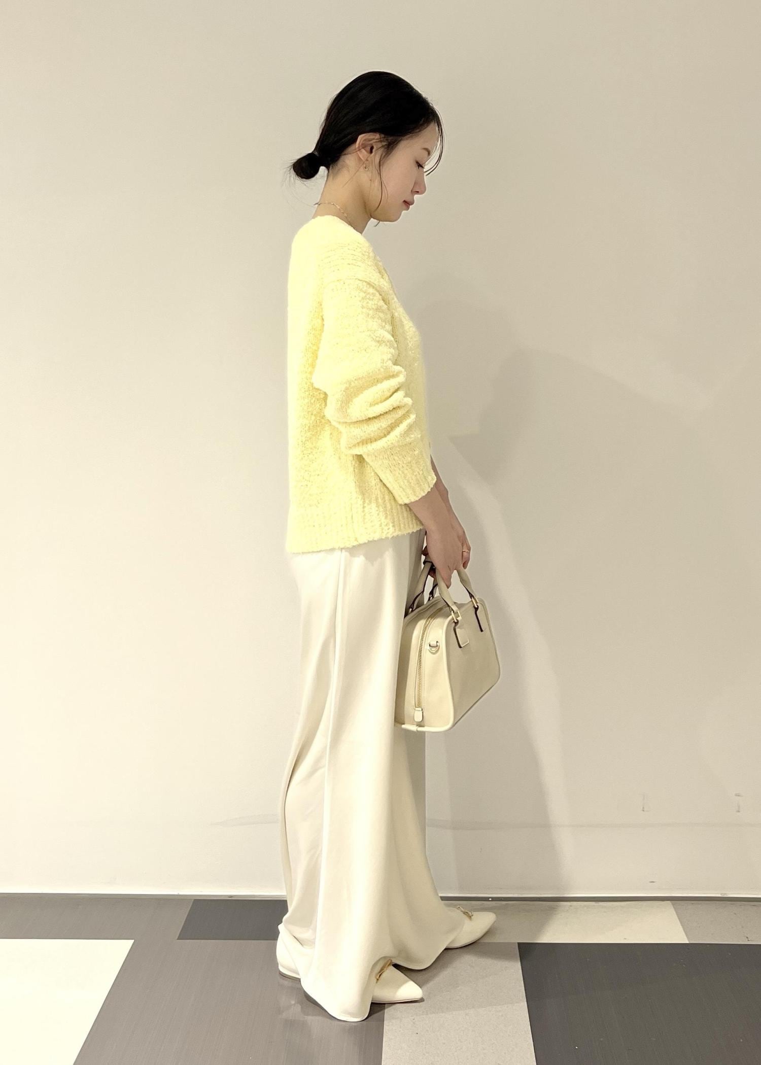 イエローのニットをホワイトアイテムで合わせて、きれいめなスタイリングに。