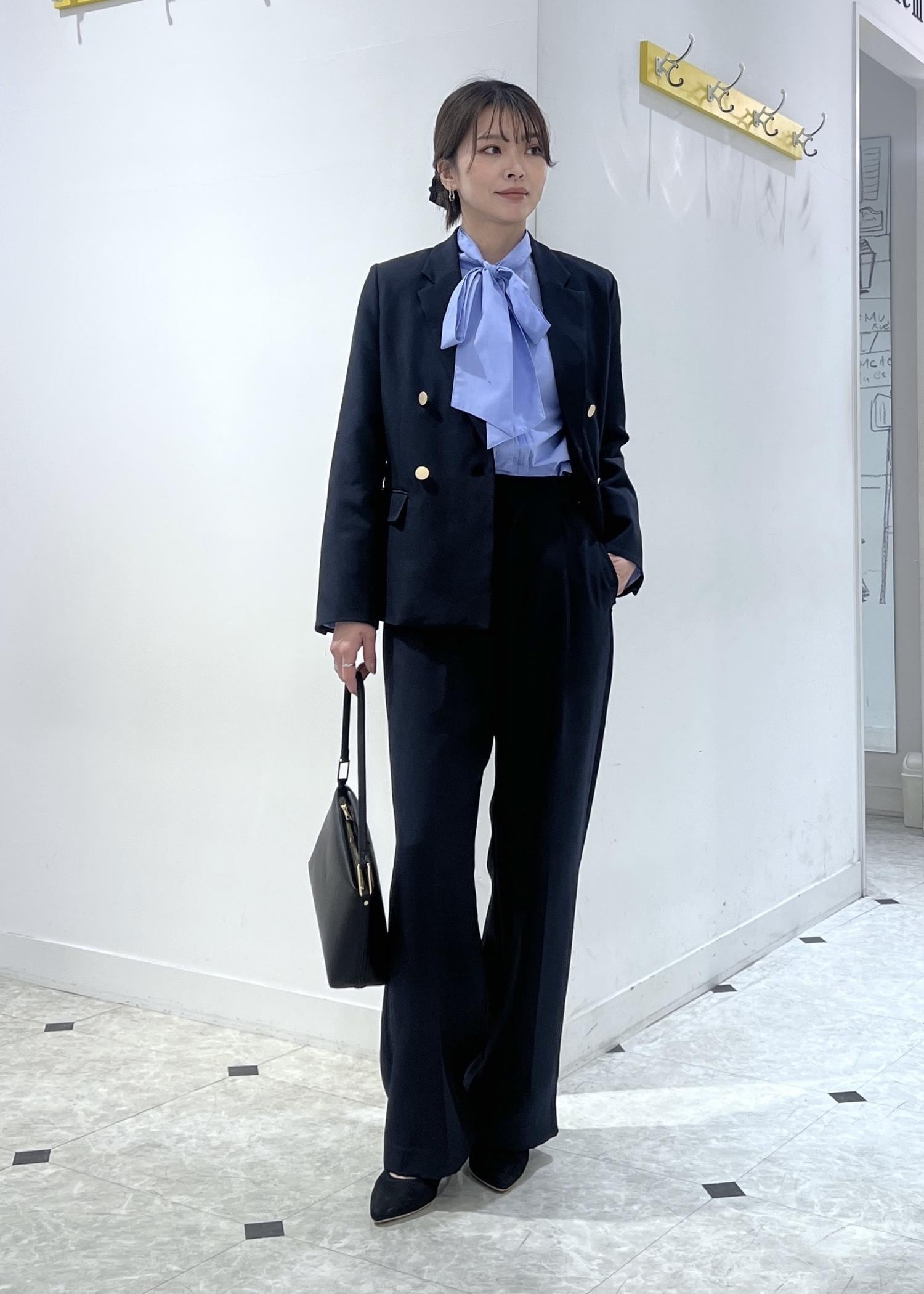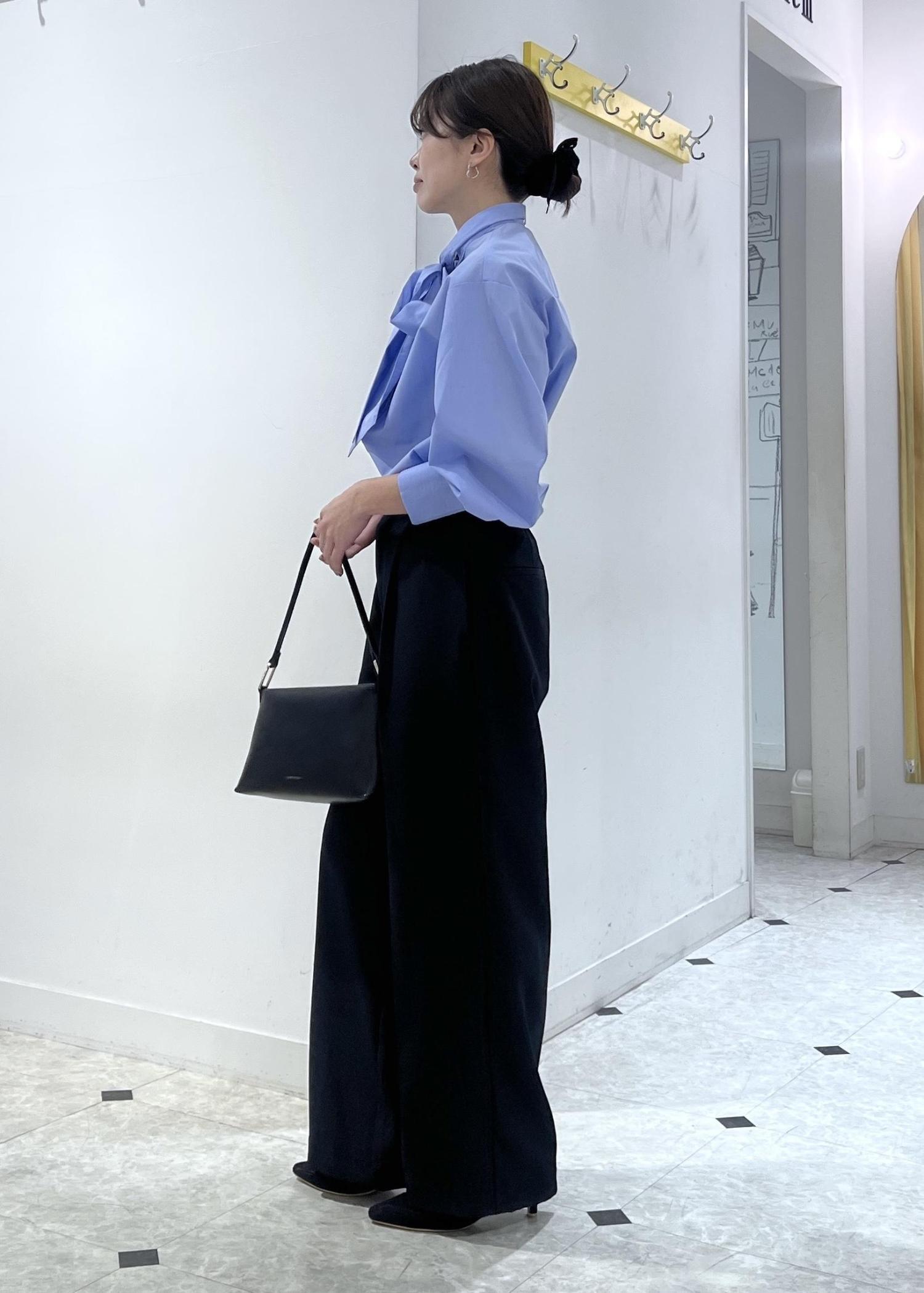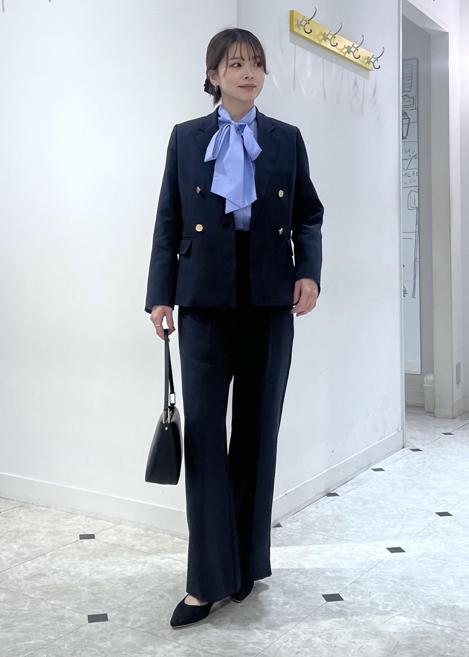 華やかさのあるリボンタイのブルーシャツは、卒入学式にぴったりのブラウス。