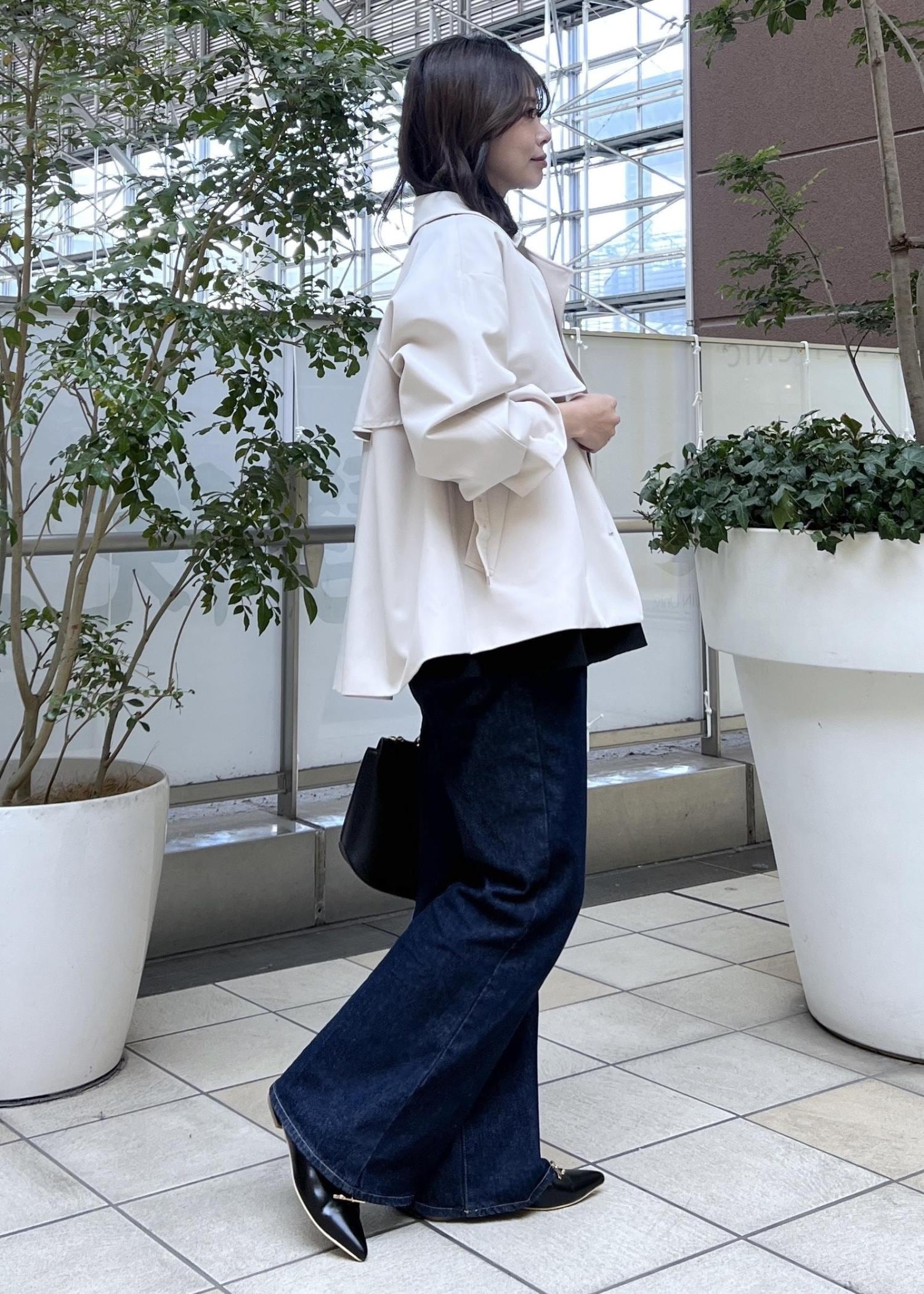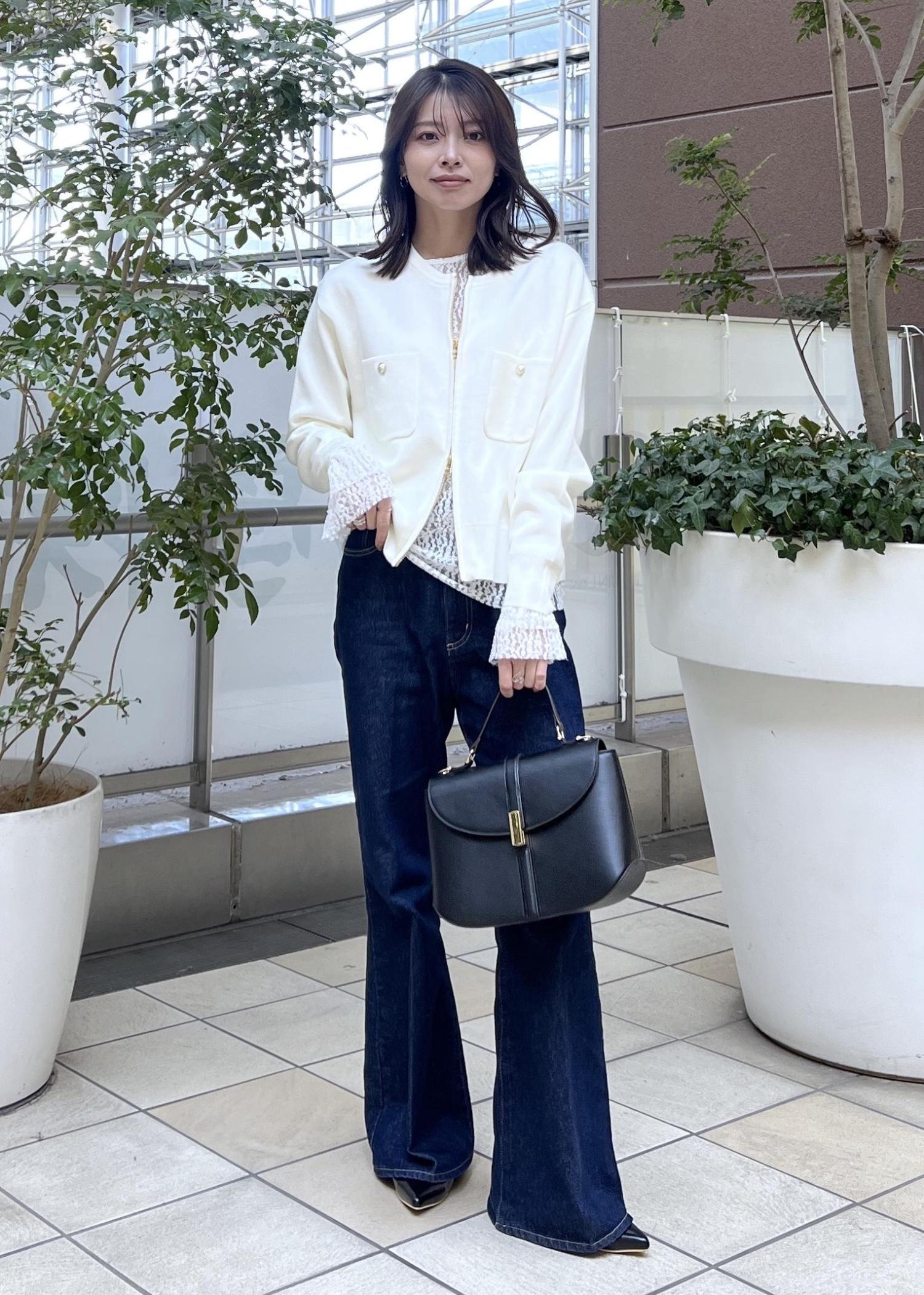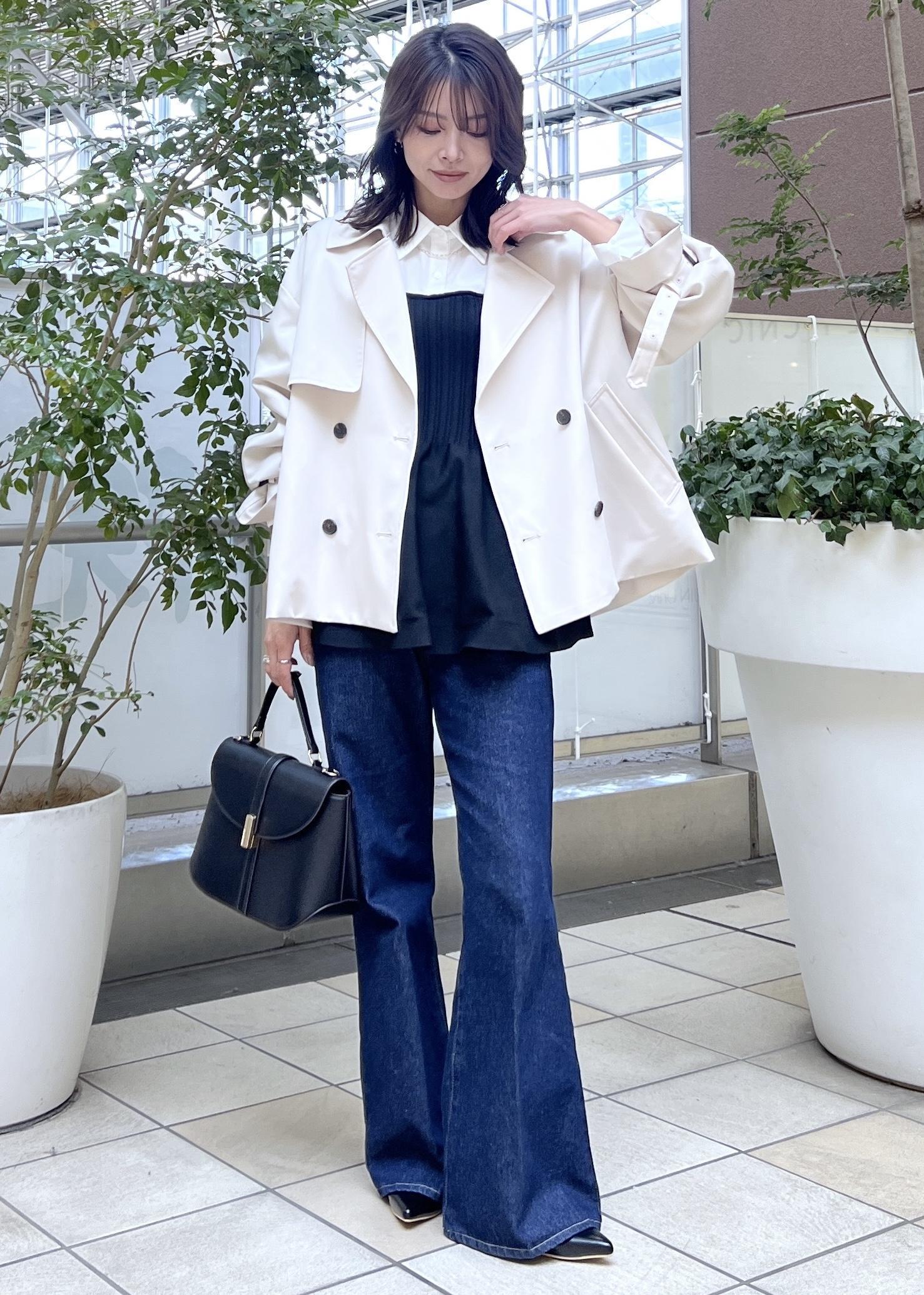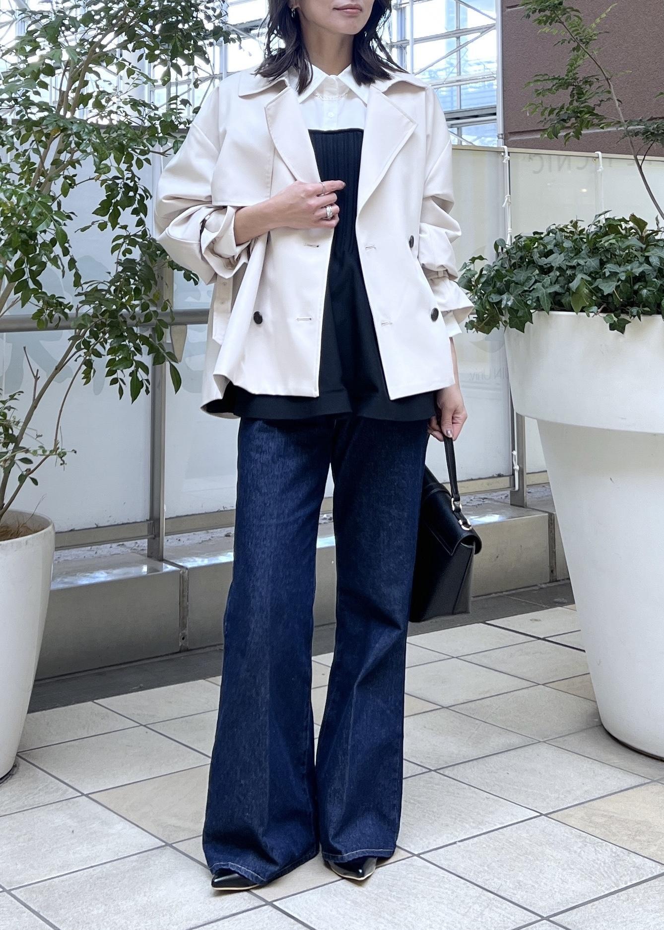 フレアパンツを合わせて足元もすっきり見せてくれる、スタイルアップの叶うスタイリングです。