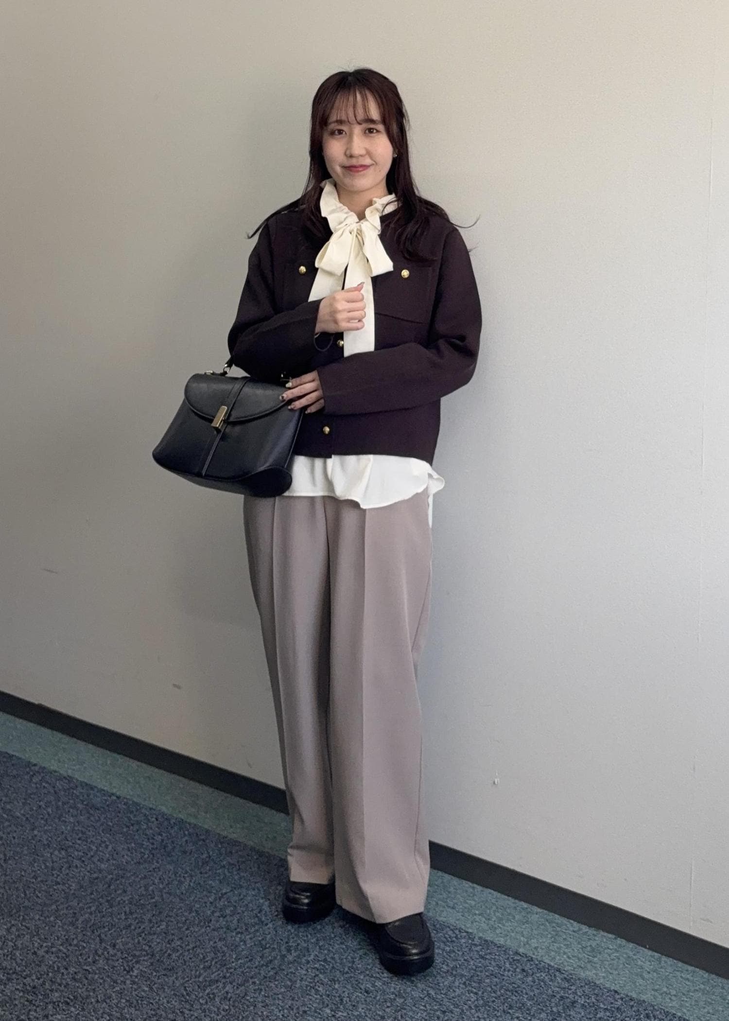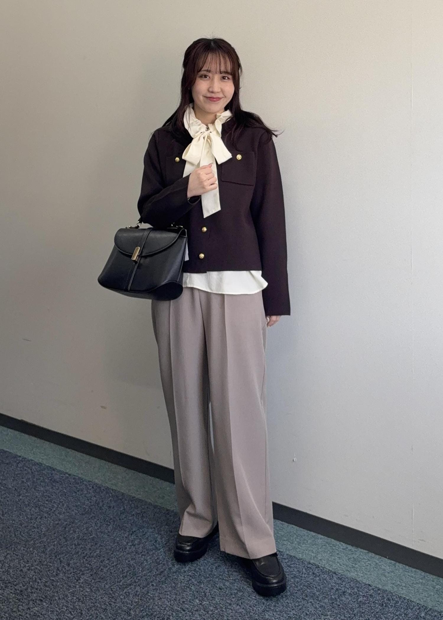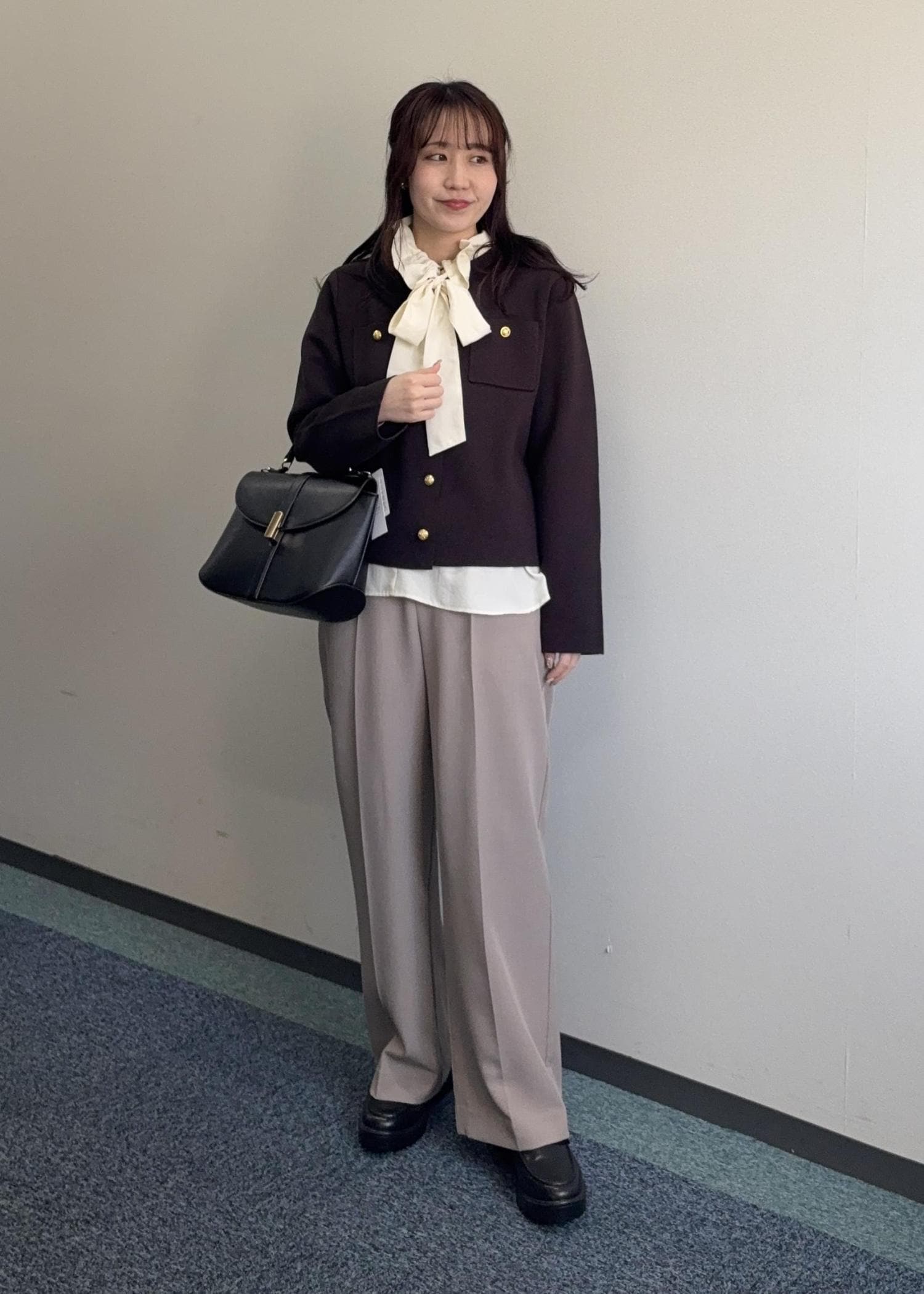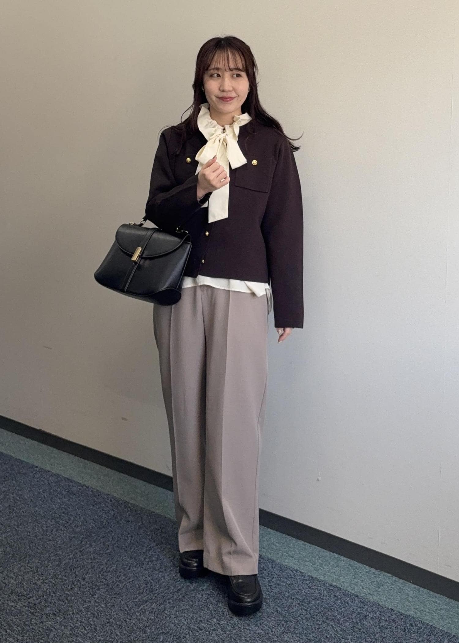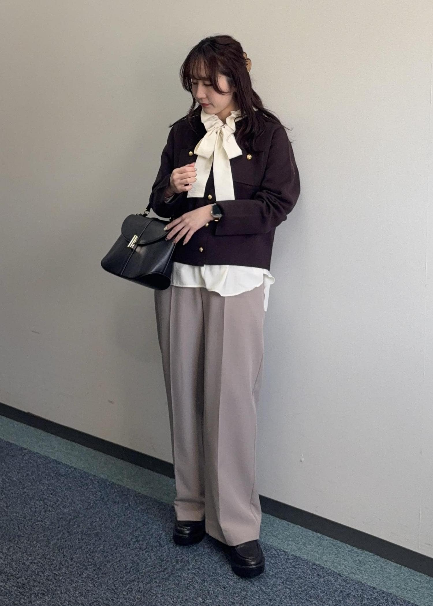 定番のミラノリブカーディガンに、フリルブラウスを合わせた甘めカジュアルコーデ。ブラウスインするだけでいつものコーデが、より華やかな印象になります♪