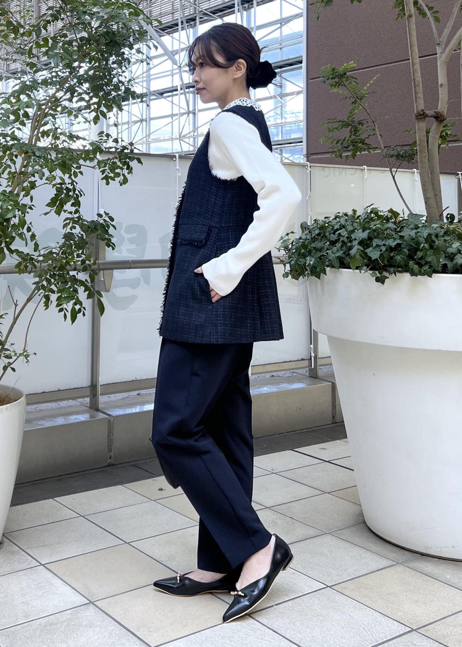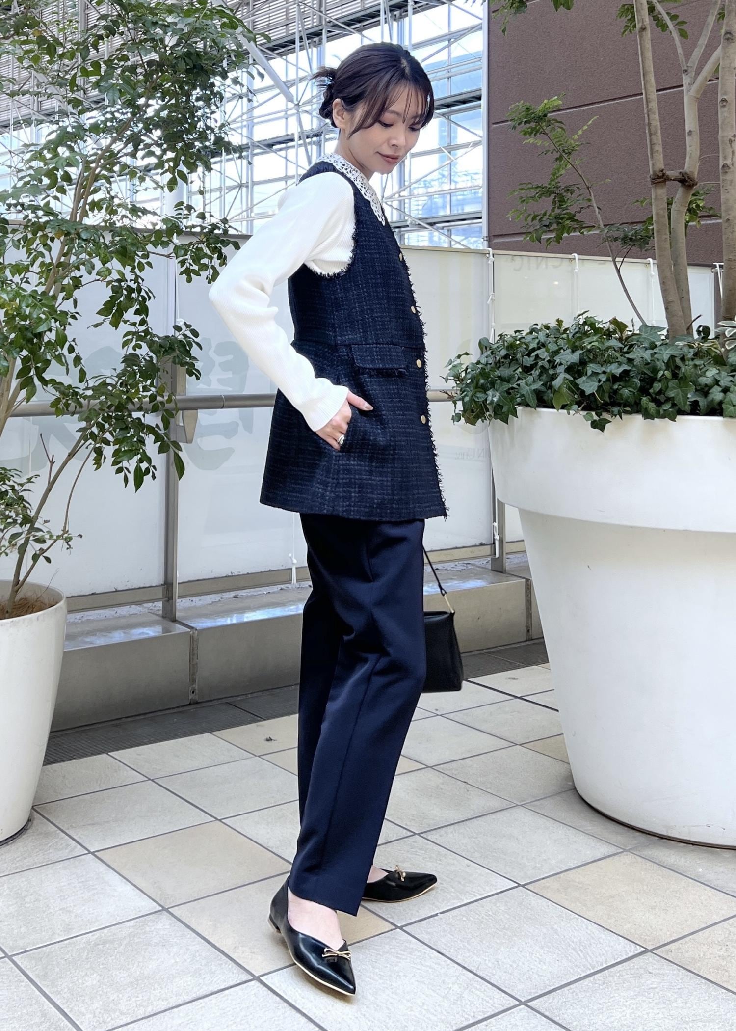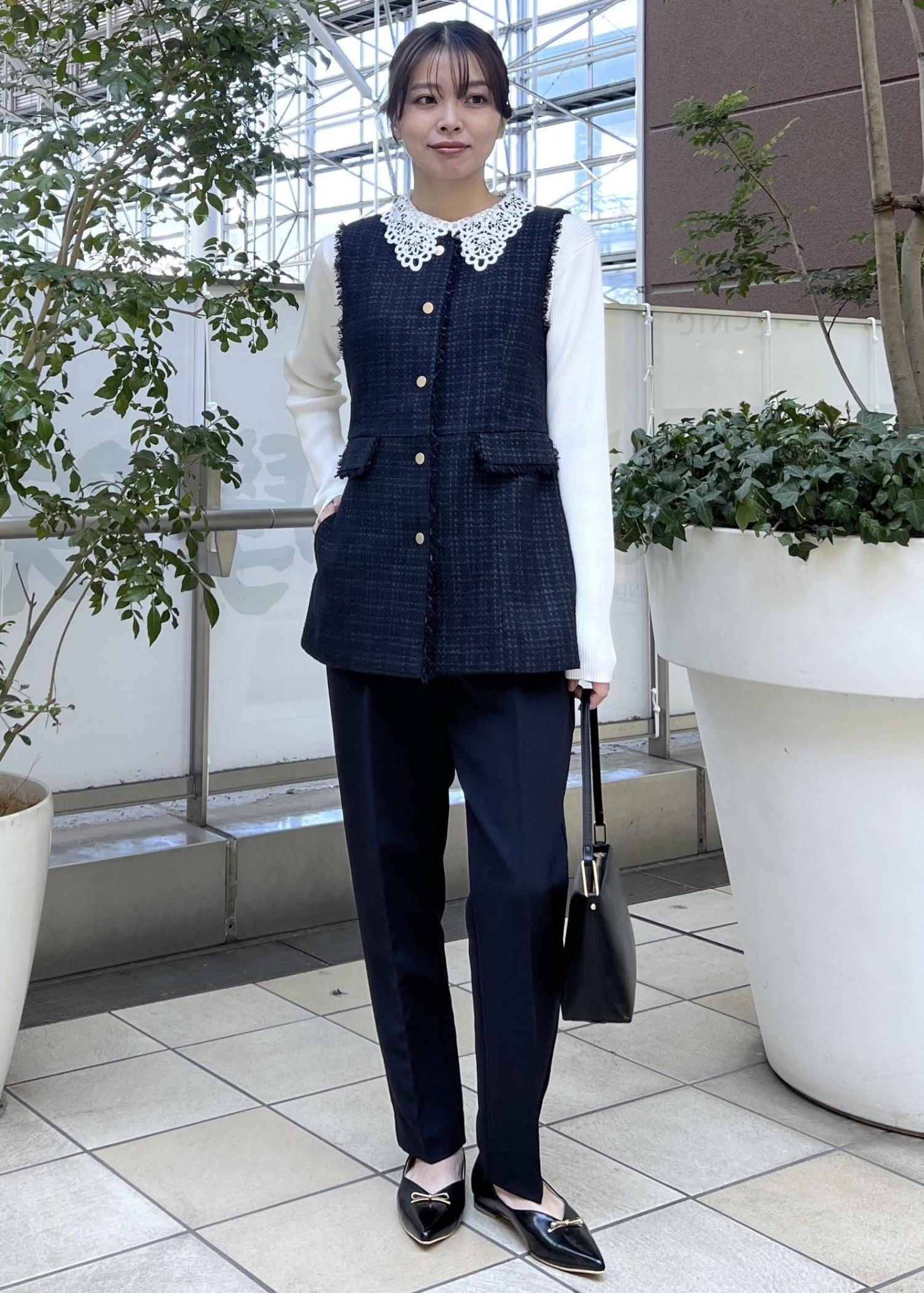 レース襟のトップスをインして、顔周りも華やかにして今年らしいスタイリングにしました。