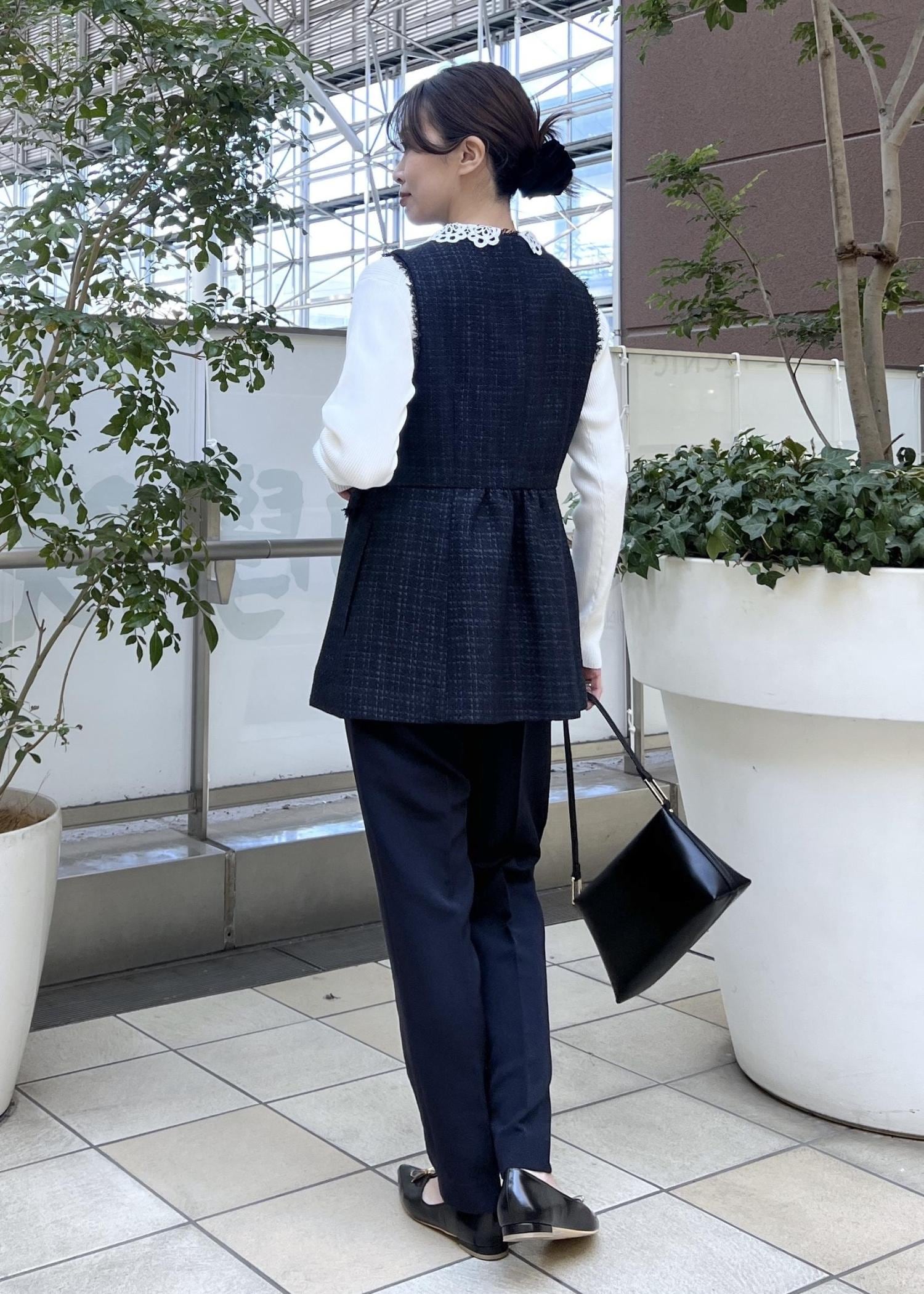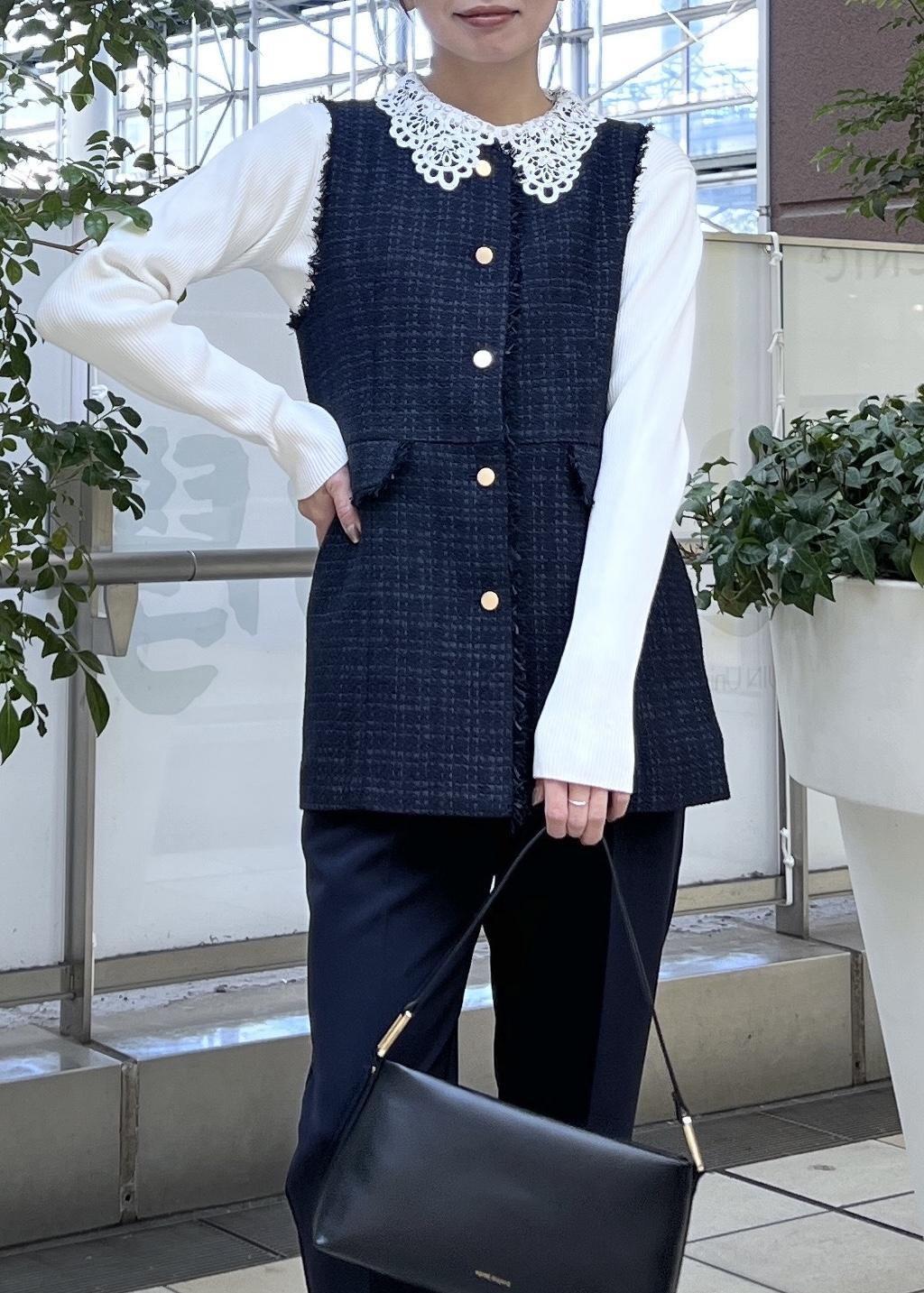 華やかなツイード素材のジレは卒入学式などのセレモニースタイルに。
