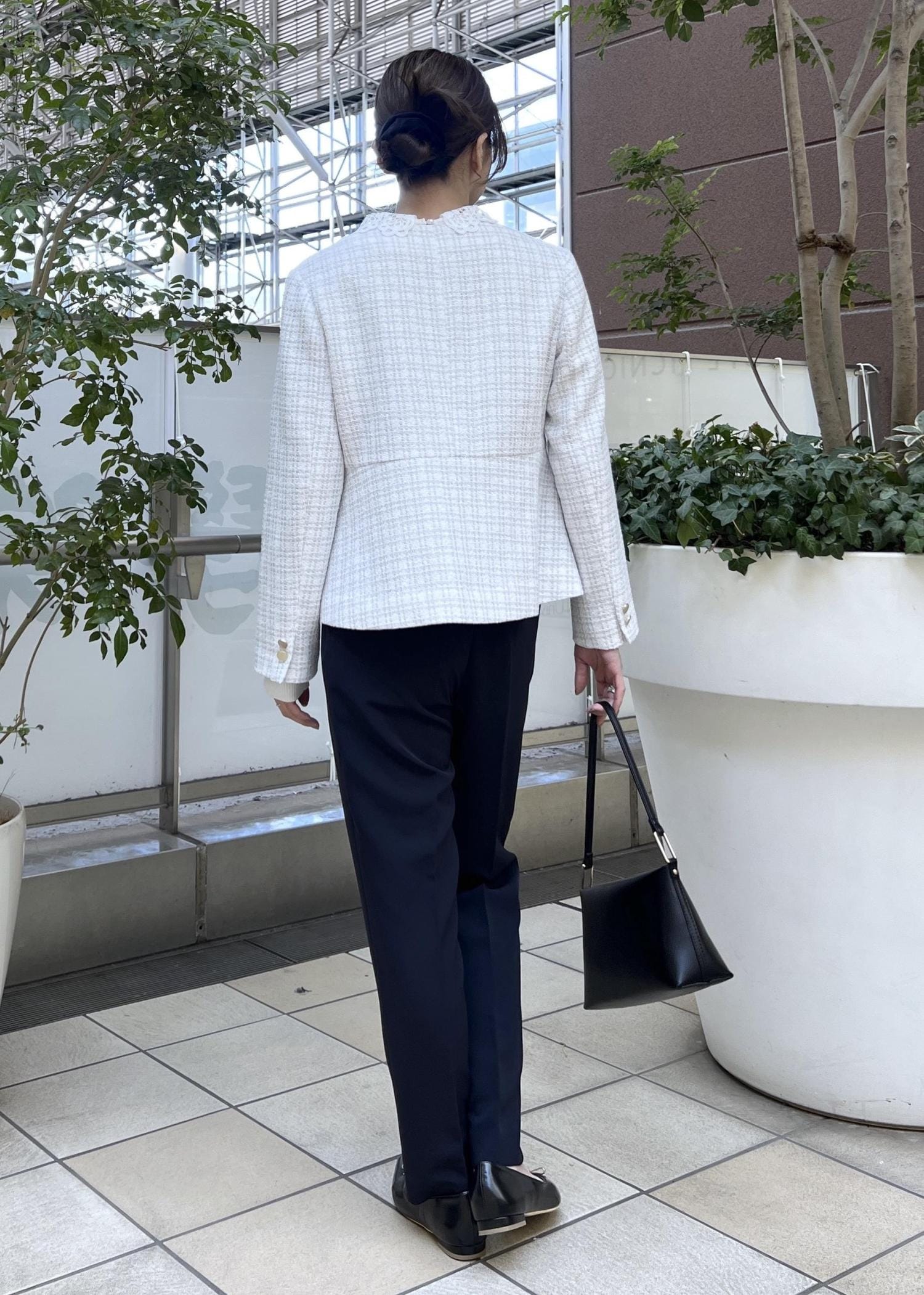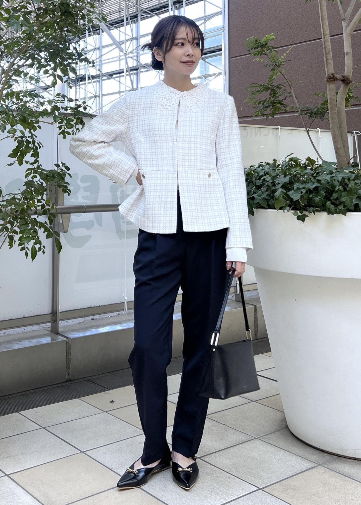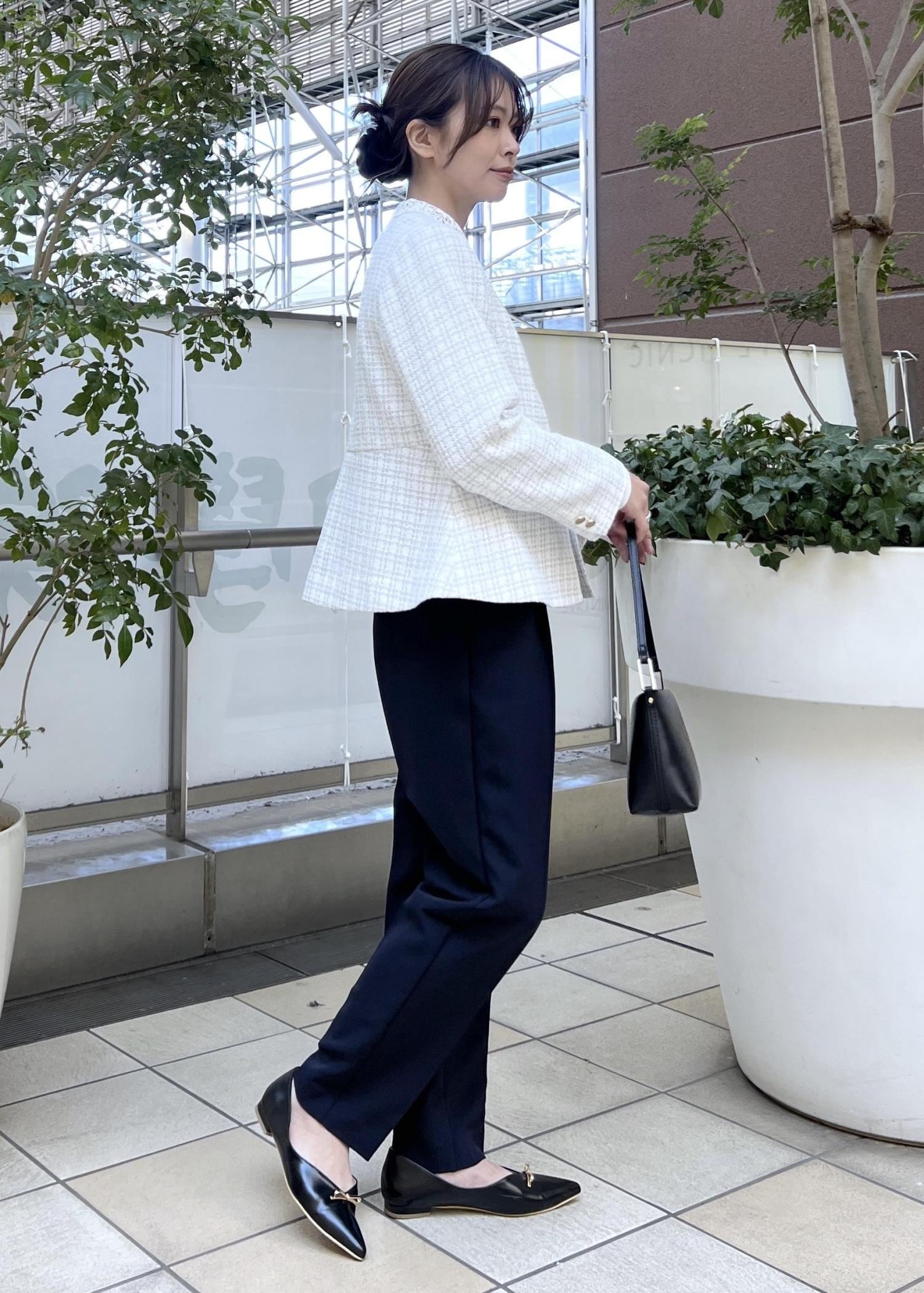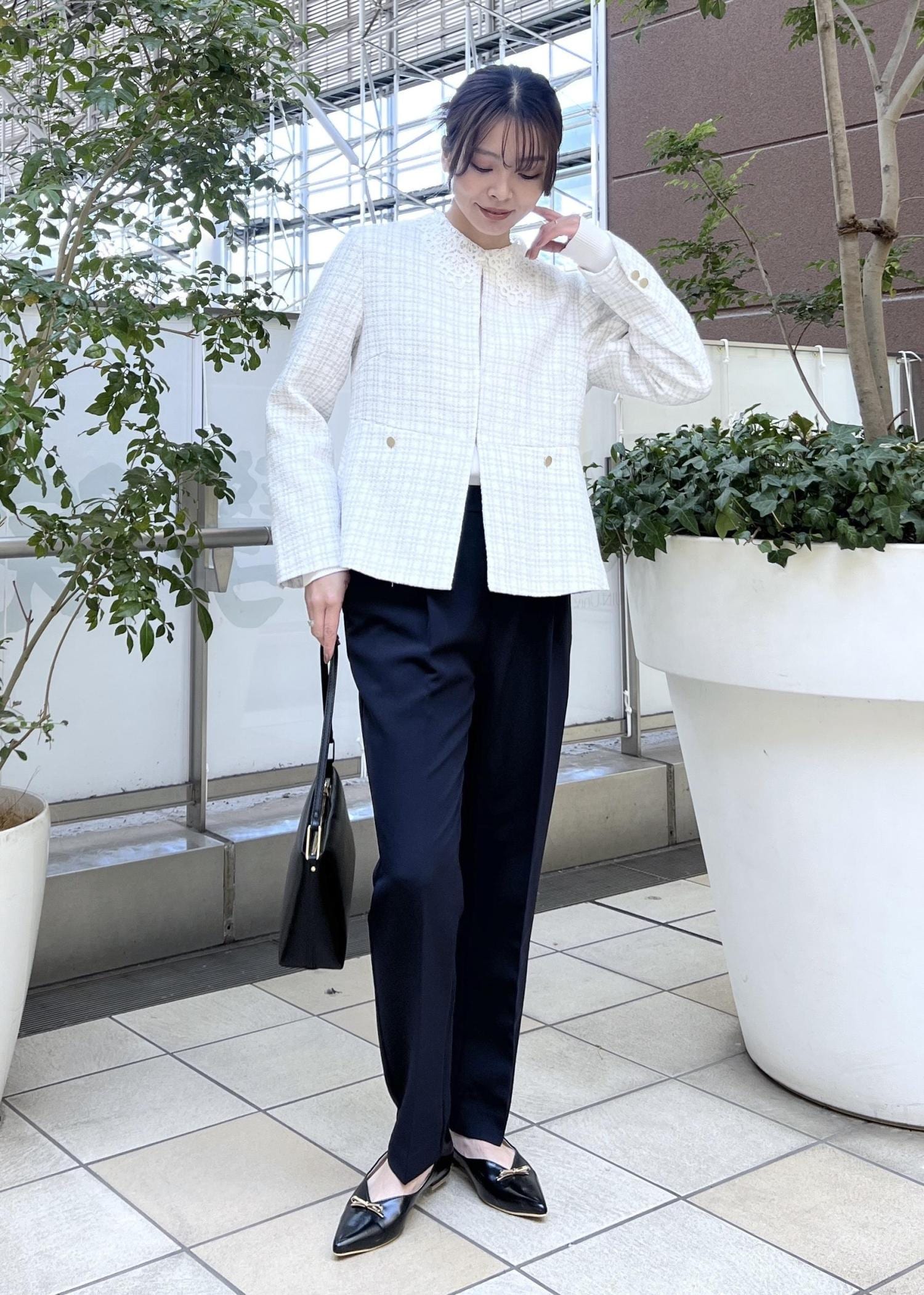明るいライトグレーのツイードジャケットは、テーパードパンツ合わせですっきり感のあるスタイリングに。