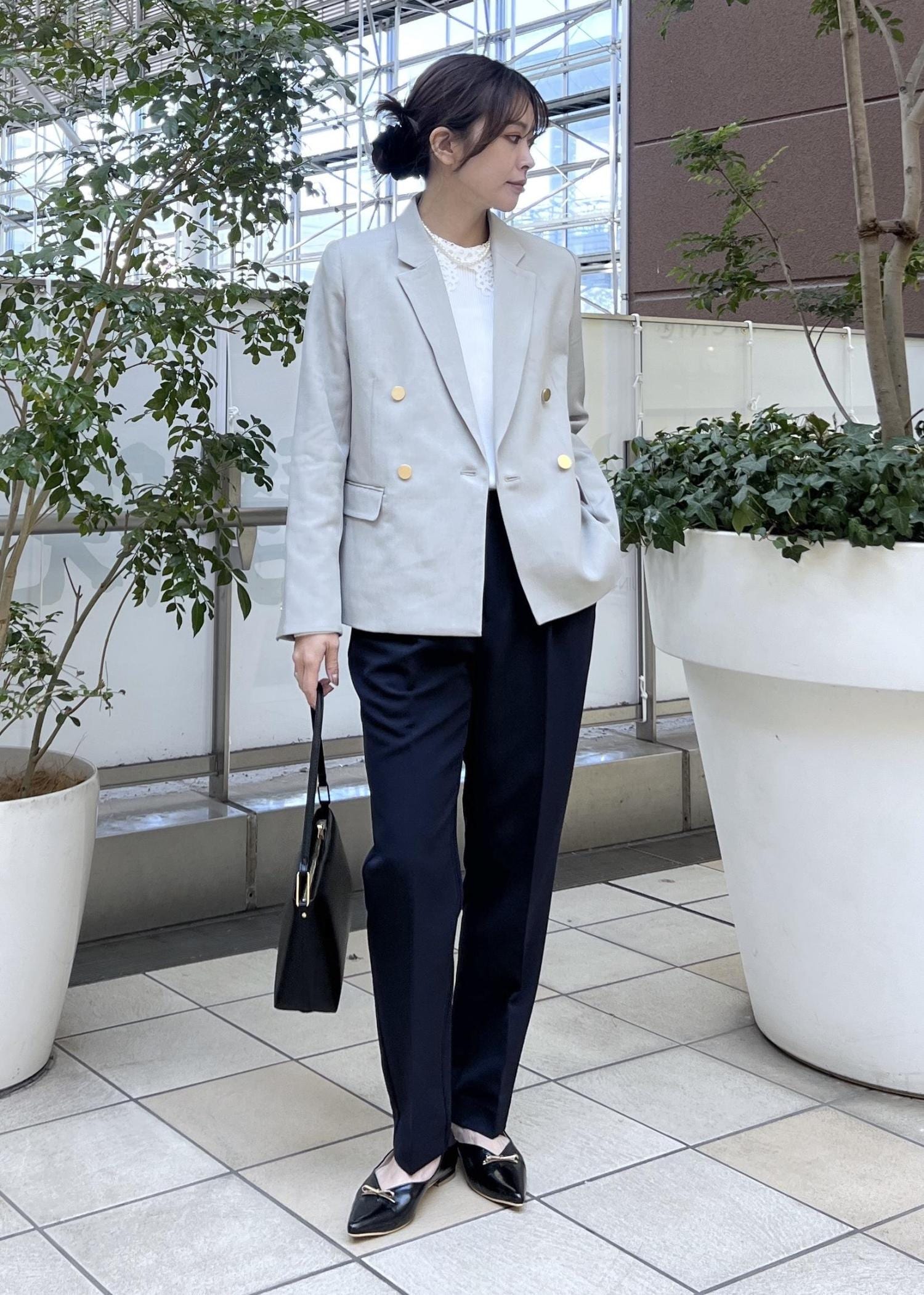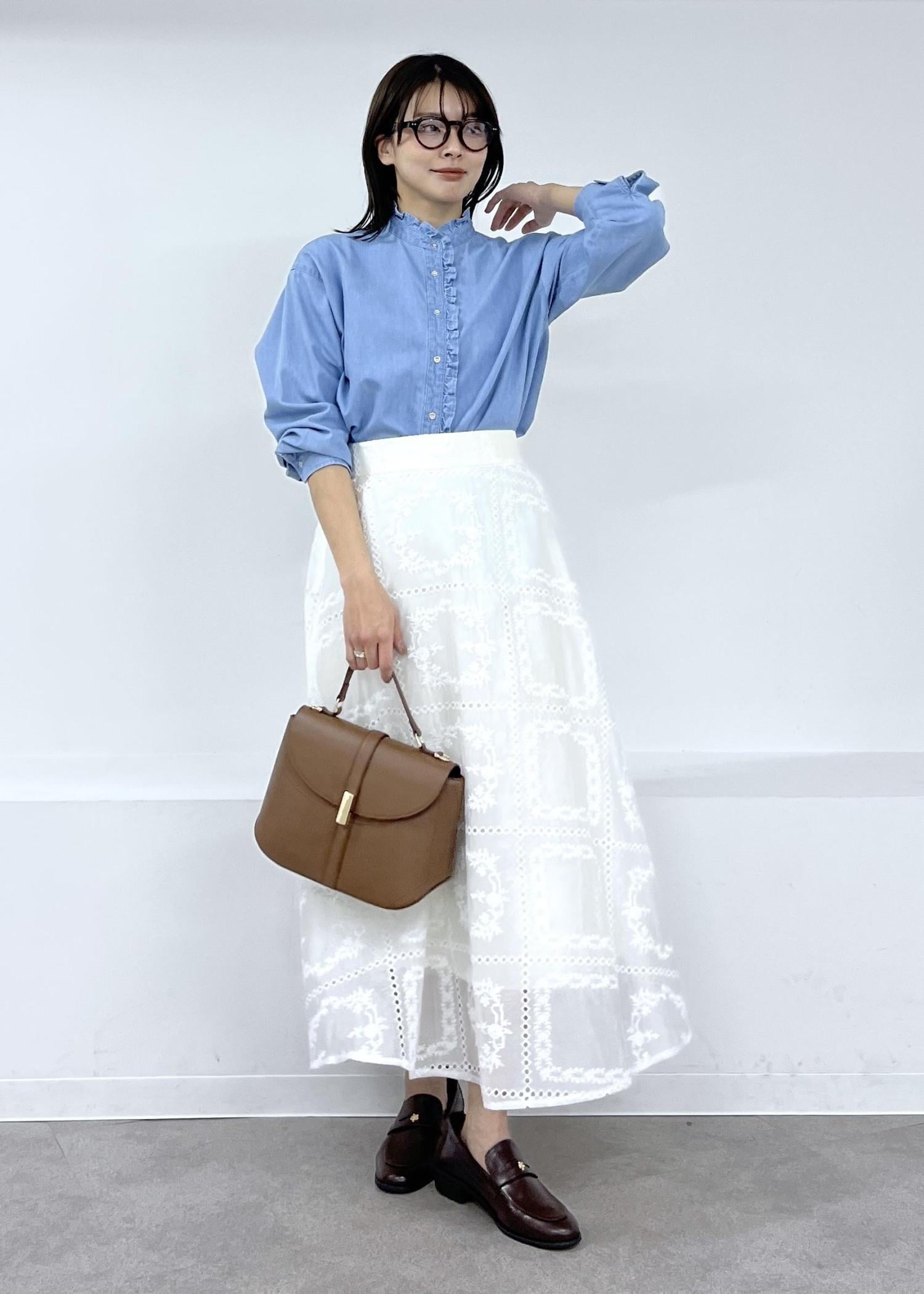 レース襟のトップスをインして華やかさをプラスして、入学式などセレモニーにも着られるコーデにしました。