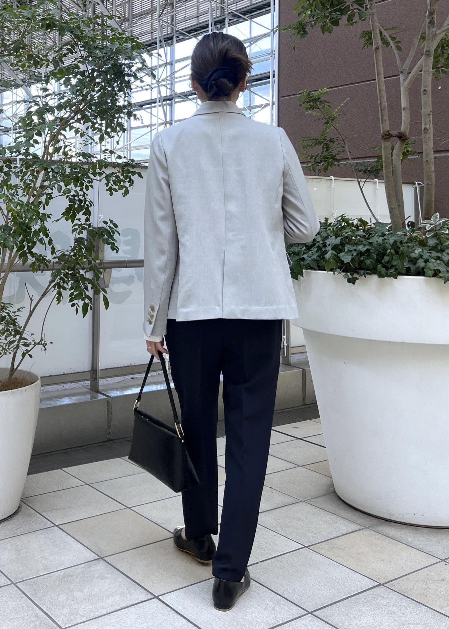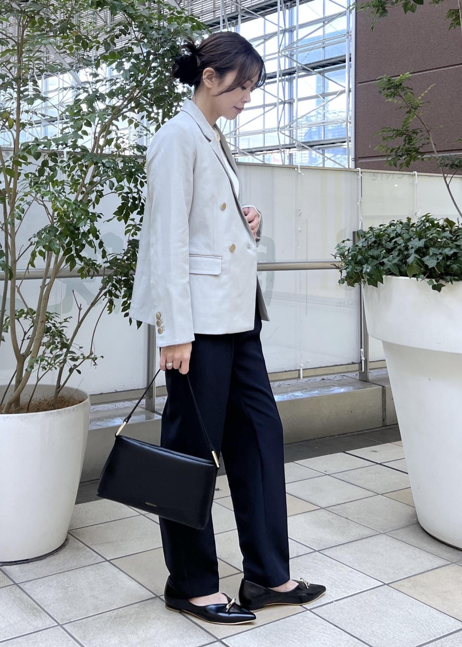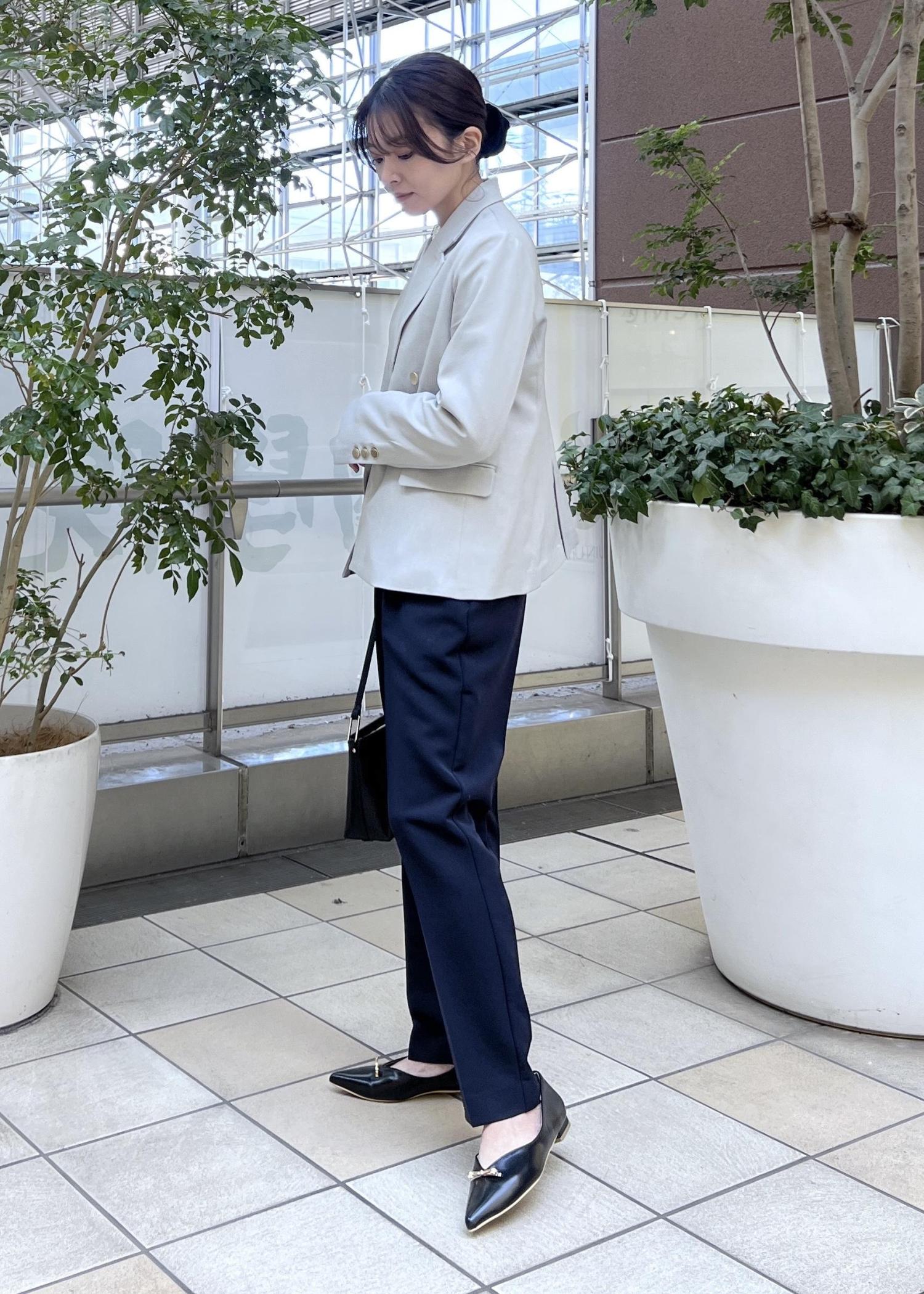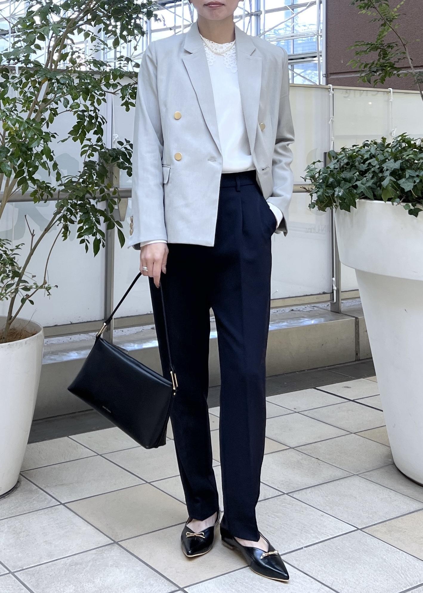 テーパードパンツですっきり感のあるスタイリングで、スマートなきれいめスタイルです。