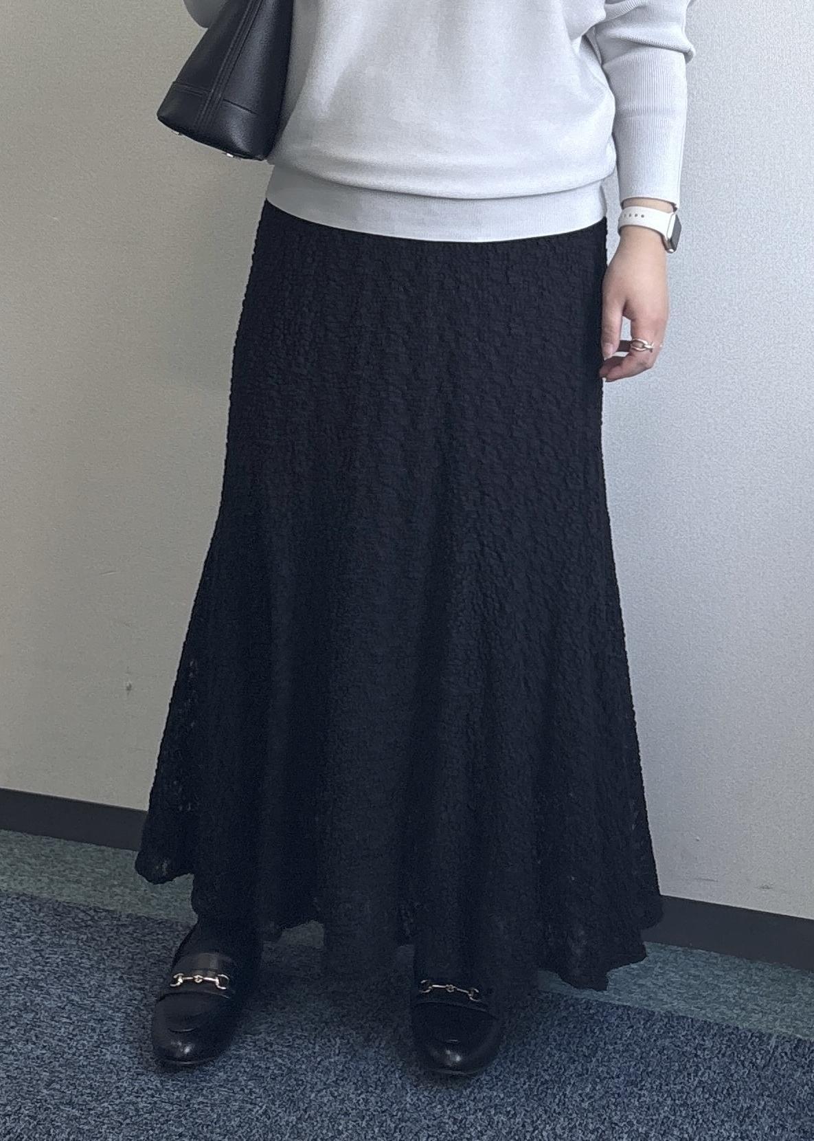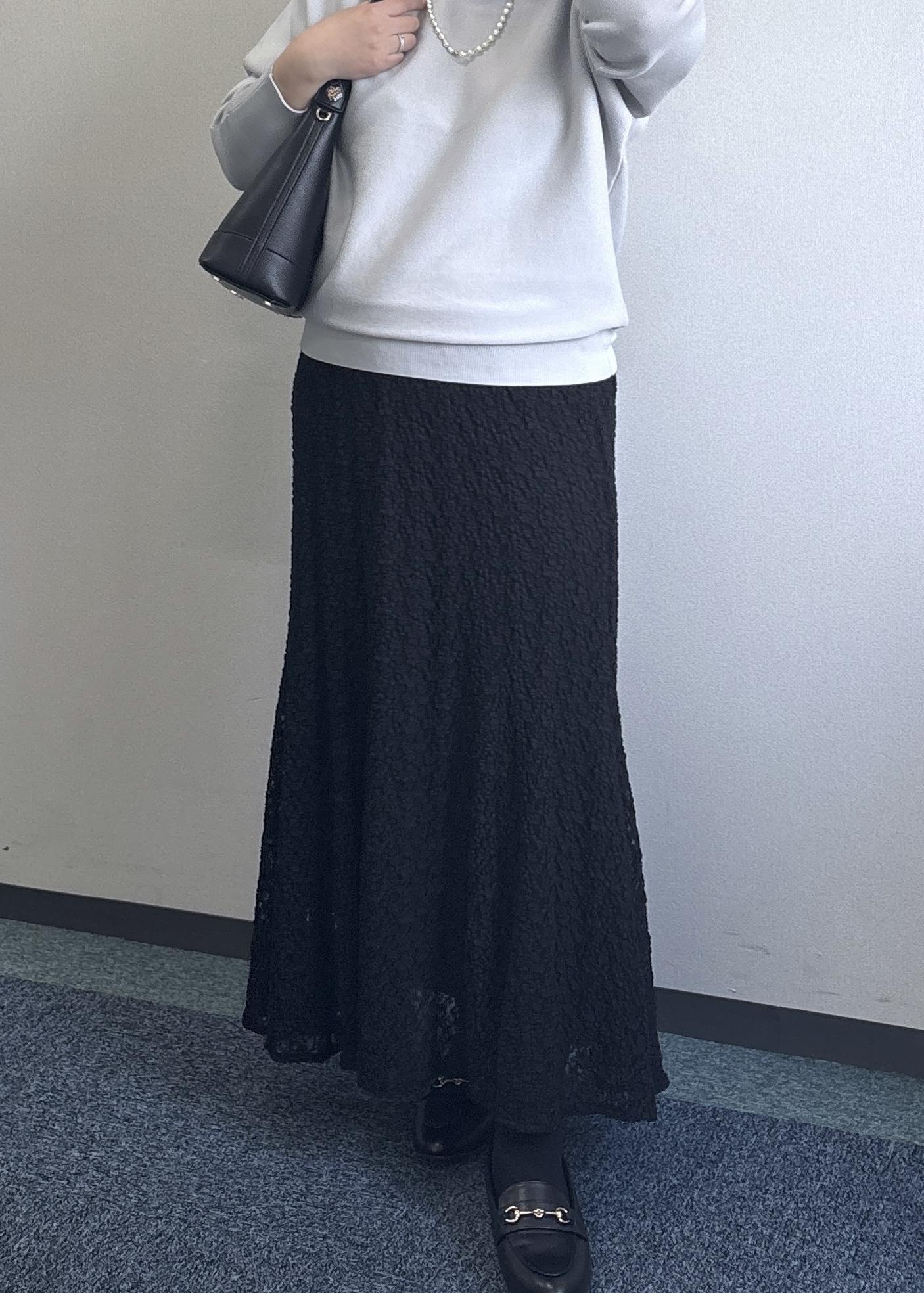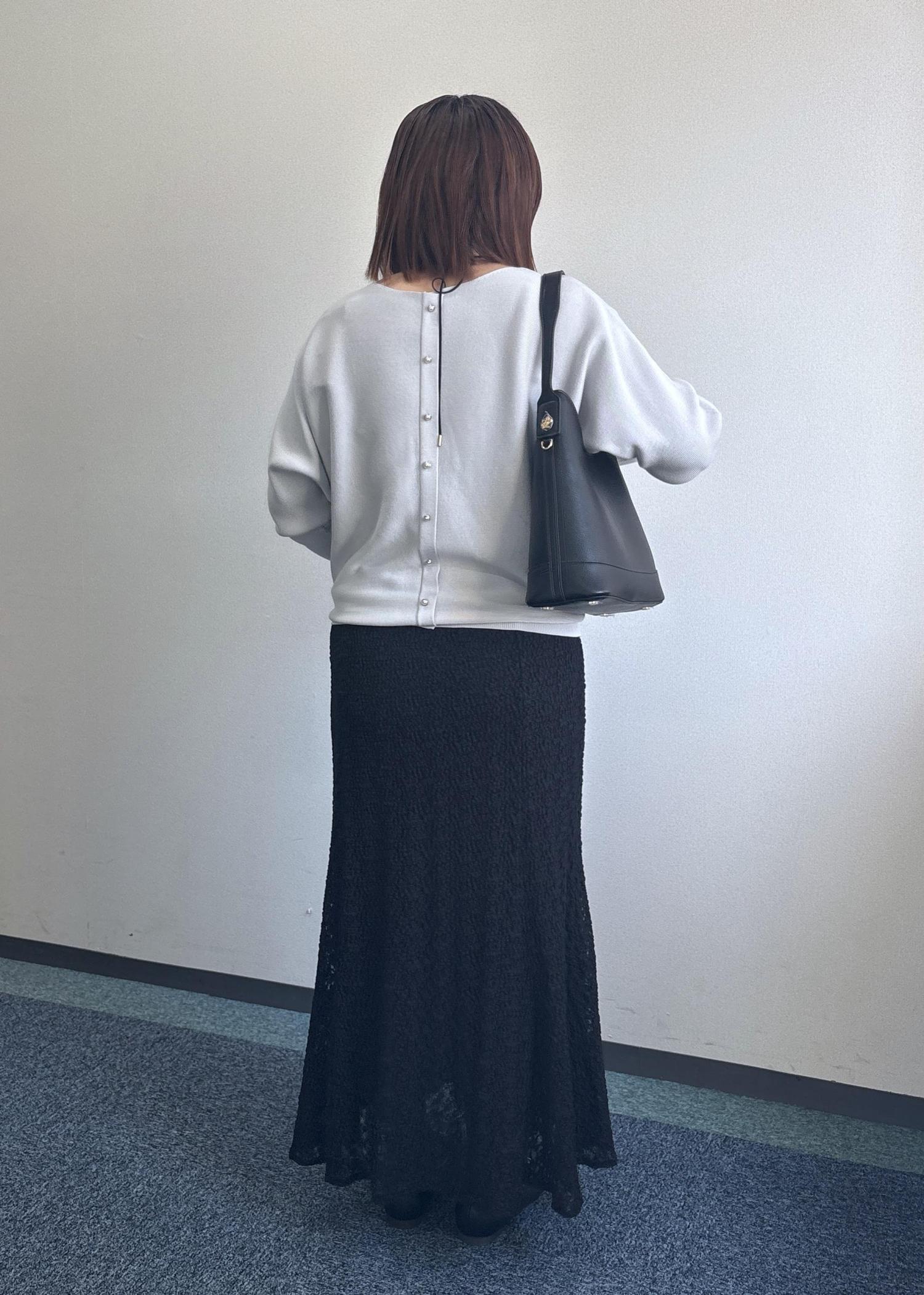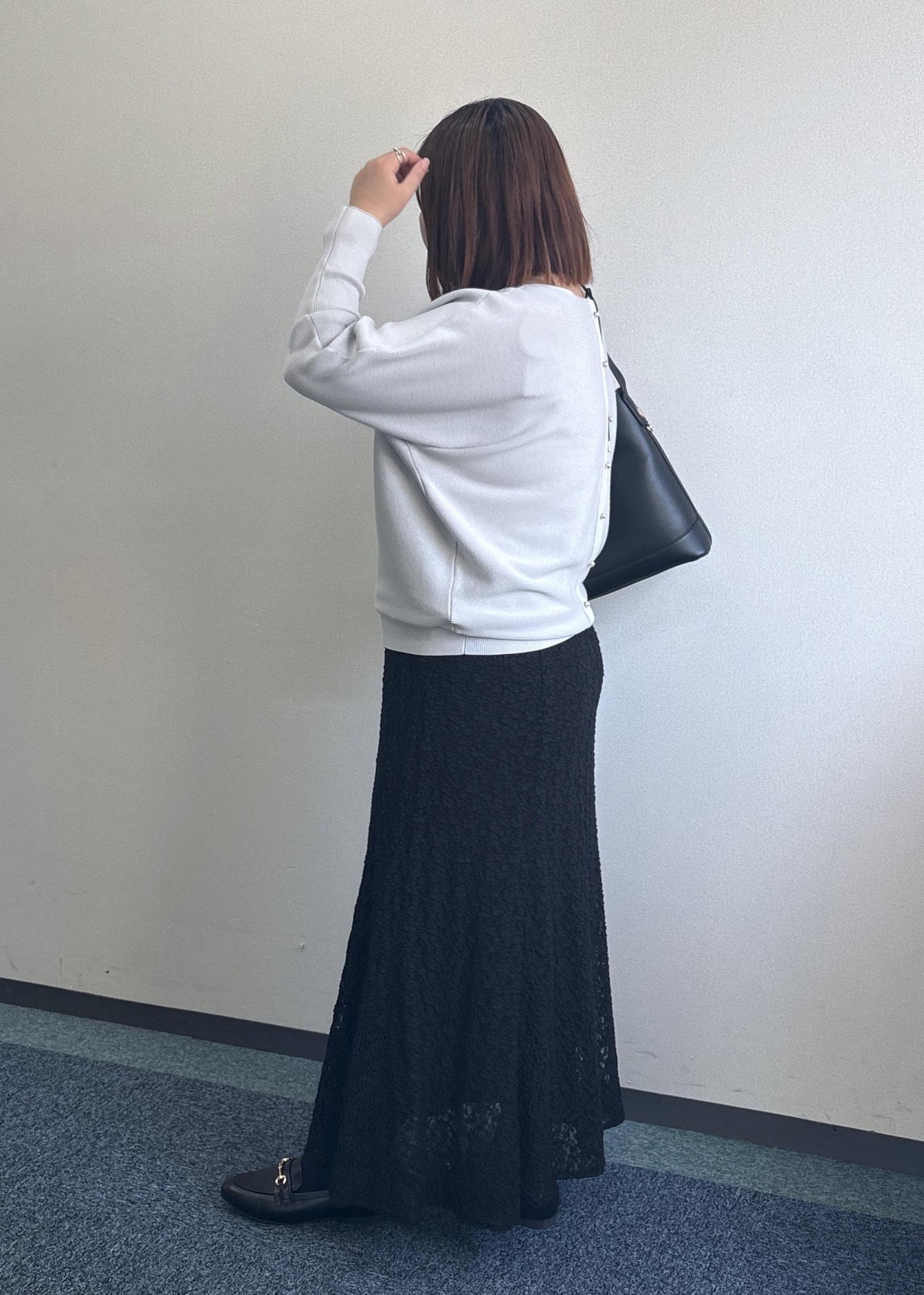 バックスタイルがポイントのドルマンスリーブニットにレースマーメイドスカートを合わせた女性らしいスタイリングです。