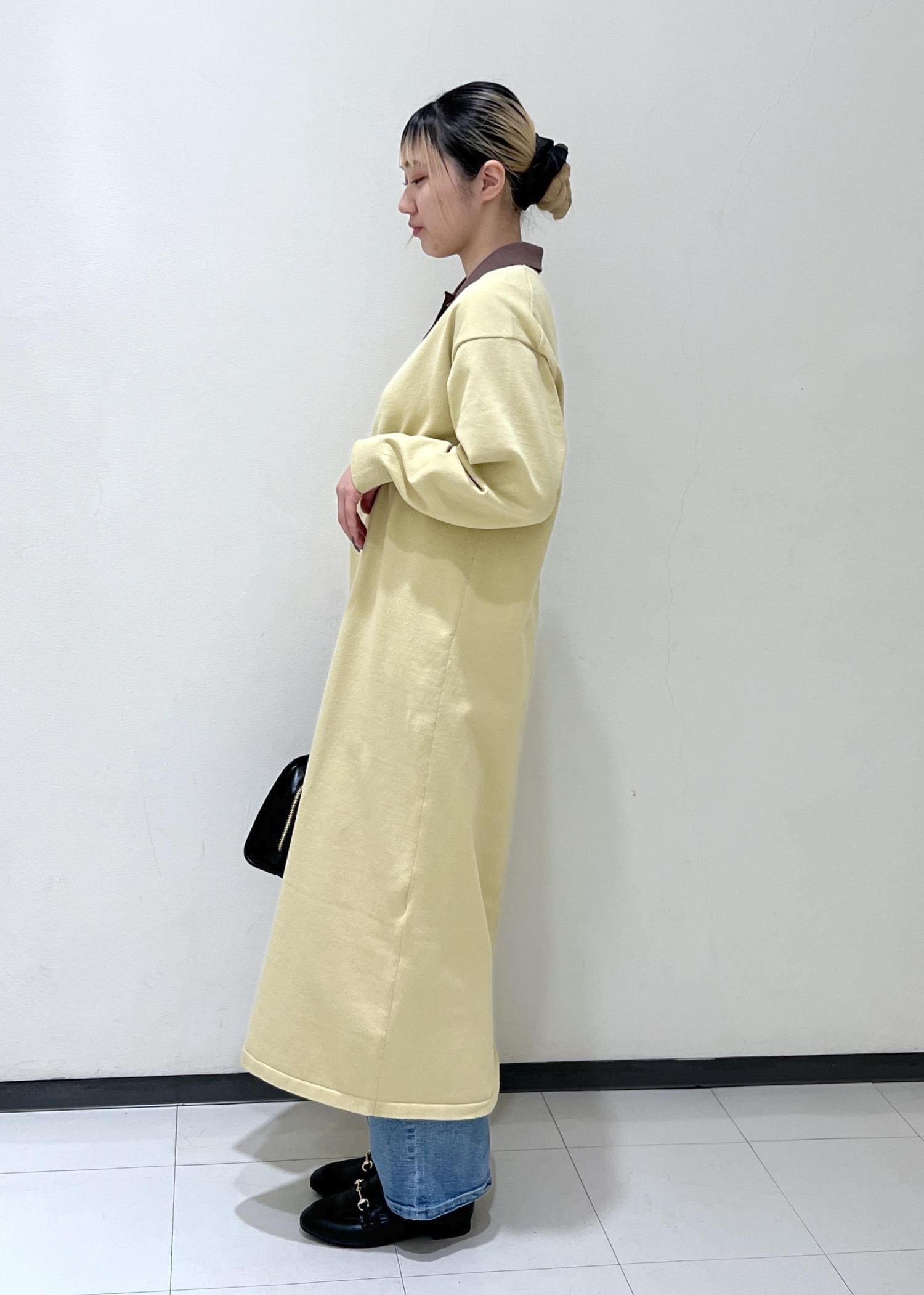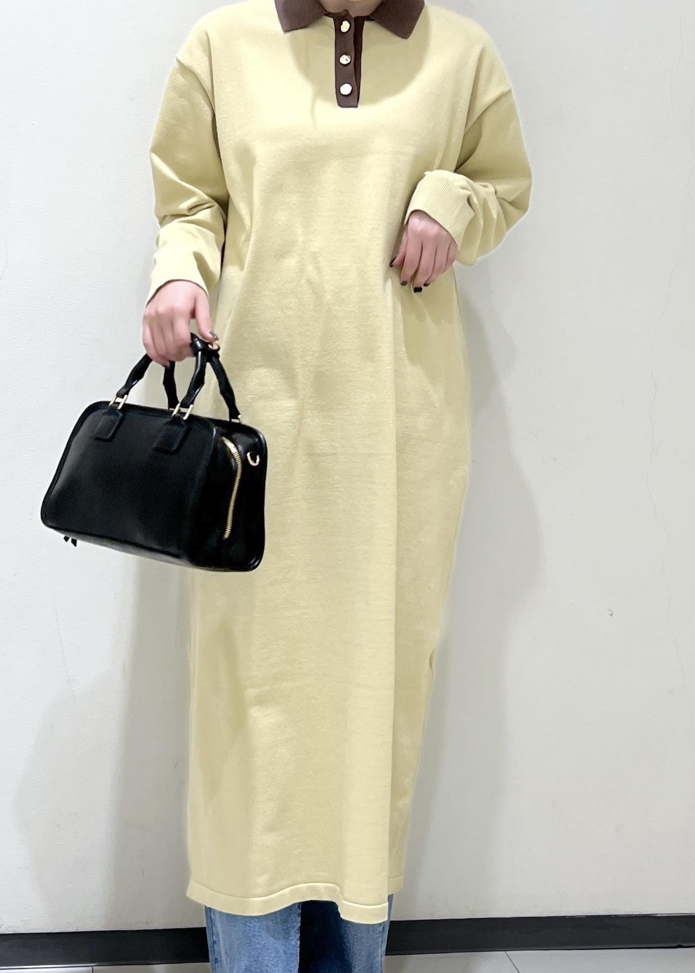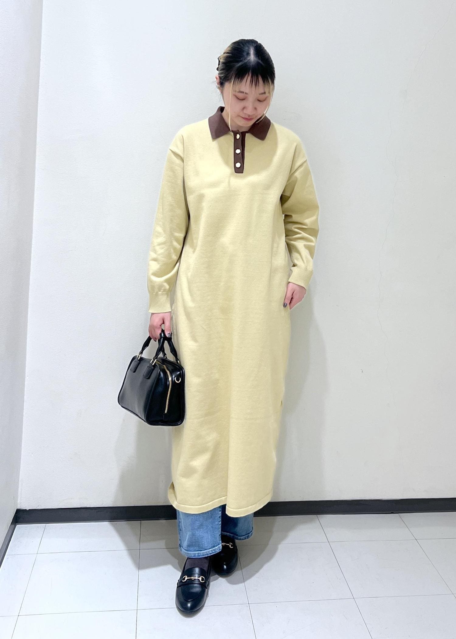 配色が春らしいイエローのスキッパーニットワンピにデニムを合わせてきれいめカジュアルなスタイリングにしました◎