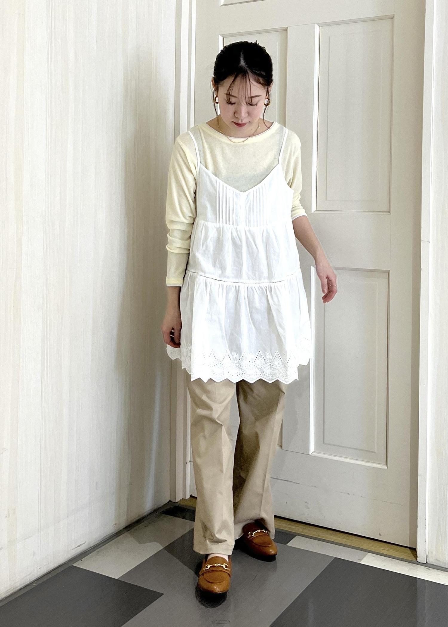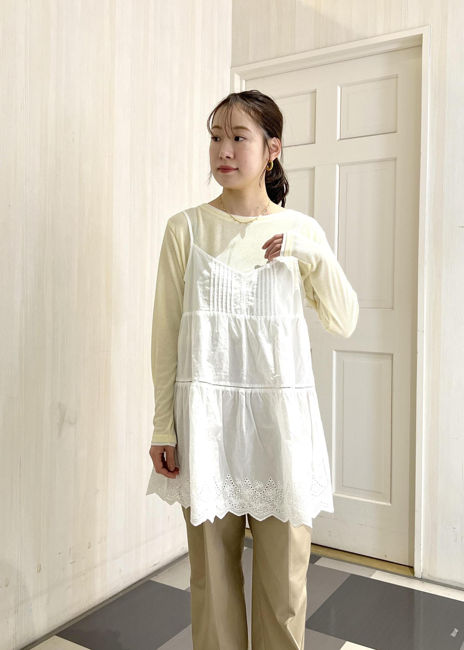 ROPÉ PICNICレイヤード風シアーロングスリーブTシャツクリーム系 / F¥3,498レビュー薄手のカットソーです。リブ編みなので透け感も程よく、一枚で着るのもおすすめ。